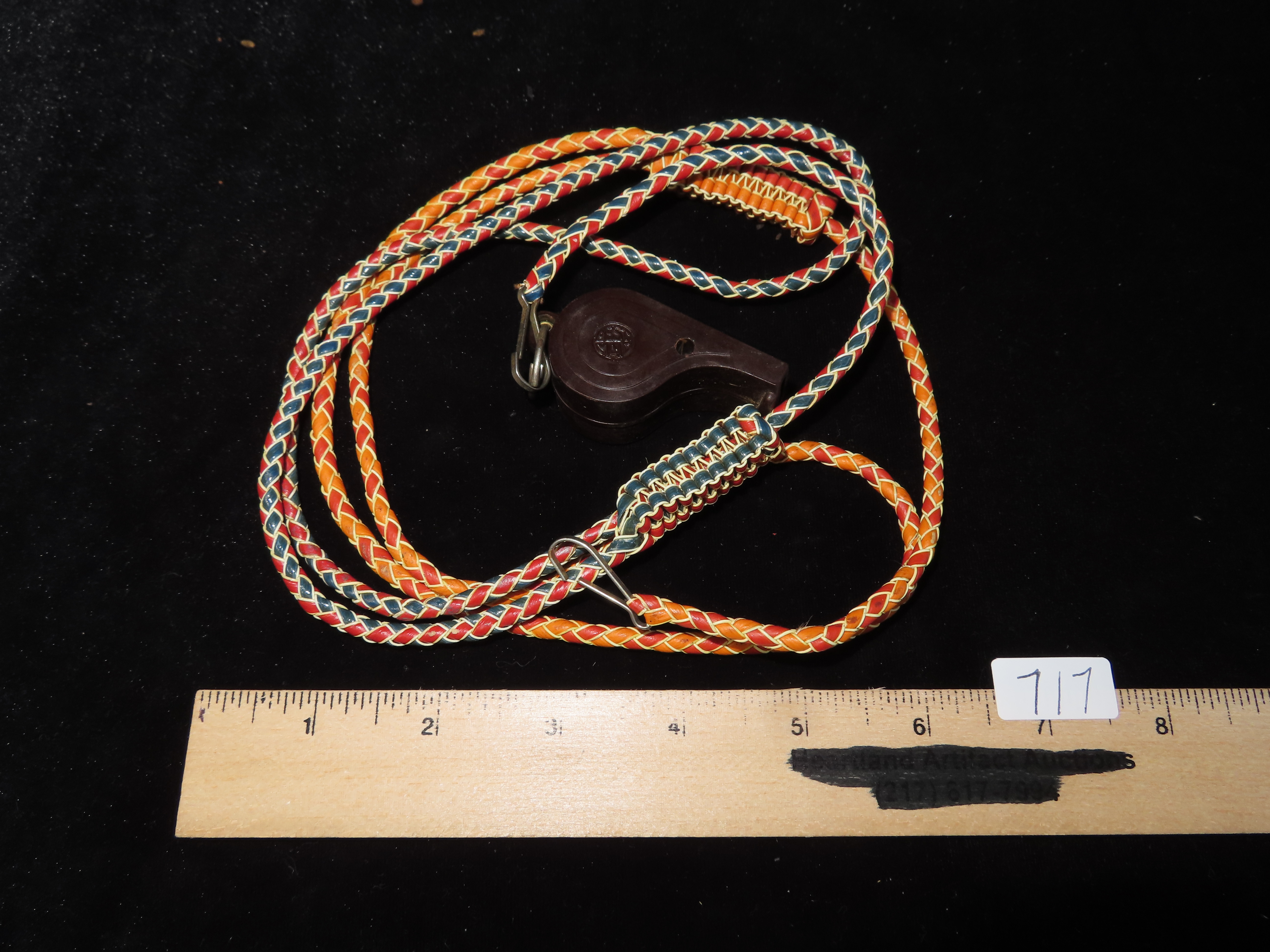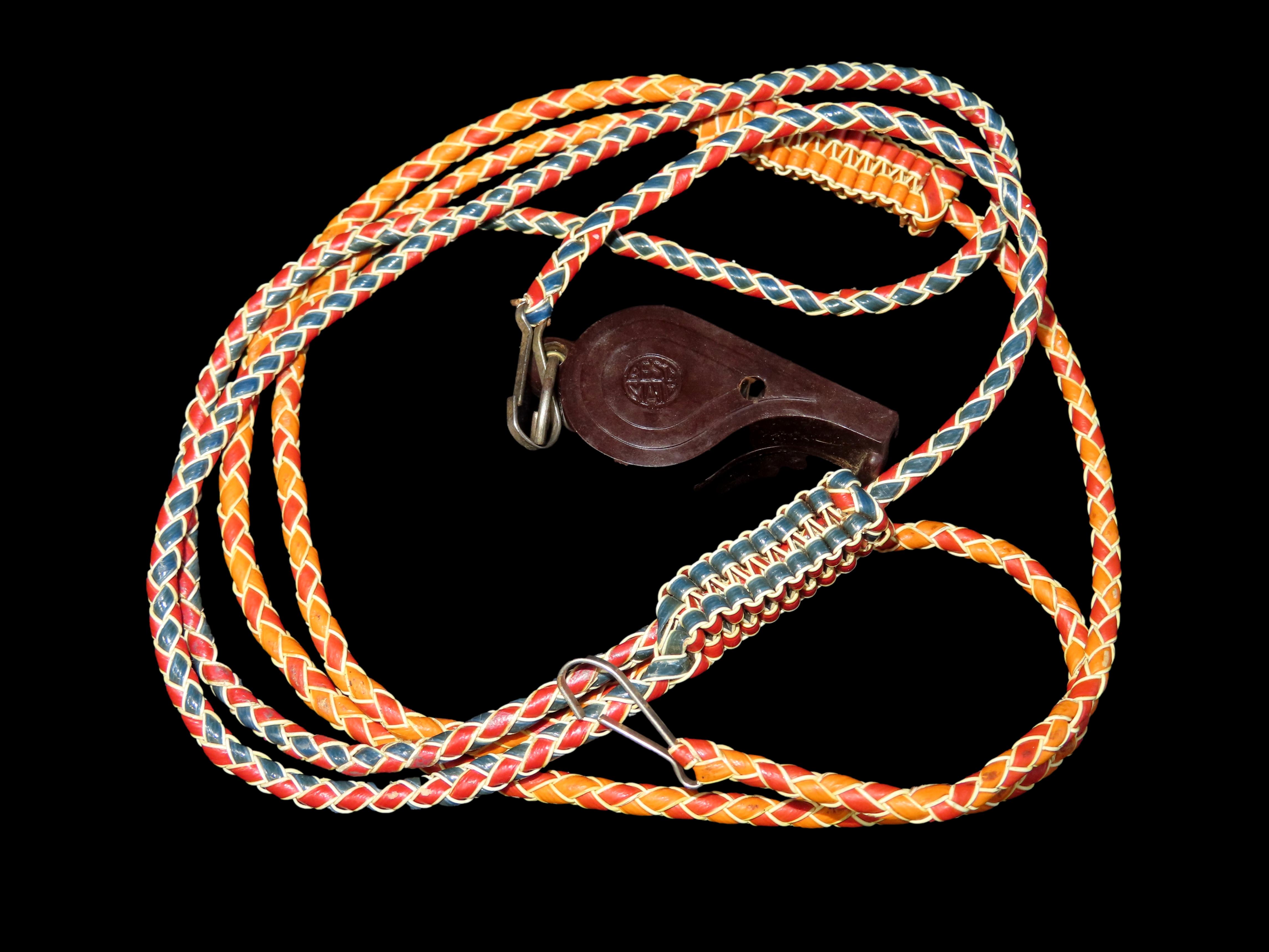 Lot of 2 Vintage Braided Leather Lanyards, one orange and red, one red and blue w/whistle