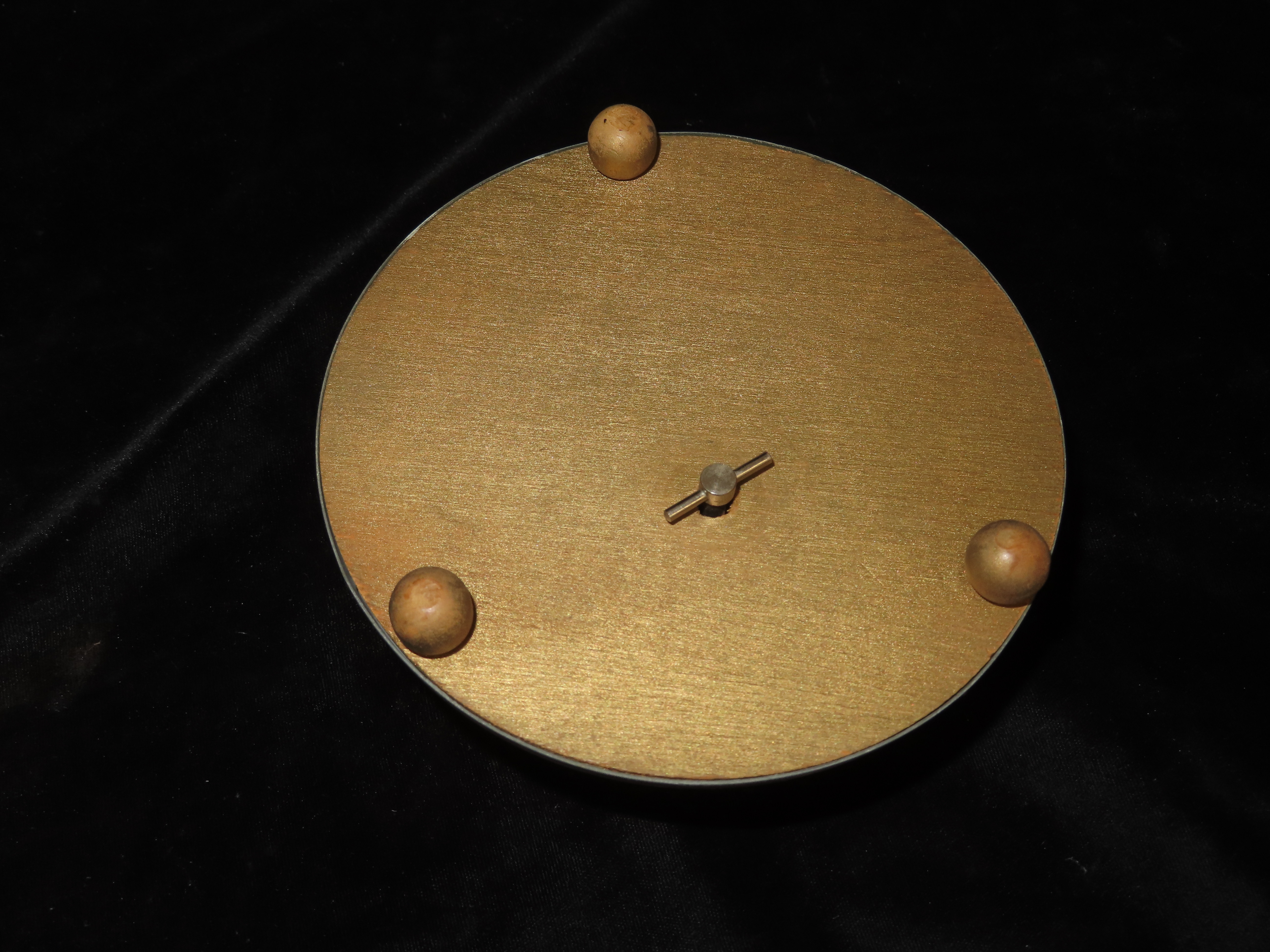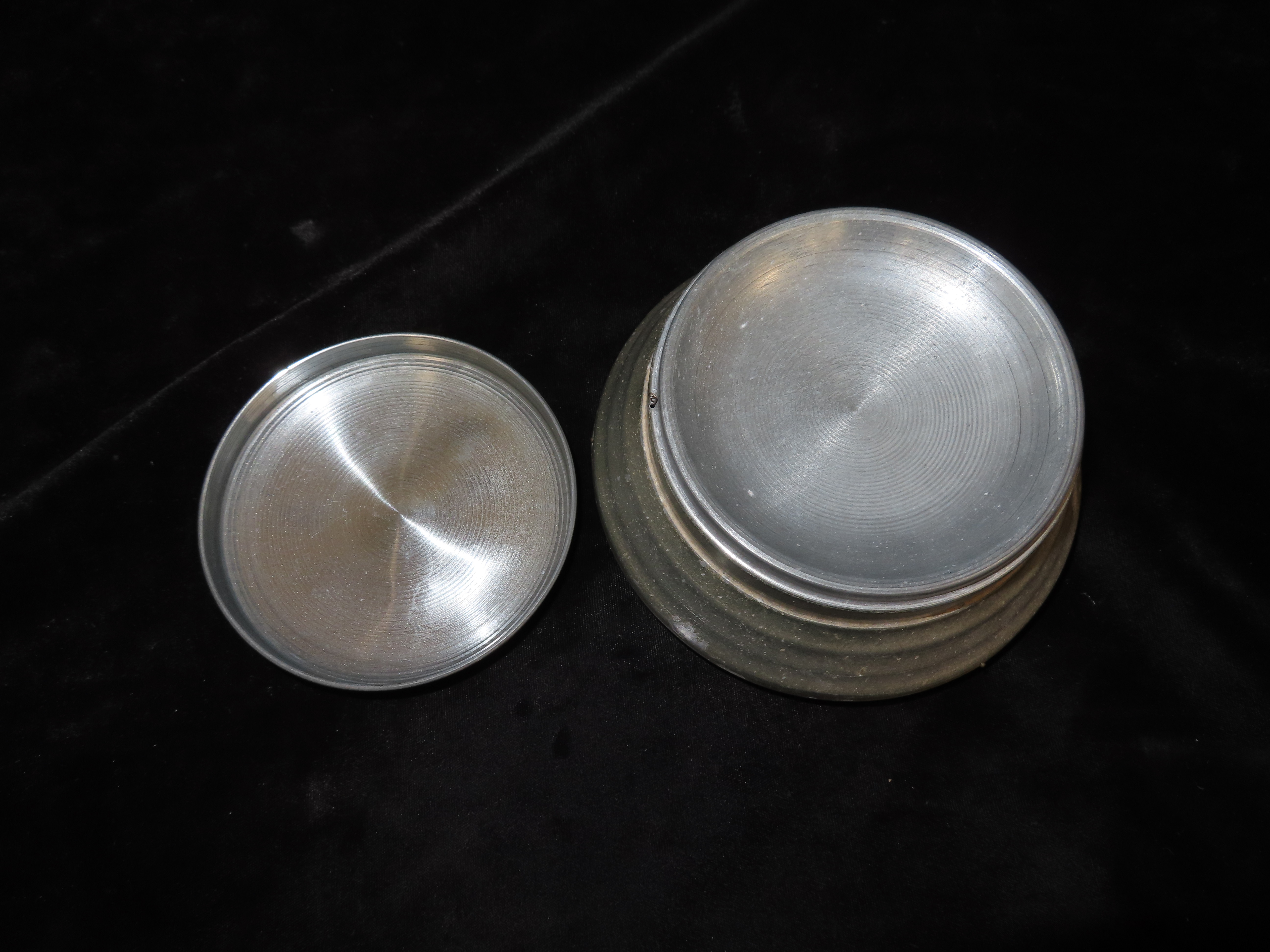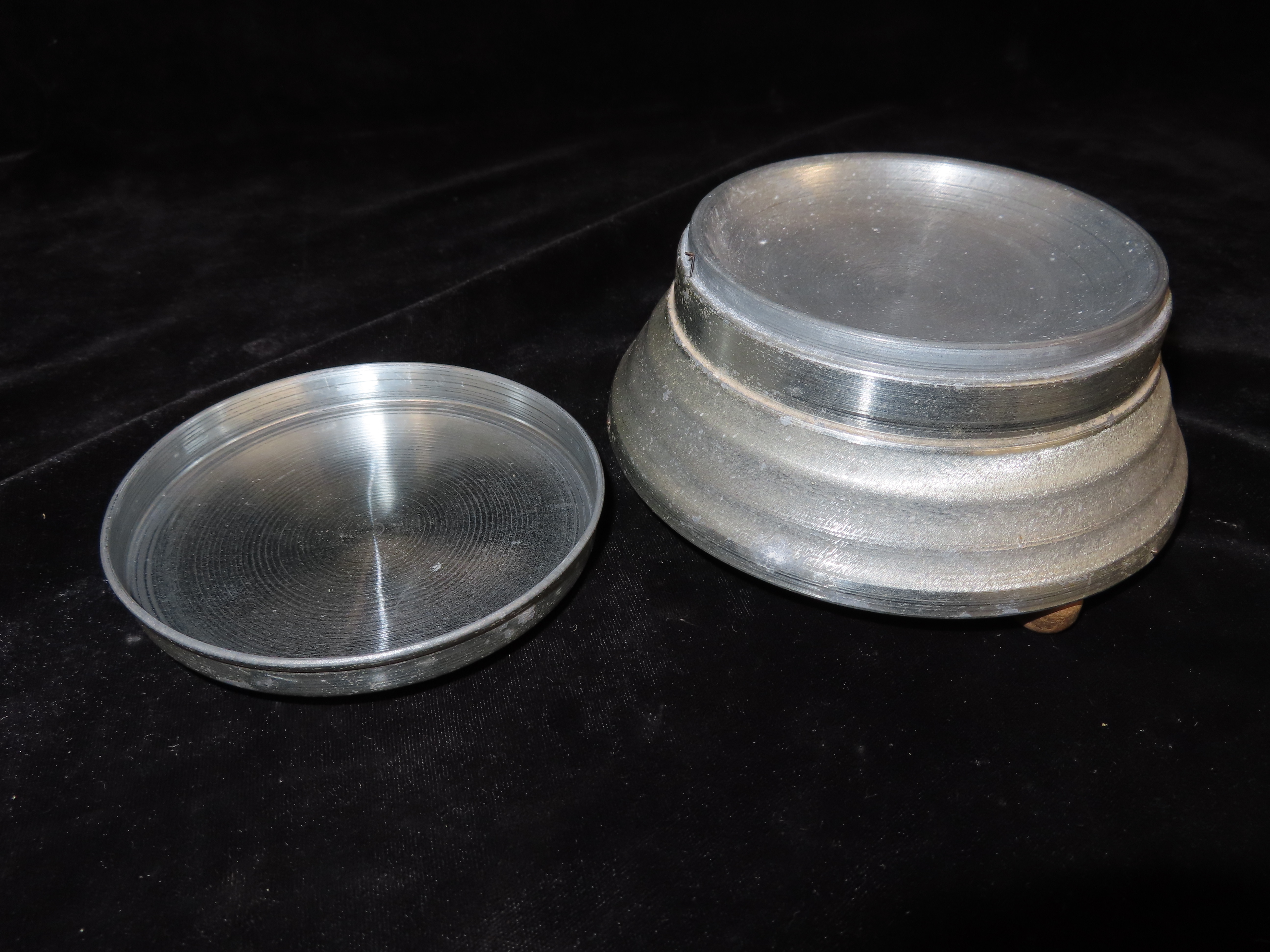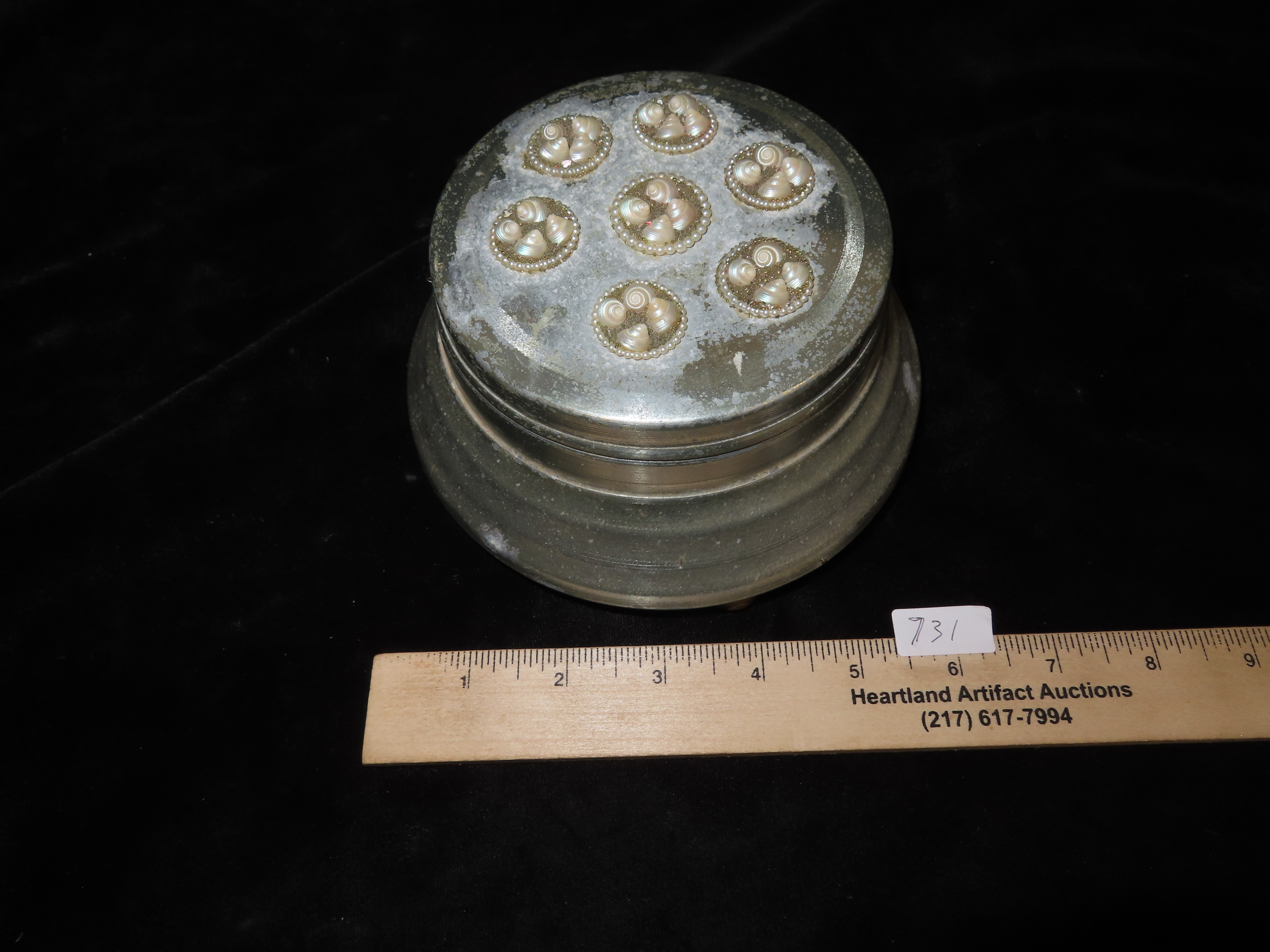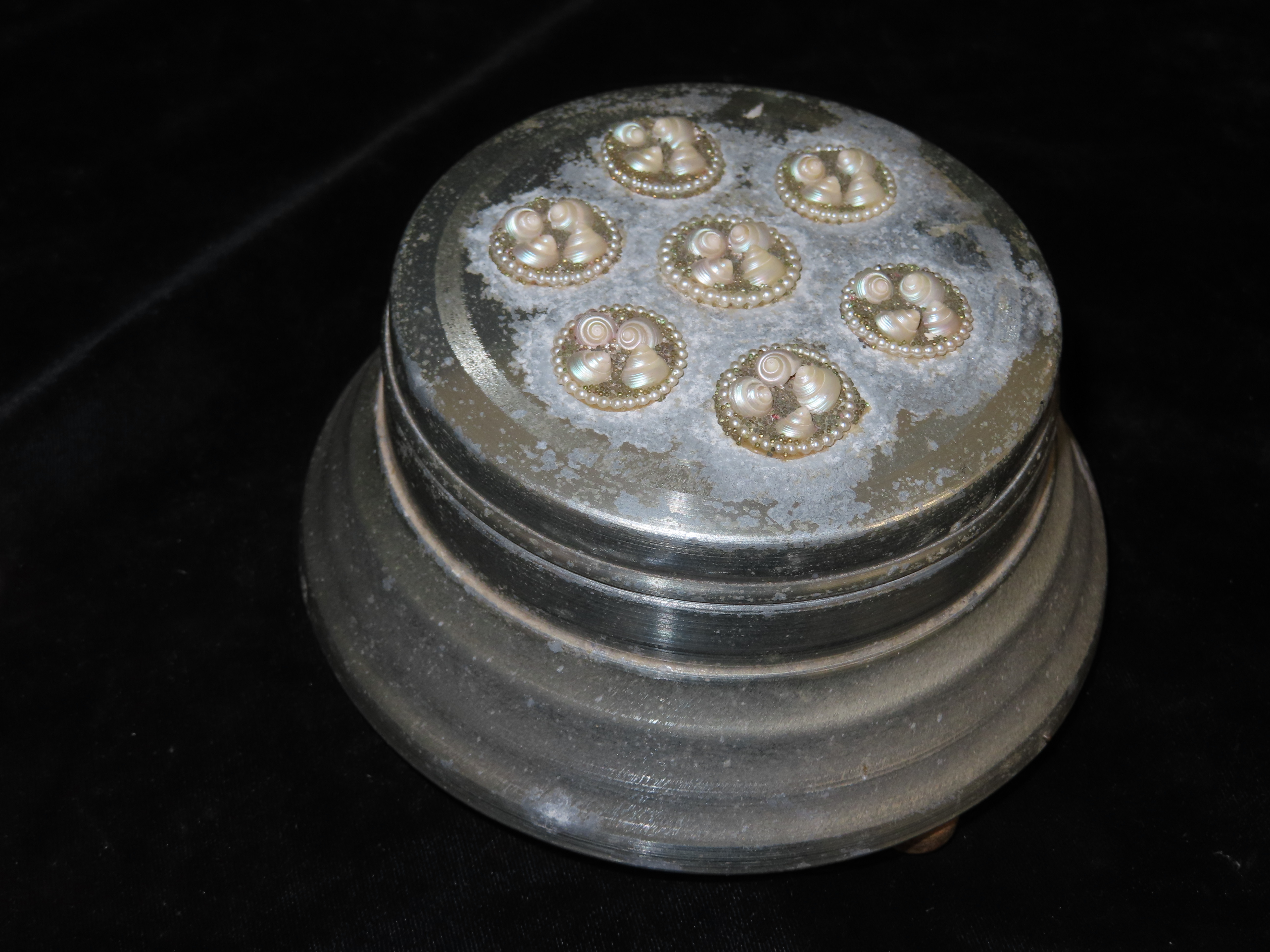 1920’s Key Wind Musical Powder Box, aluminum with seed pearl and shell ornamentation on the lid