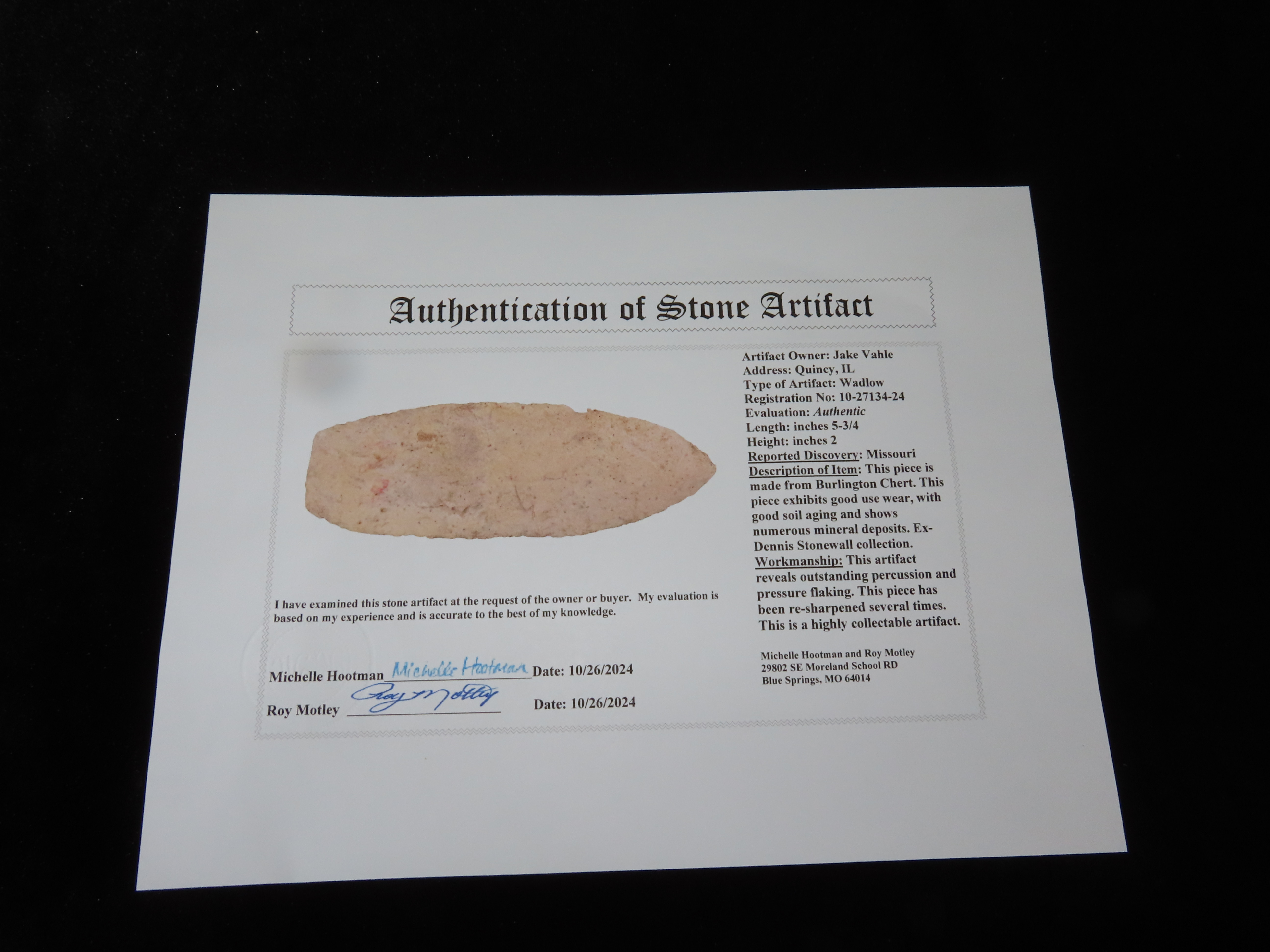 5 3/4″ Wadlow, Motley COA, EX Dennis Stonewall, Missouri