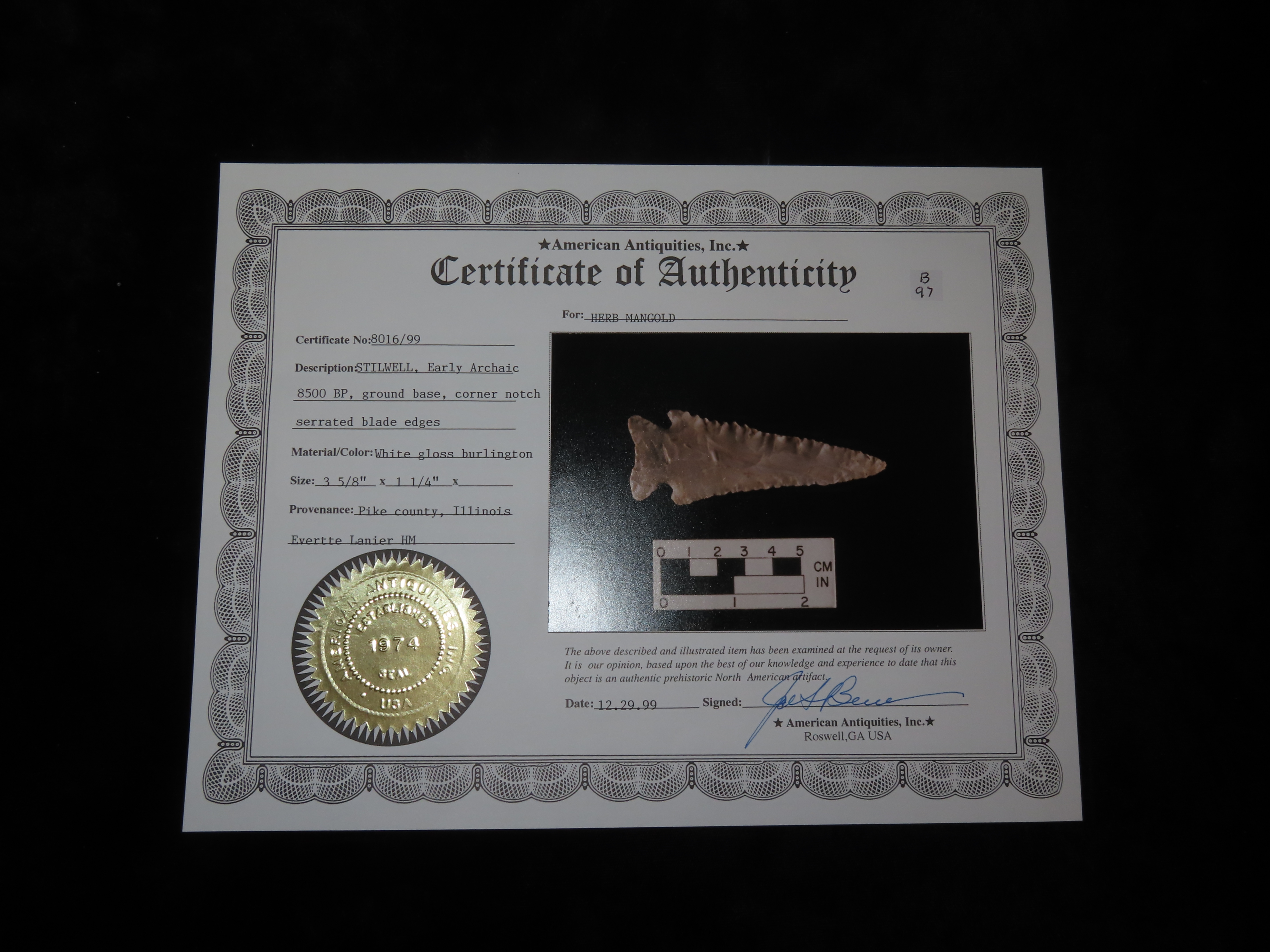 3 5/8″ Stillwell, American Antiquities COA, found in Pike Co., Illinois, Ex Evrette Lanier, Ex Herb Mangold Collections