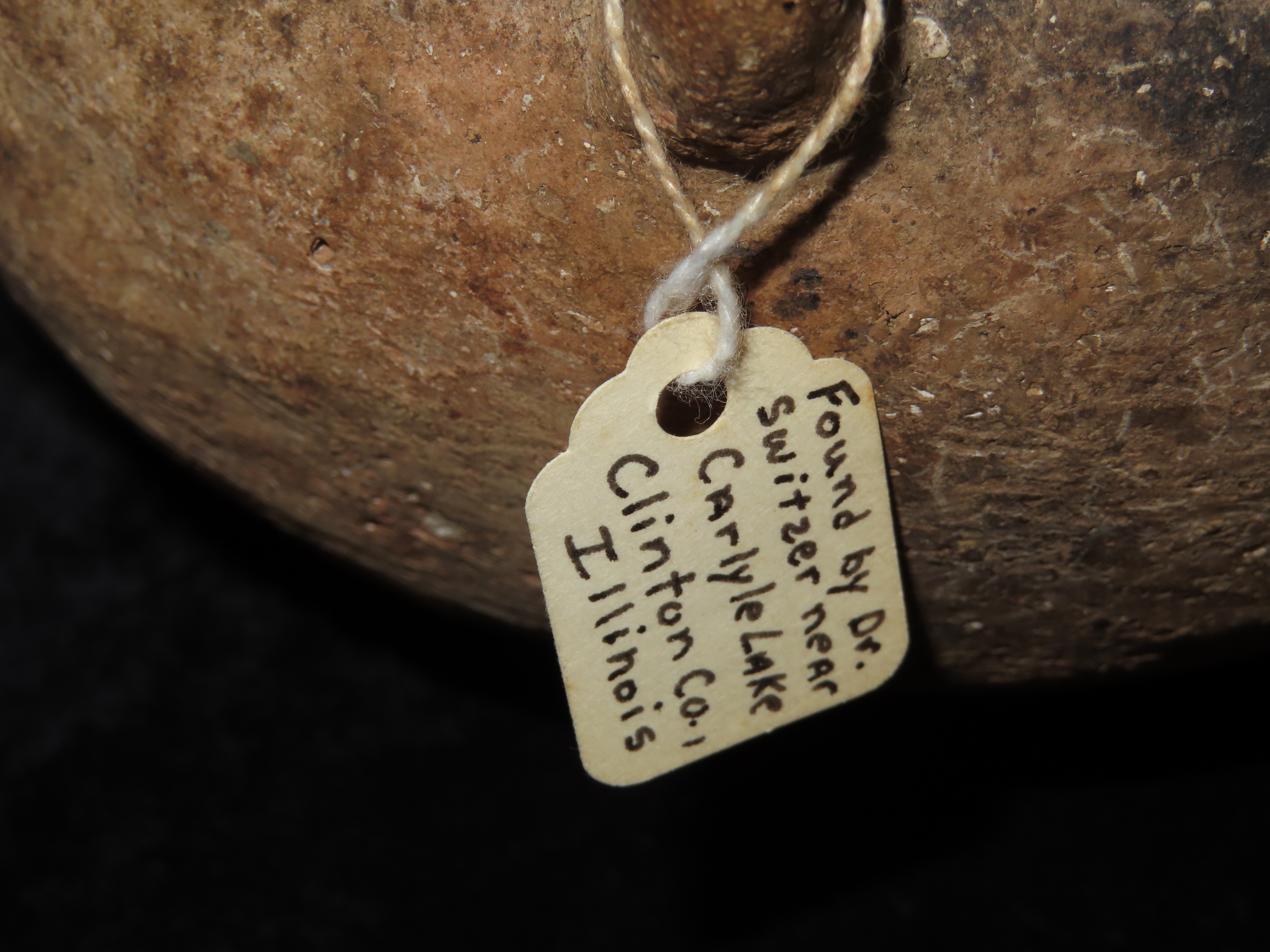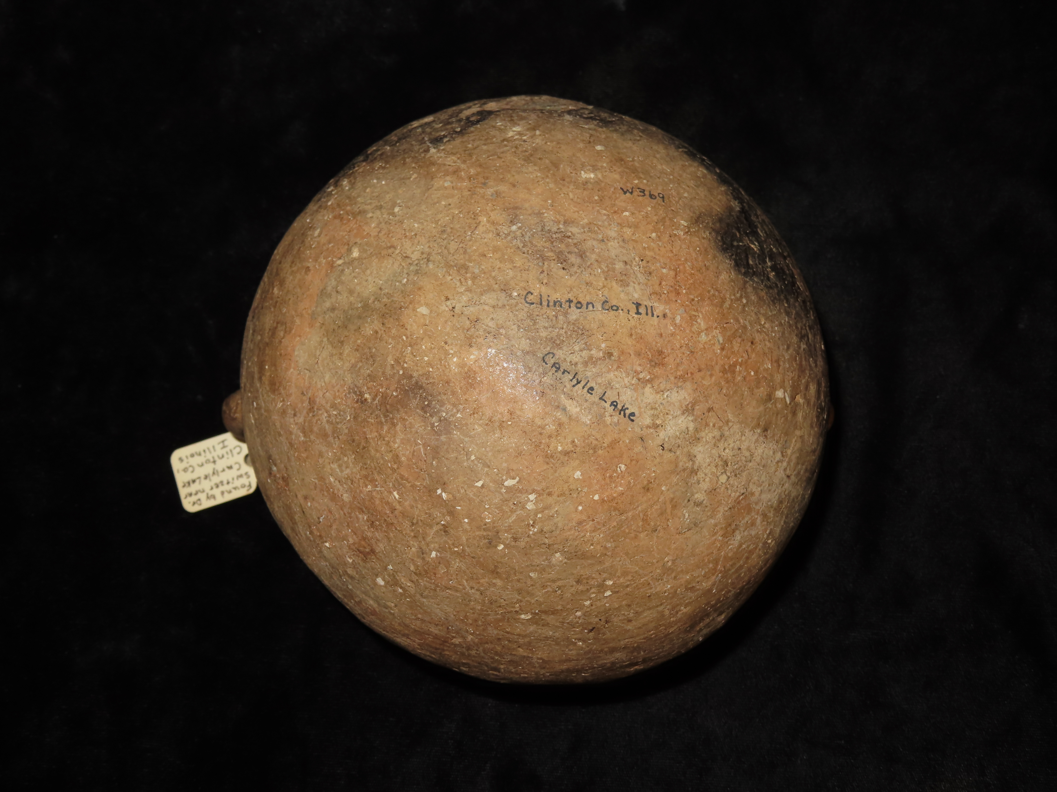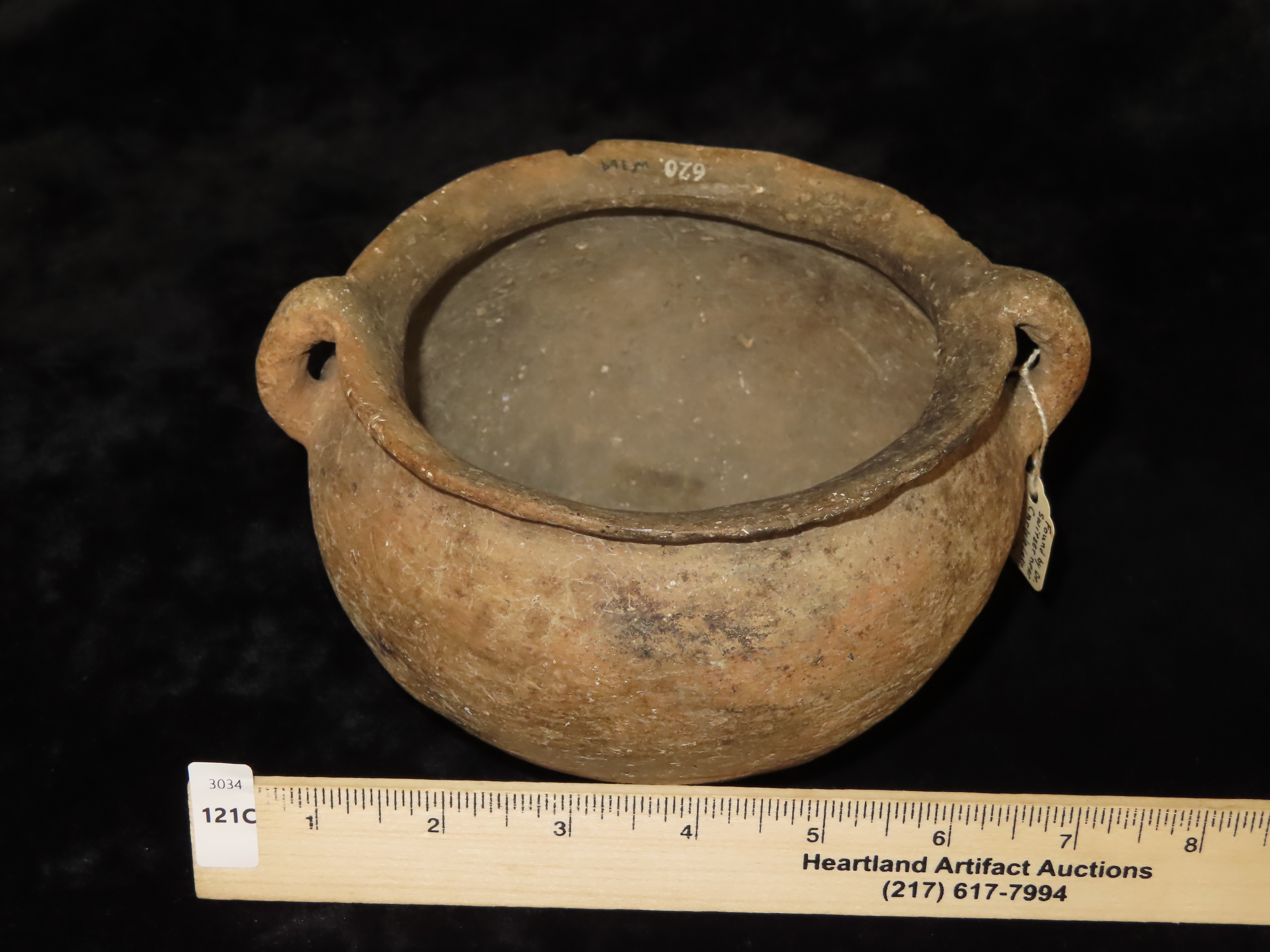 4 1/4″ Tall x 6 1/4″ Diameter Solid Strap Handled Pot, Cache 3 of 3, Found by workers building Carlyle Lake in Clinton Co. IL. Dr. Switzer was called and with his wife Mary recovered the artifacts. Floyd Ritter bought the Switzer Collection. These artifacts were later collected by Tim Weimers and kent Patterson.