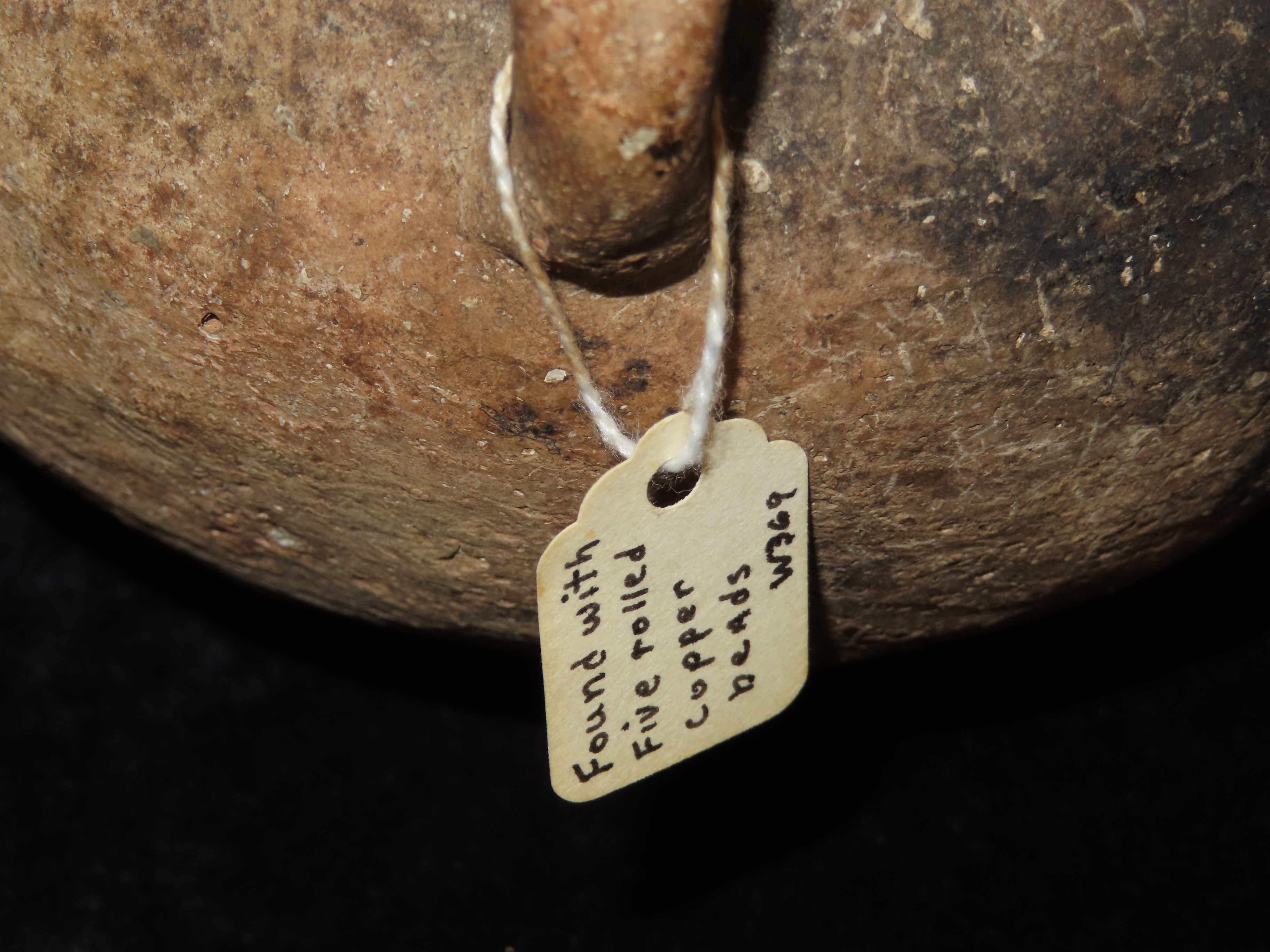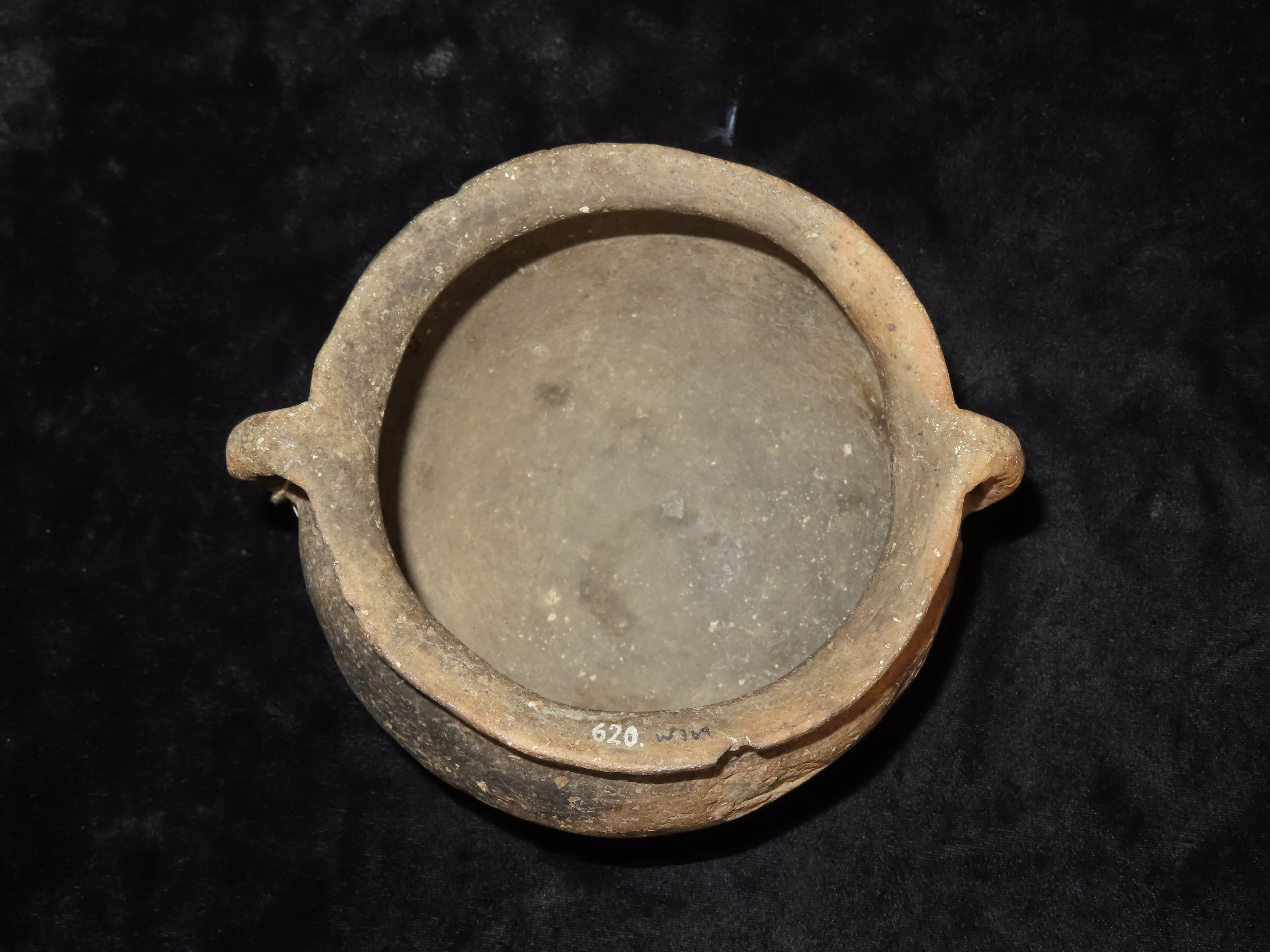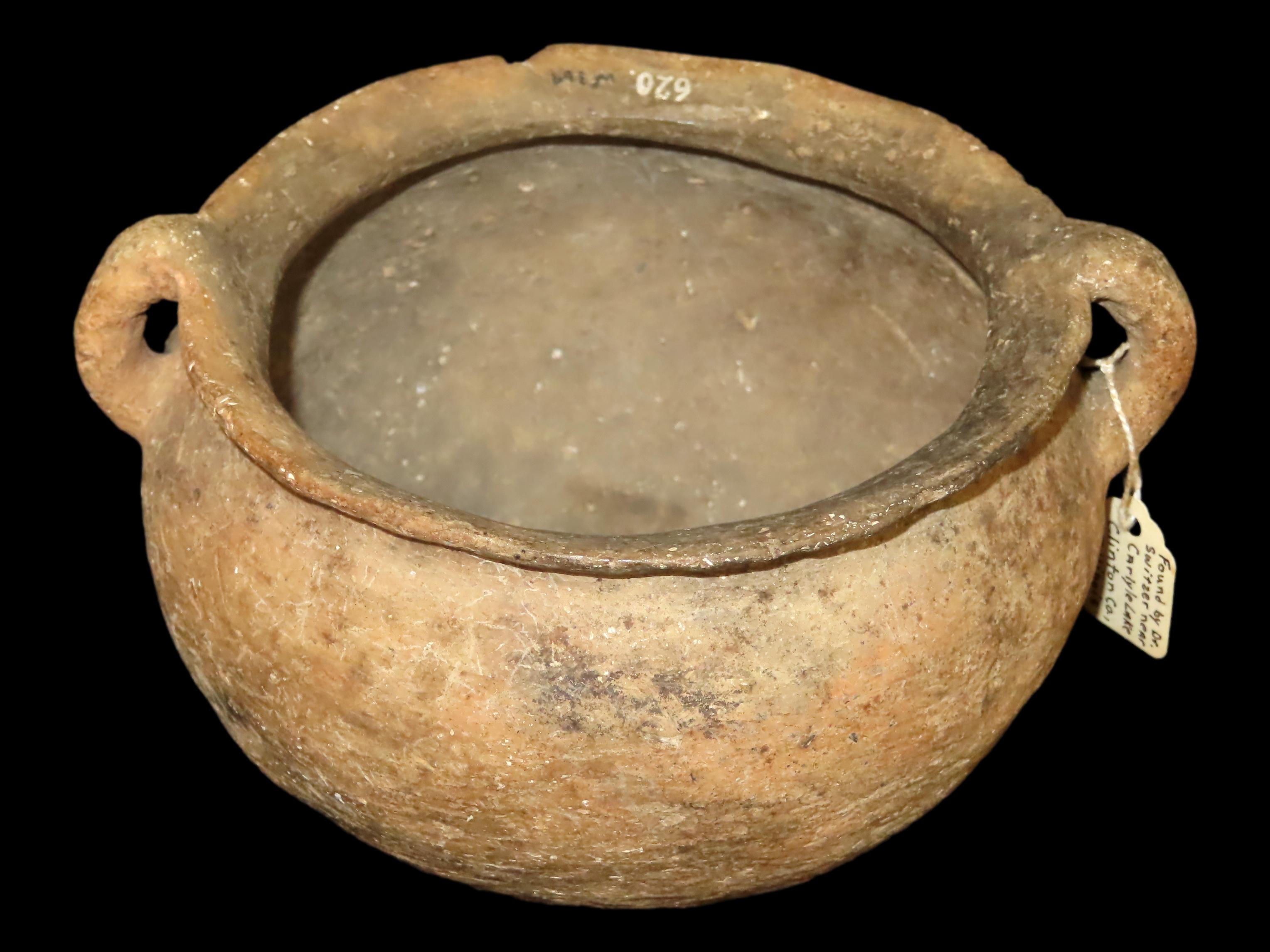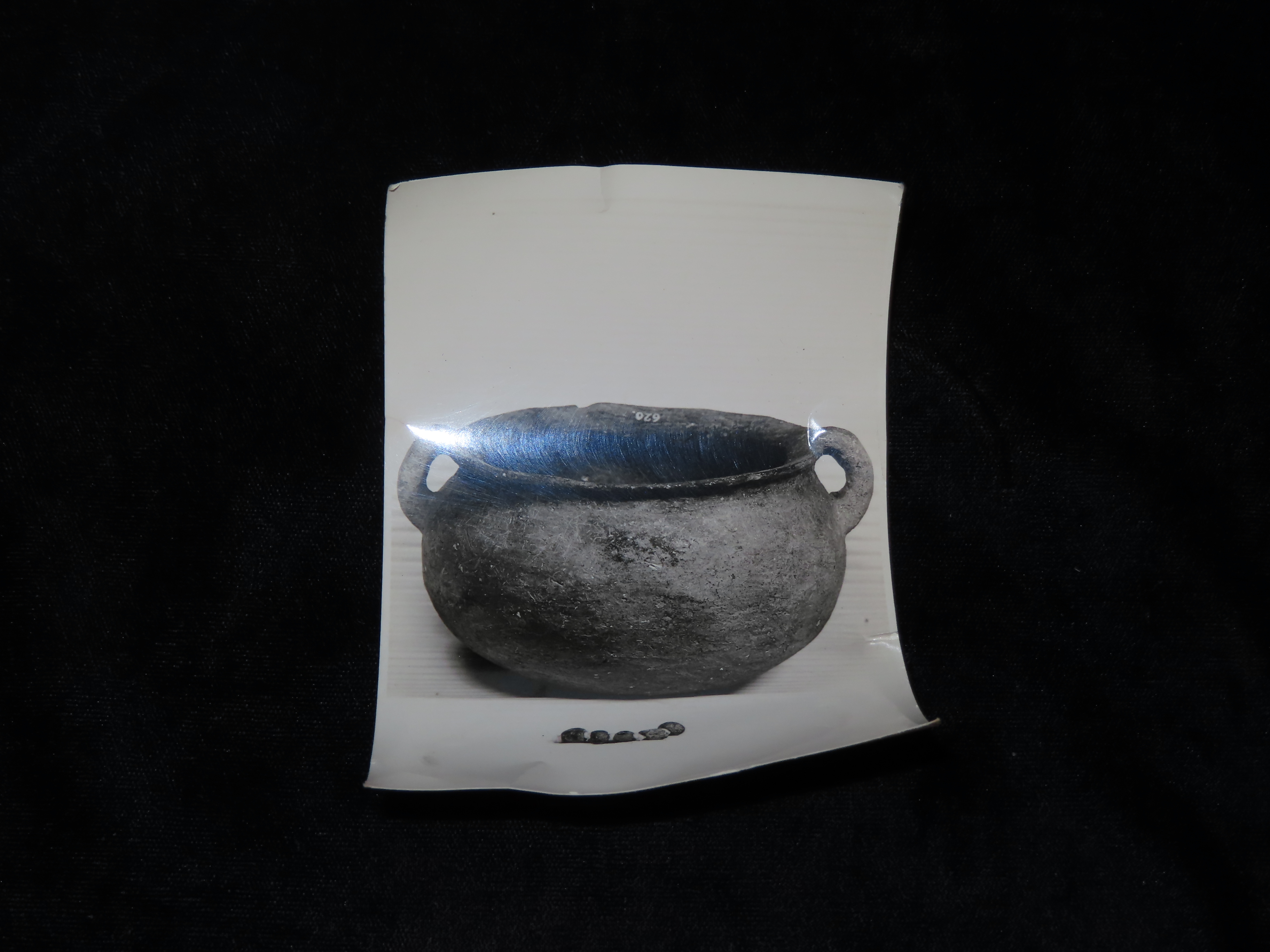 4 1/4″ Tall x 6 1/4″ Diameter Solid Strap Handled Pot, Cache 3 of 3, Found by workers building Carlyle Lake in Clinton Co. IL. Dr. Switzer was called and with his wife Mary recovered the artifacts. Floyd Ritter bought the Switzer Collection. These artifacts were later collected by Tim Weimers and kent Patterson.