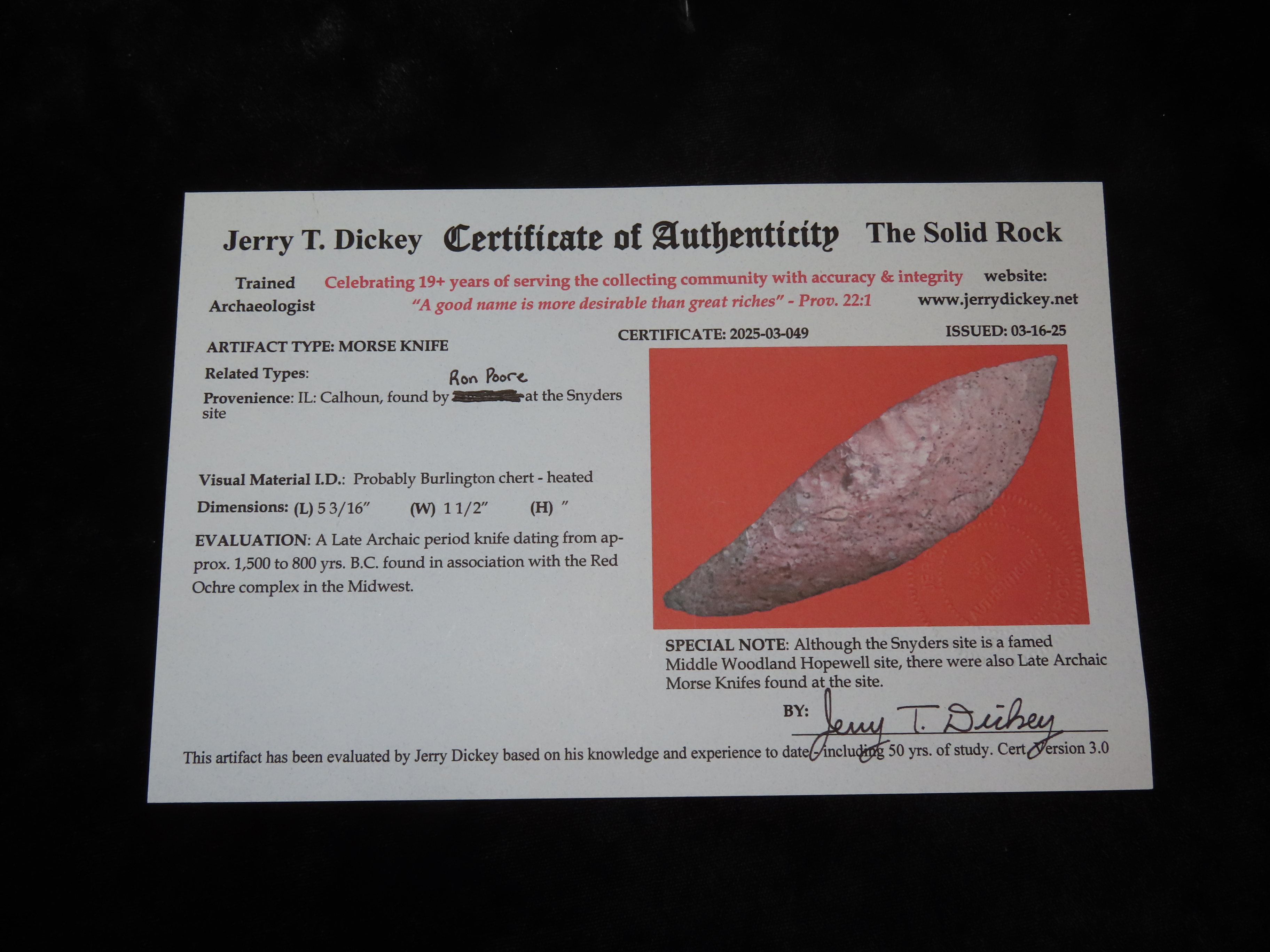 5 3/16″ SPECTACULAR COLOR Morse Knife, Dickey COA, found by Ron Poore in at the Snyder’s Site, in Calhoun Co., Illinois
