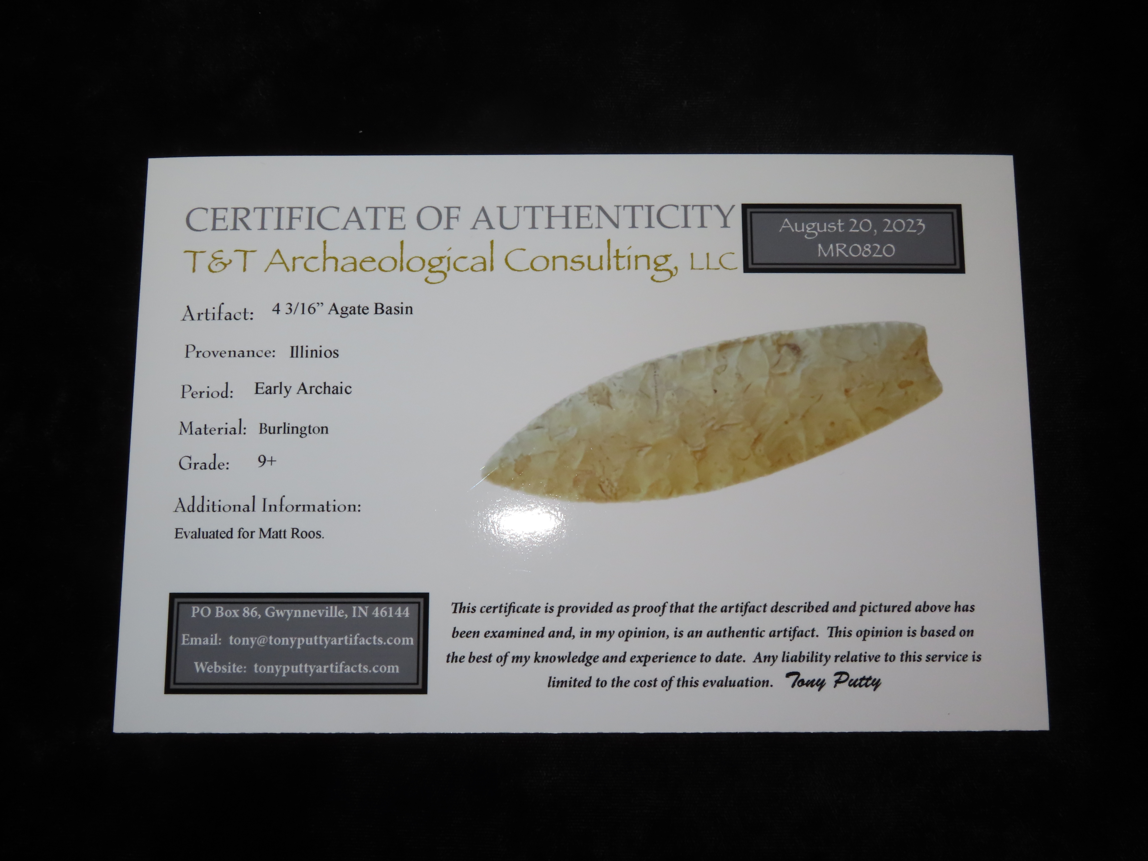 4 3/16″ Agate Basin, Putty COA, found in Illinois, Ex Matt Roos Collection