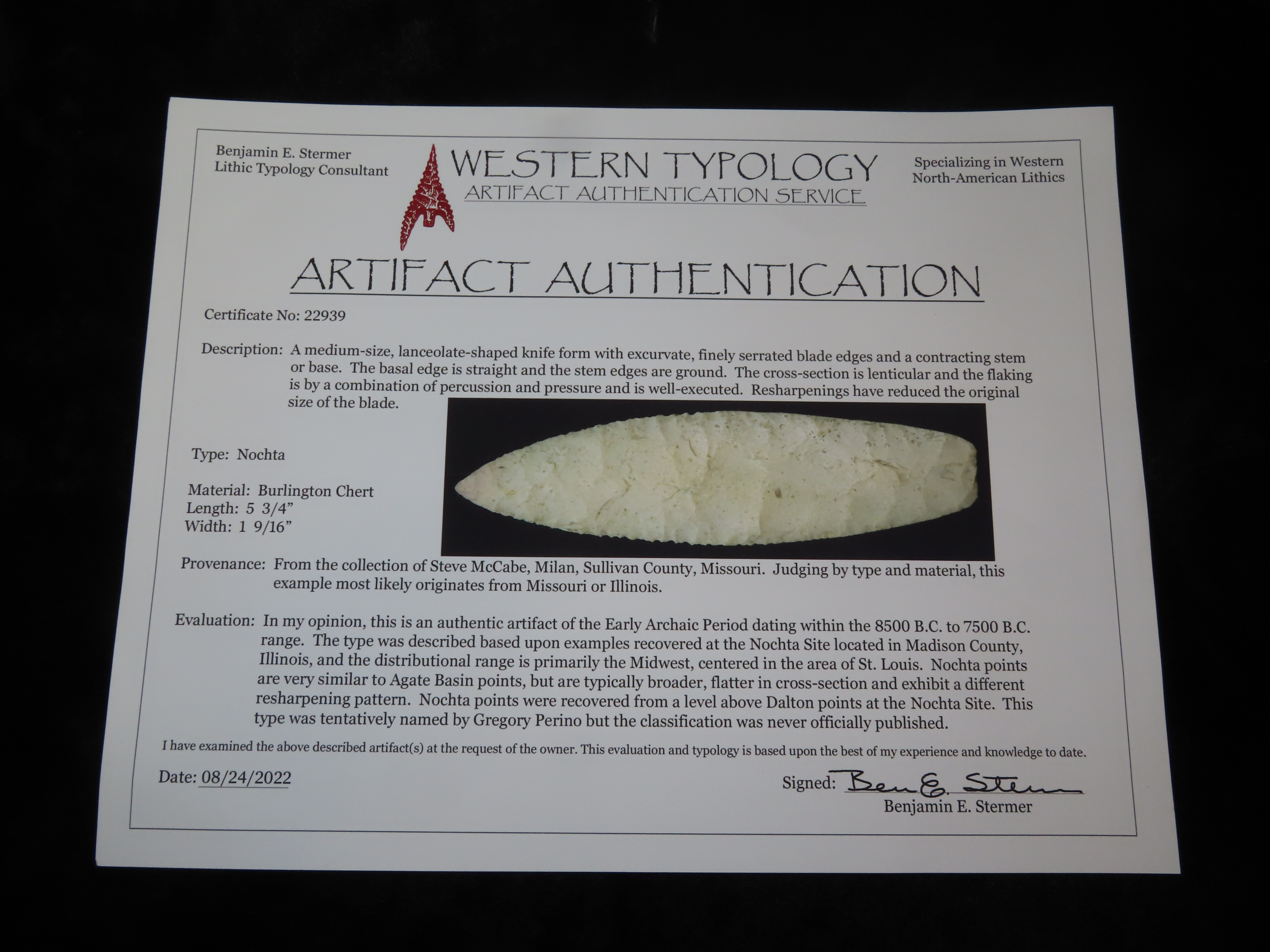 5 3/4″ Nochta, Stermer COA, found in Illinois/Missouri, Ex Steve McCabe Collection, Sullivan Co., Missouri
