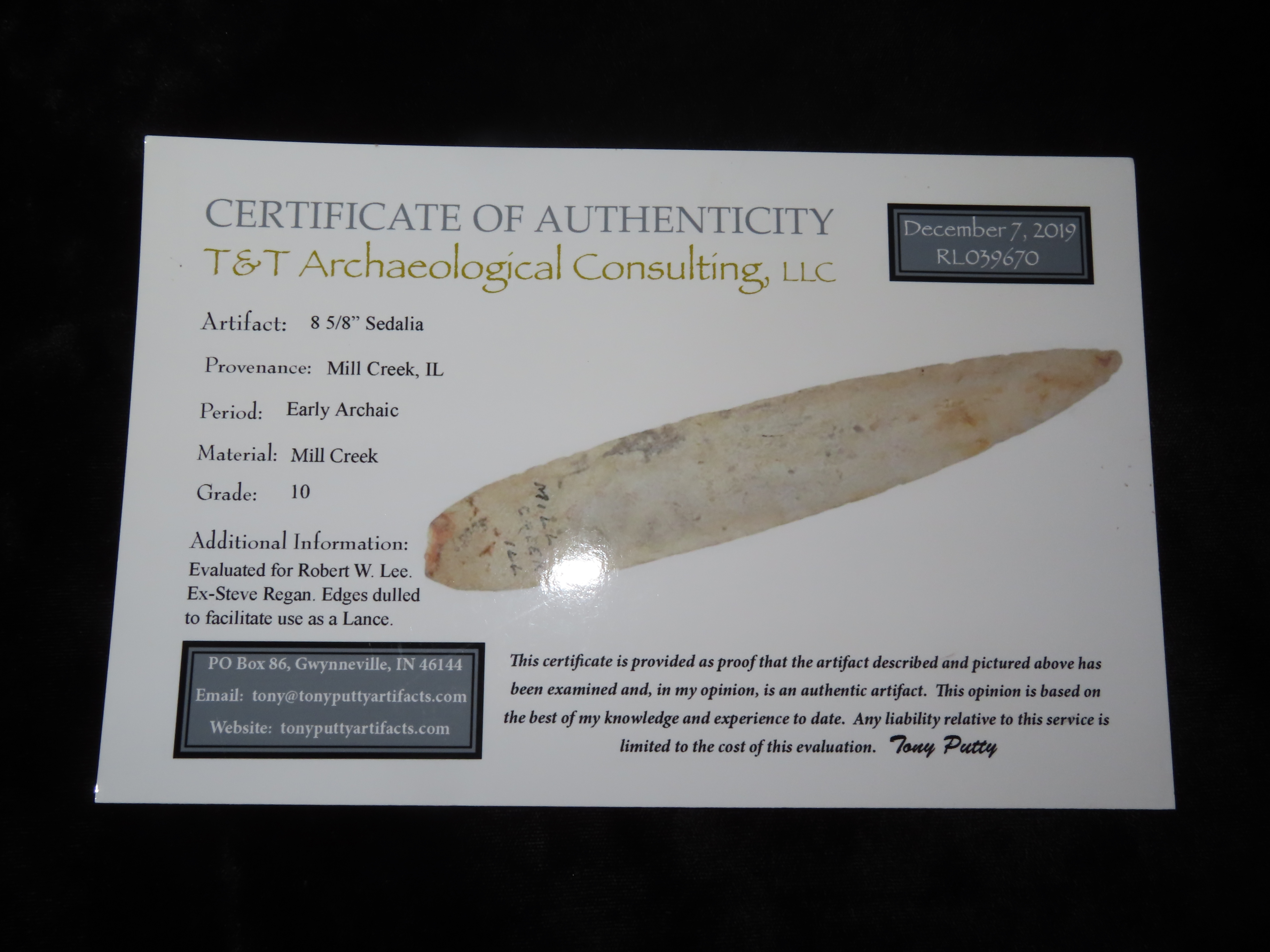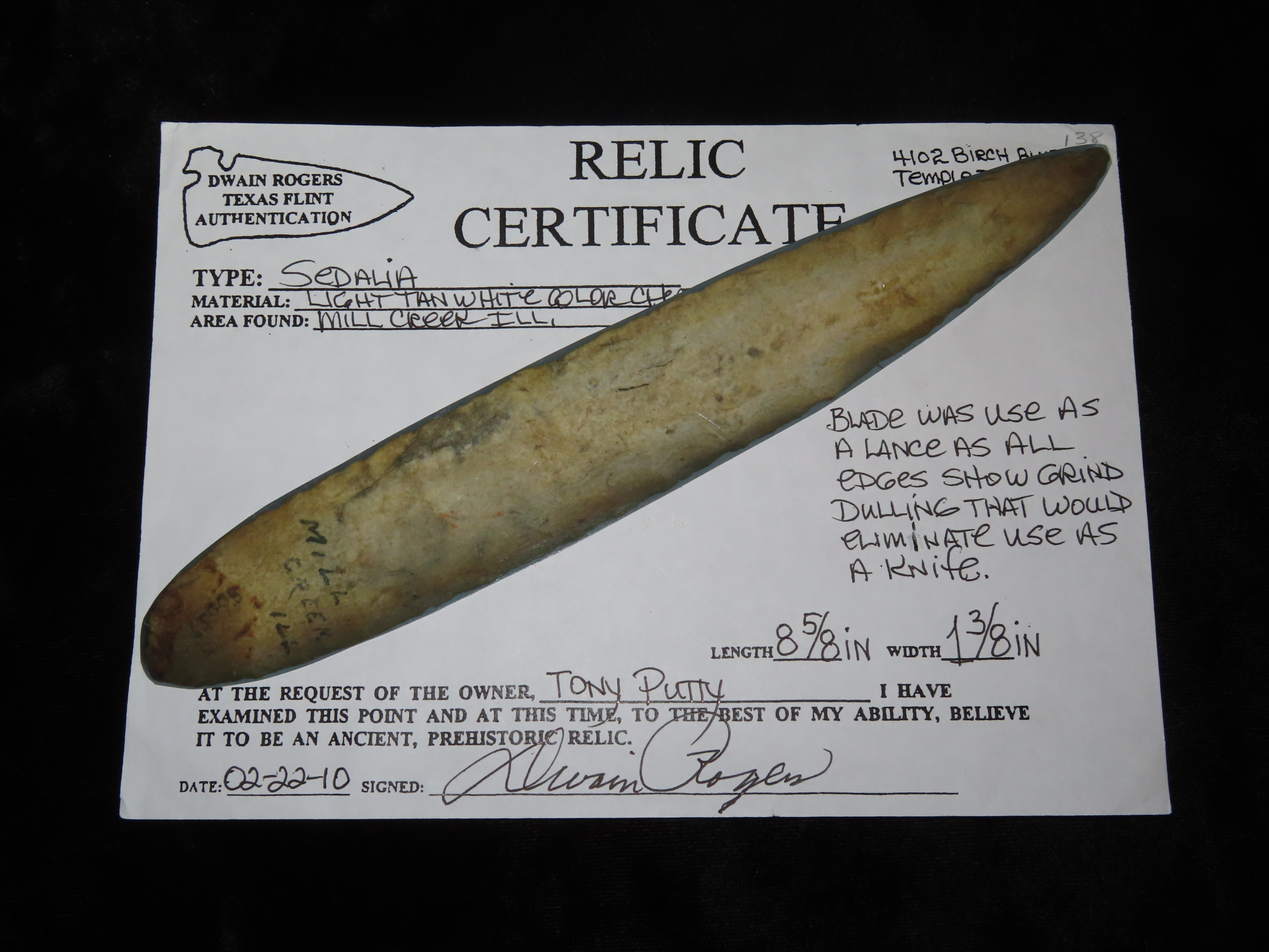 8 5/8″ Sedalia, 2xCOA-Rogers/Putty, made of Mill Creek Chert, found in Mill Creek Illinois, Ex Tony Putty, Ex Matt Roos Collections