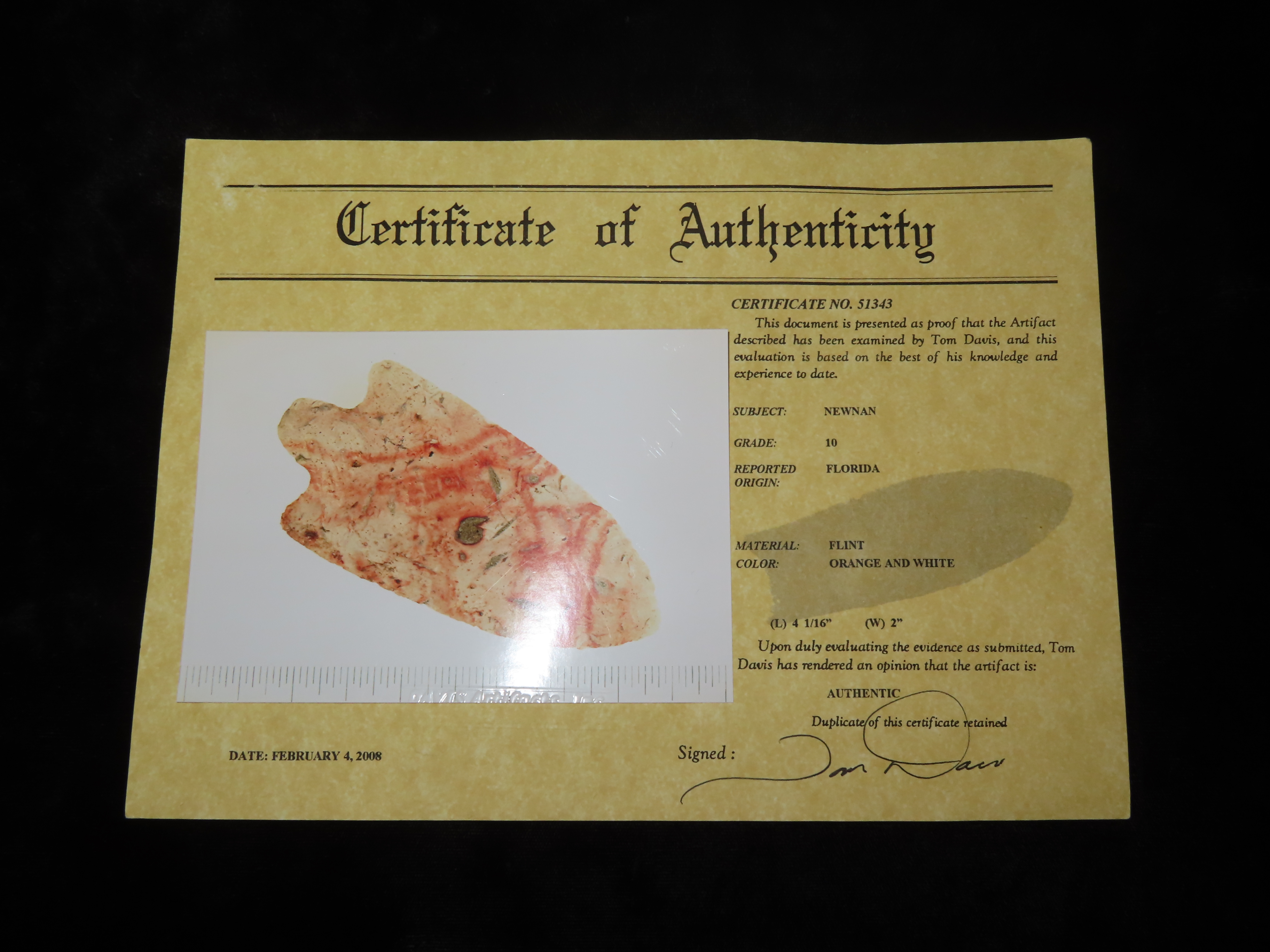 4 1/16″ Newnan, Davis COA, found in Florida, Ex Matt Roos