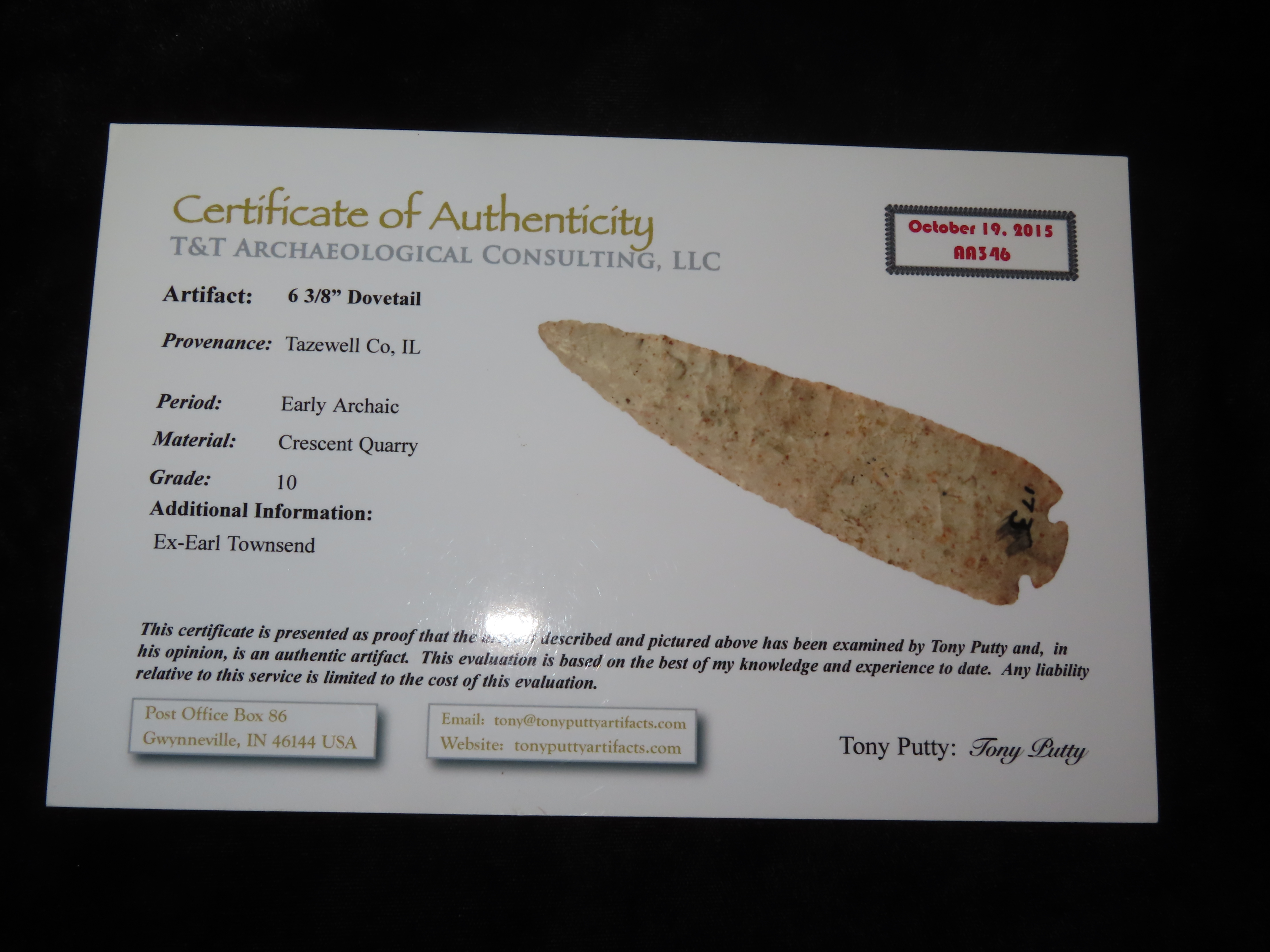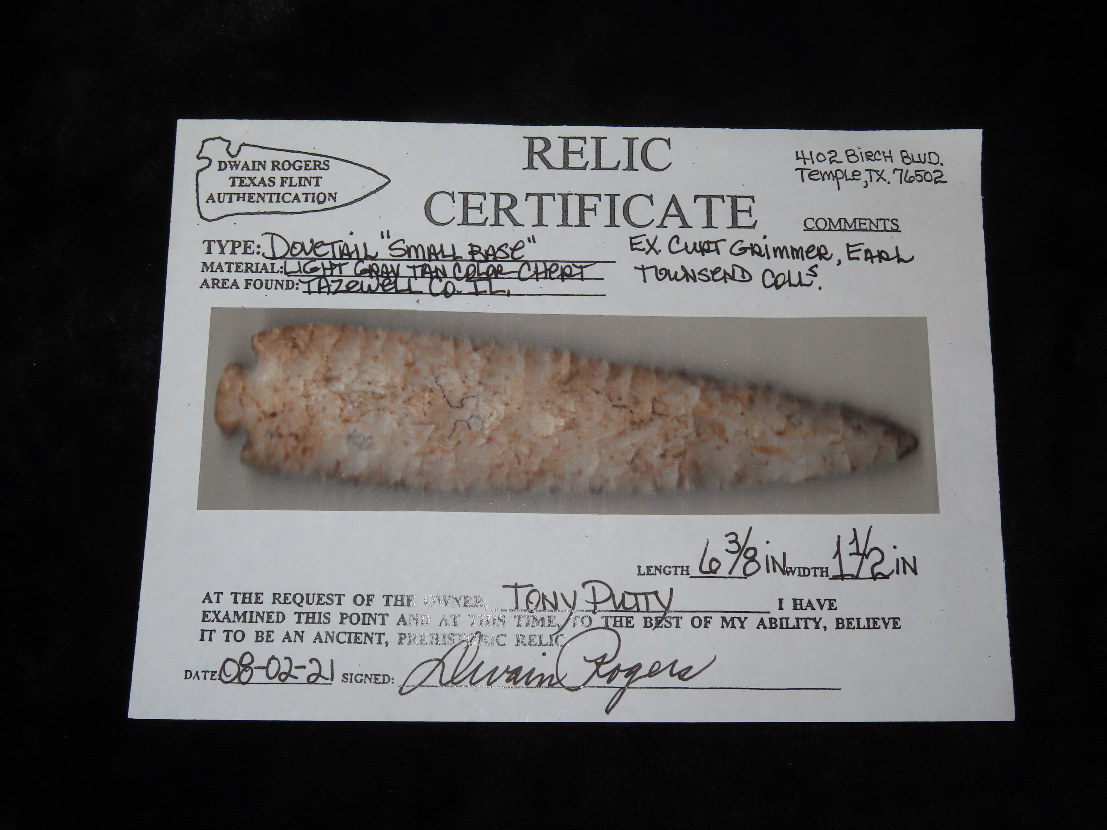 6 3/8″ Small-Base Dovetail, 2xCOA-Rogers/putty, found in Tazewell Co., Illinois, Ex Earl Townsend, Ex Curt Grimmer, Ex Tony Putty, Ex Matt Roos Collections