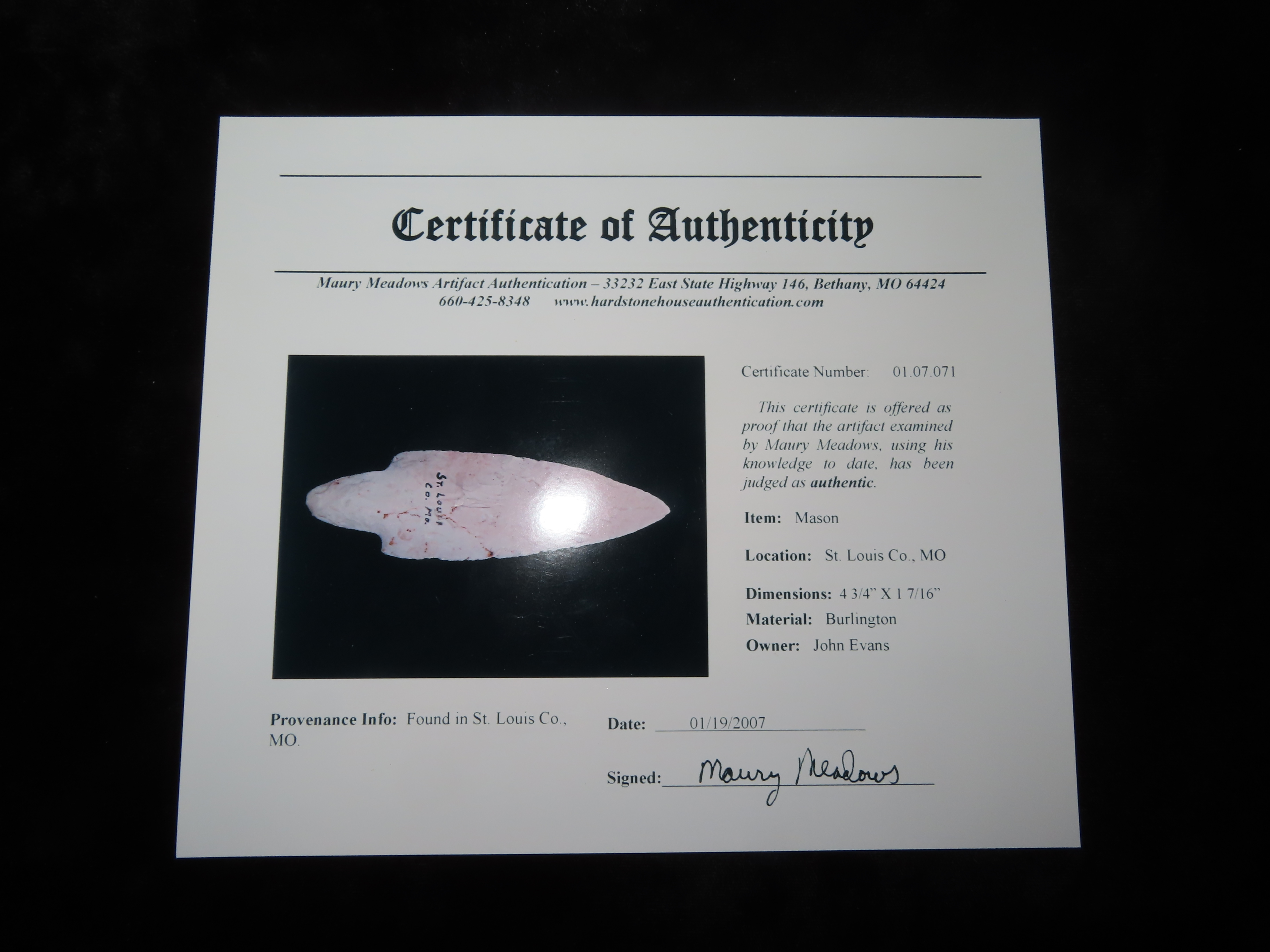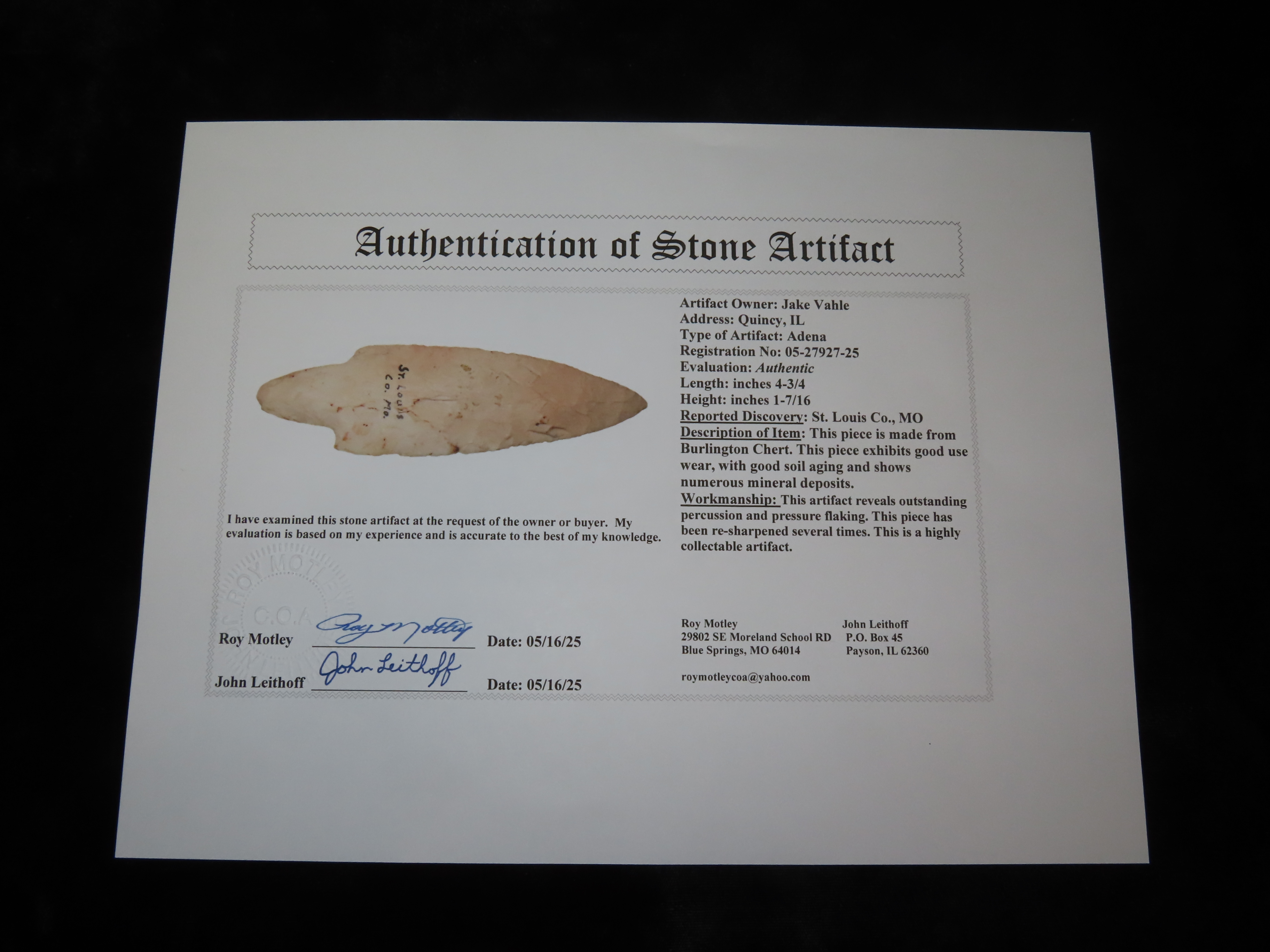 4 3/4″ Adena, 2xCOA-Motley/Meadows, found in St Louis Co., Missouri, Ex John Evans, Ex Jake Vahle