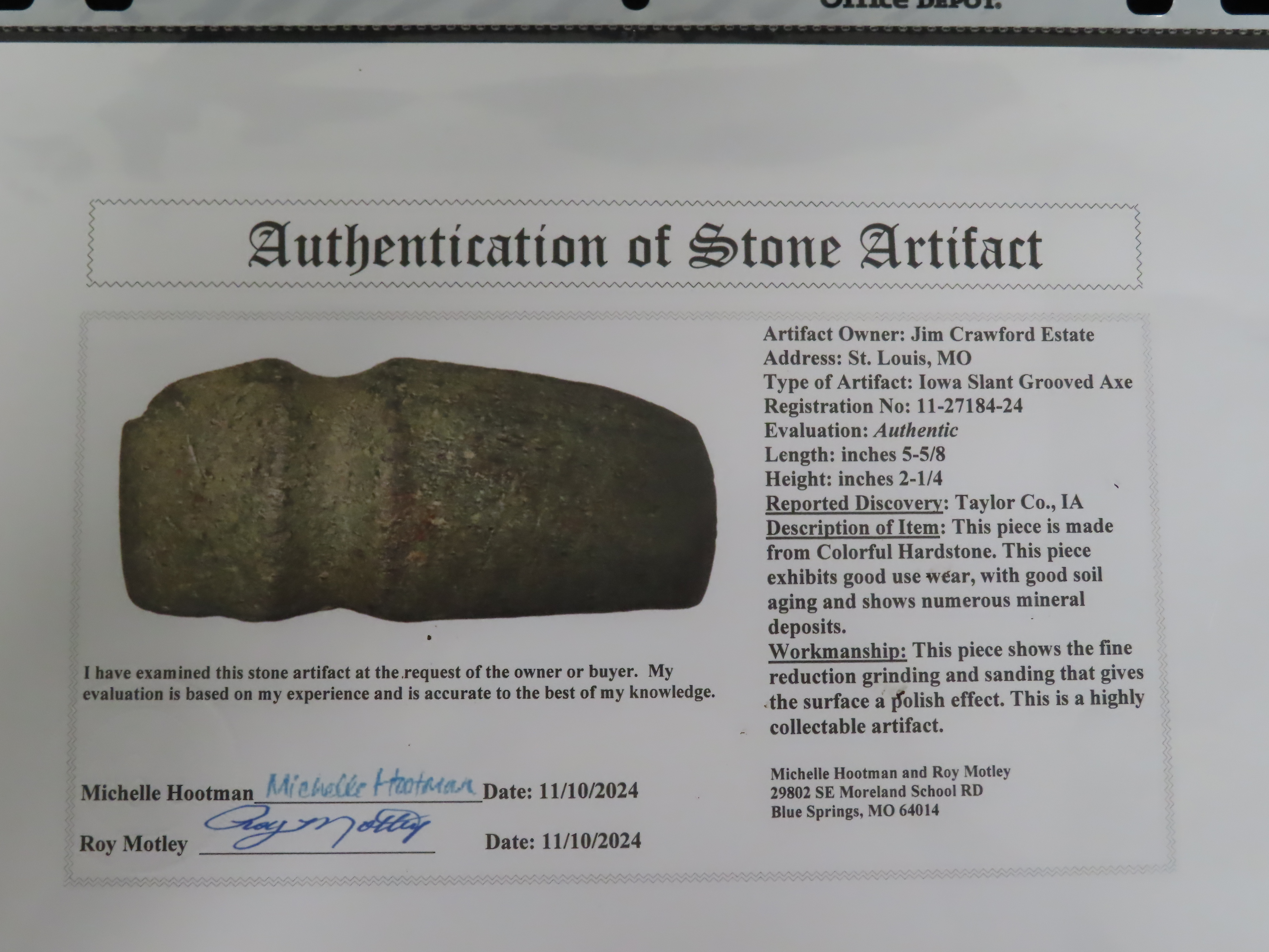5 5/8″ Iowa Slant Groove Axe, 2xCOA-Motley/Meadows, found in Taylor Co., Iowa, Ex Jim Crawford Collection