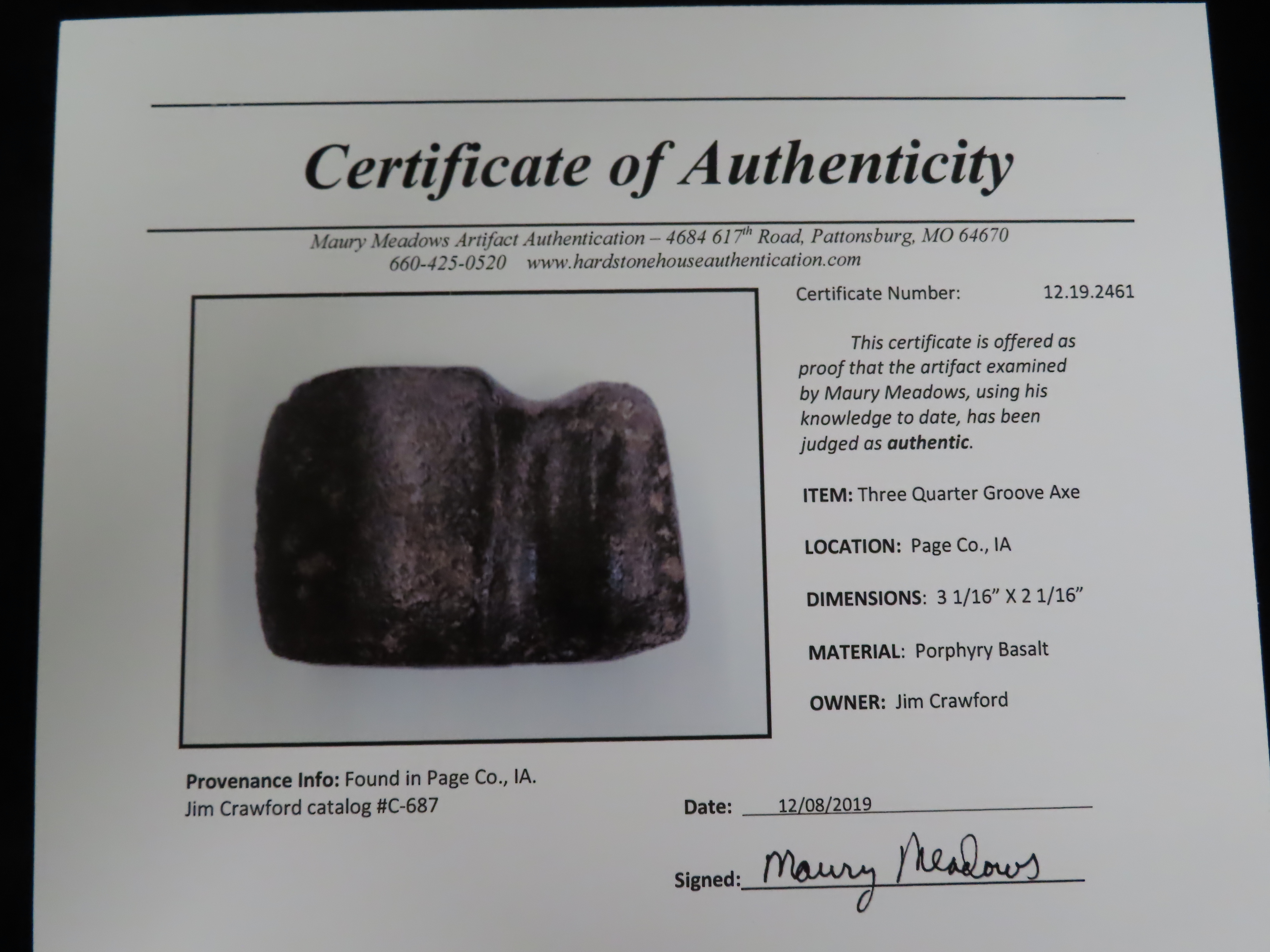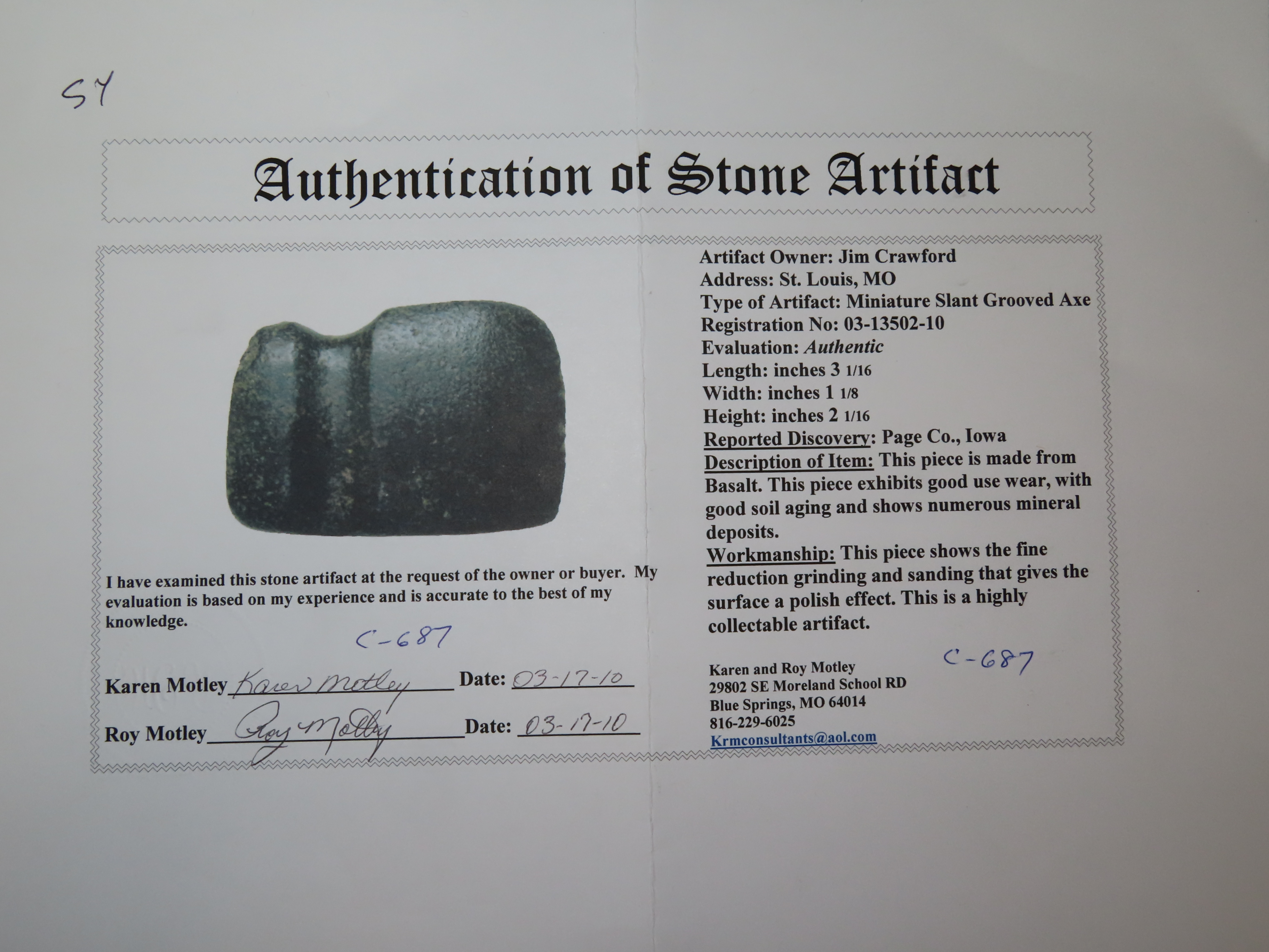 3 1/16″ Miniature Slant Groove Axe, 2xCOA- Motley/Meadows, found in Page Co., Iowa, Ex Jim Crawford Collection
