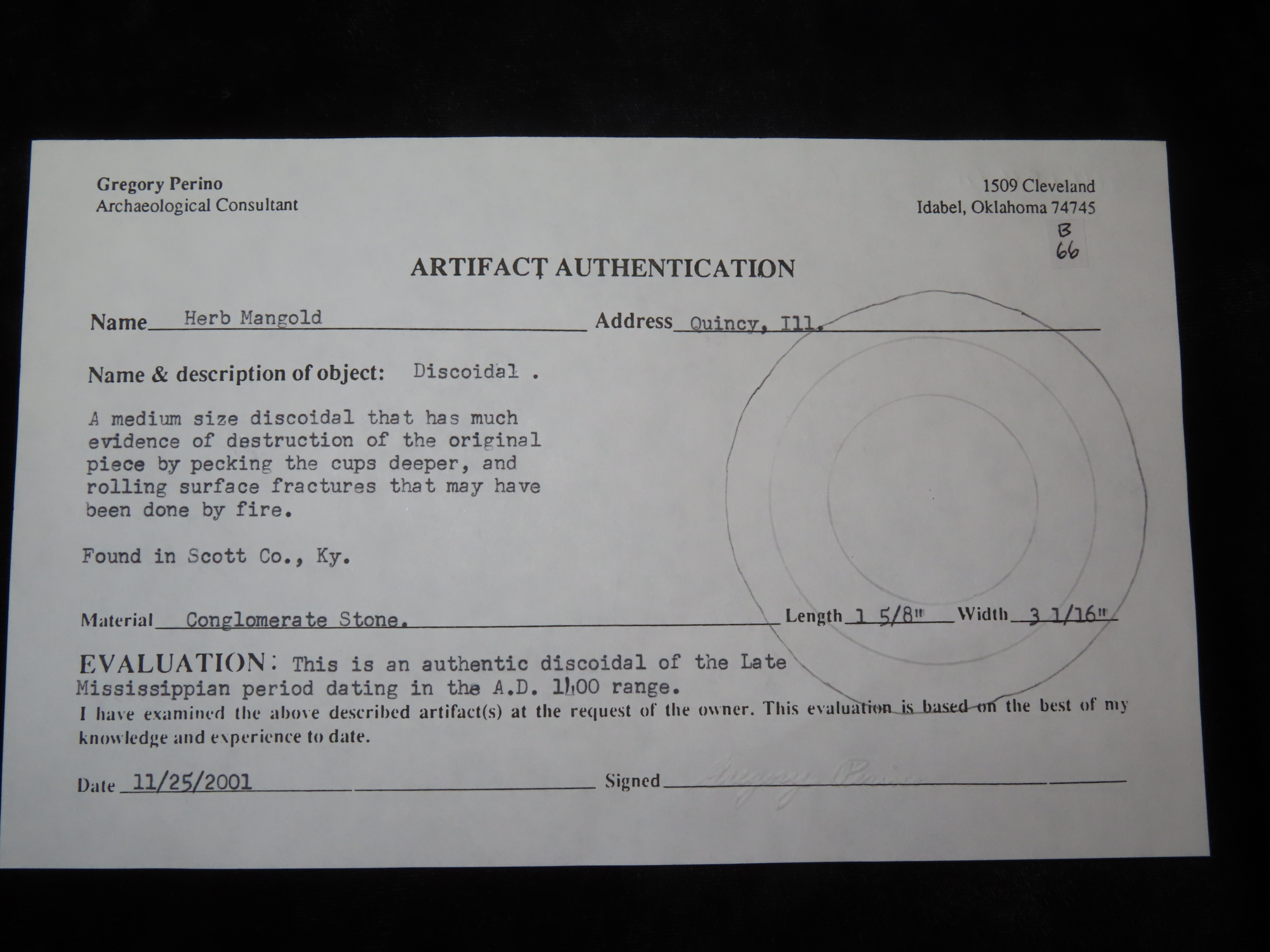 1 5/8" x 3 1/16" Discoidal, Perino COA, found in Scott Co., Kentucky- see COA for description