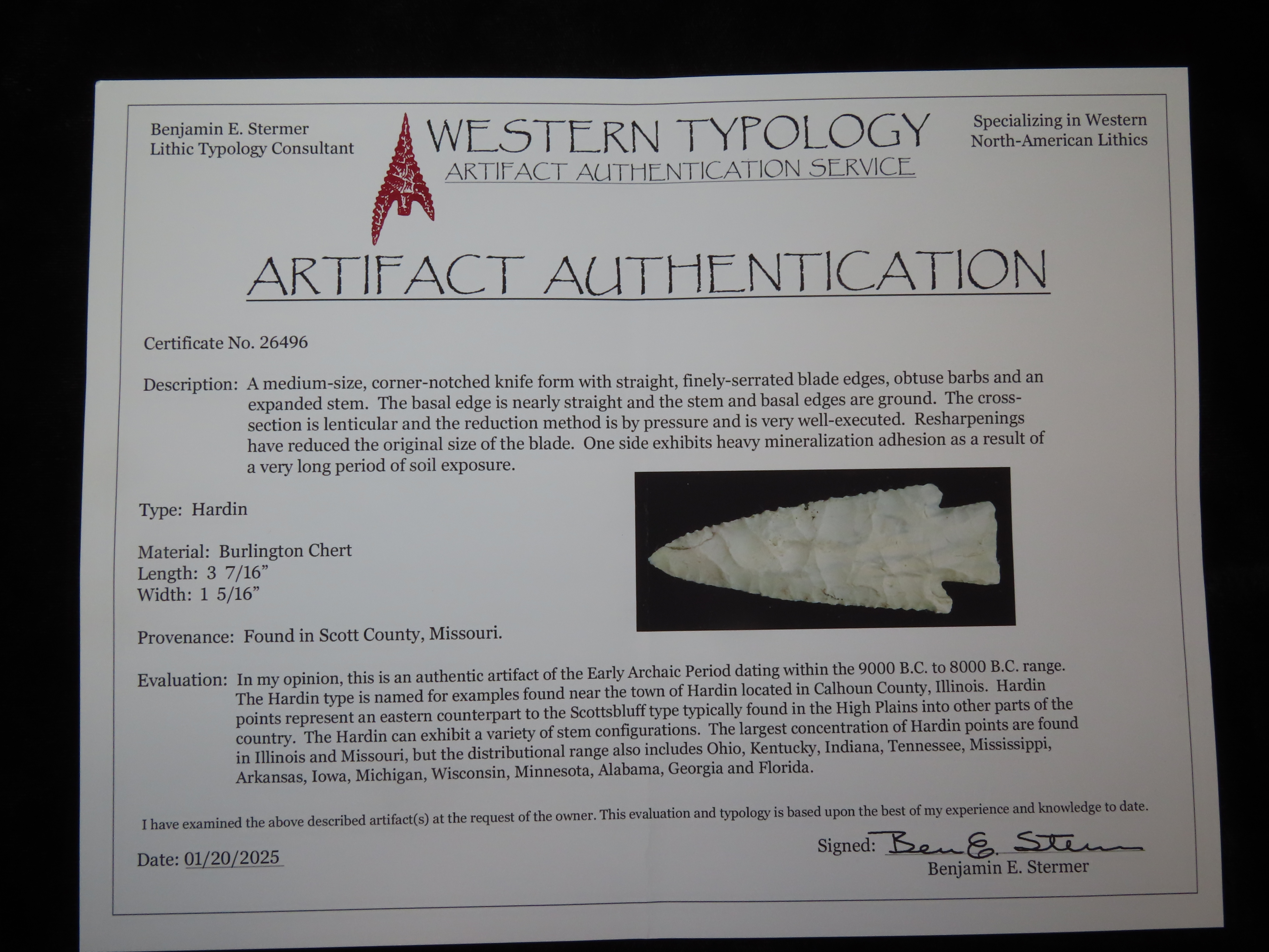 3 7/16″ Hardin, Stermer COA, found in Scott Co., Missouri