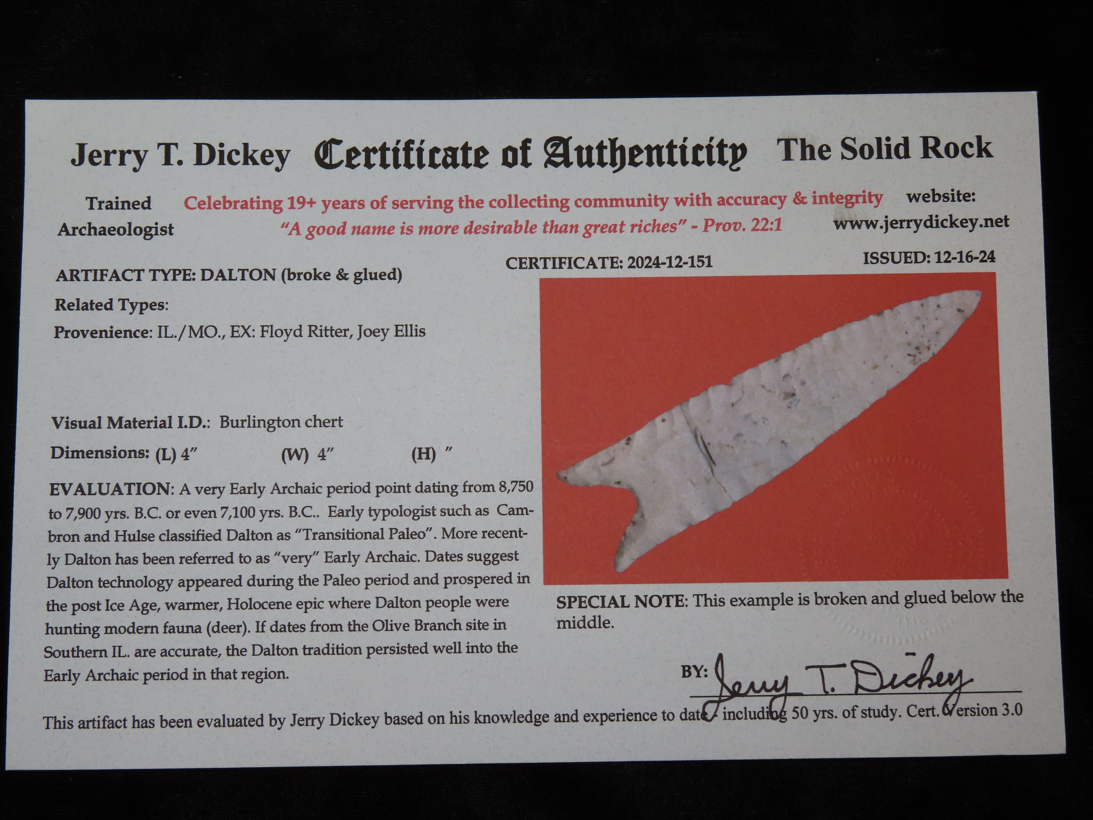 4" Dalton, **broken and glued**, Dickey COA, found in Illinois or Missouri, Ex Floyd Ritter, Ex Joey Ellis Collections