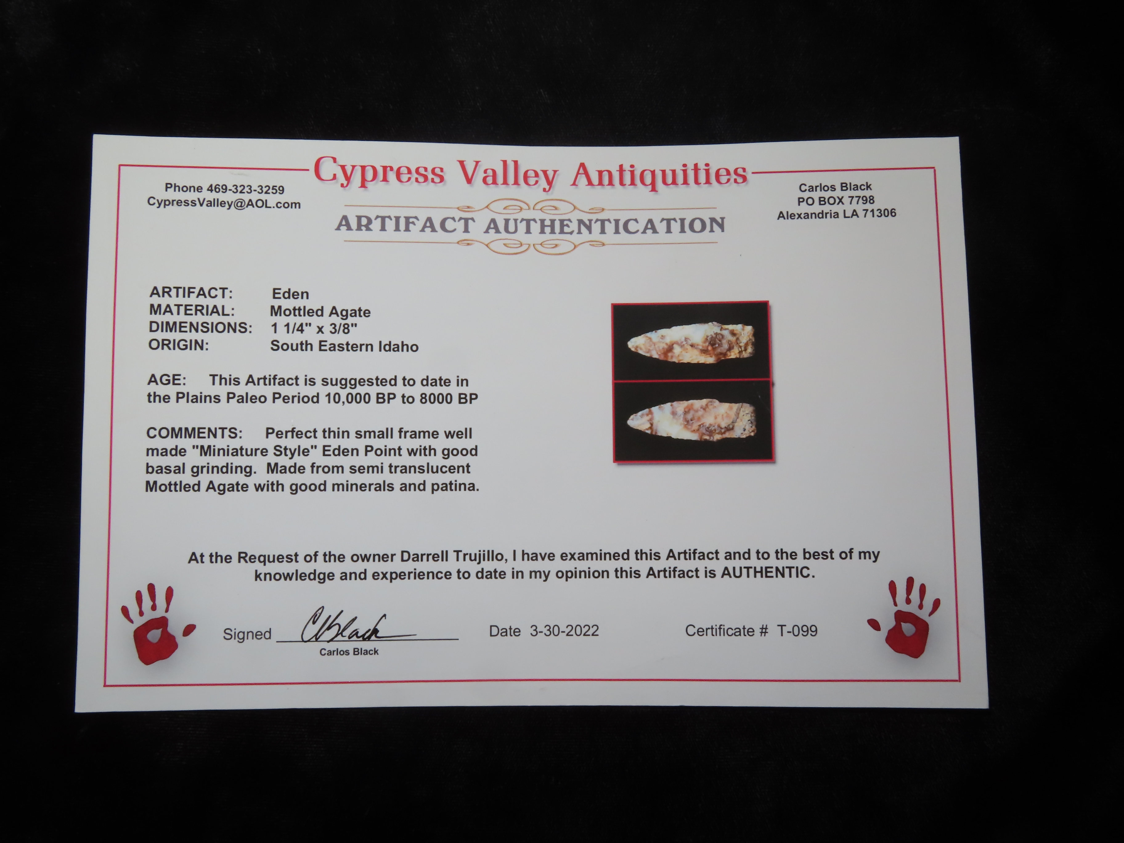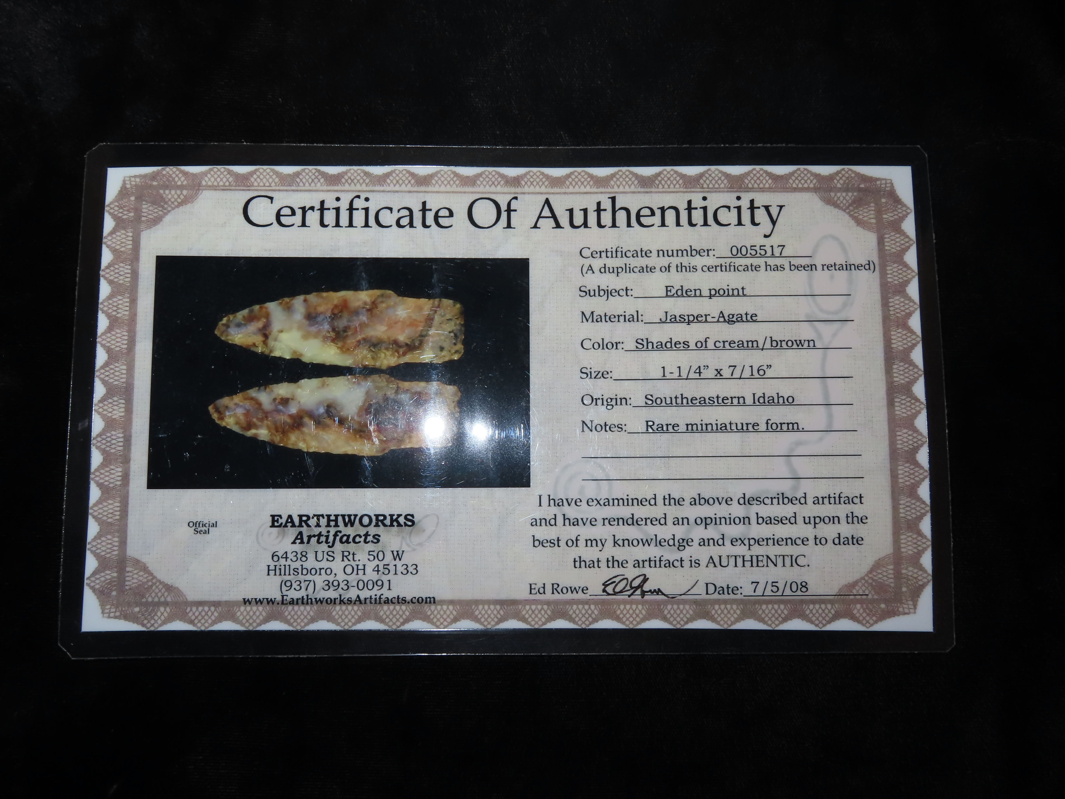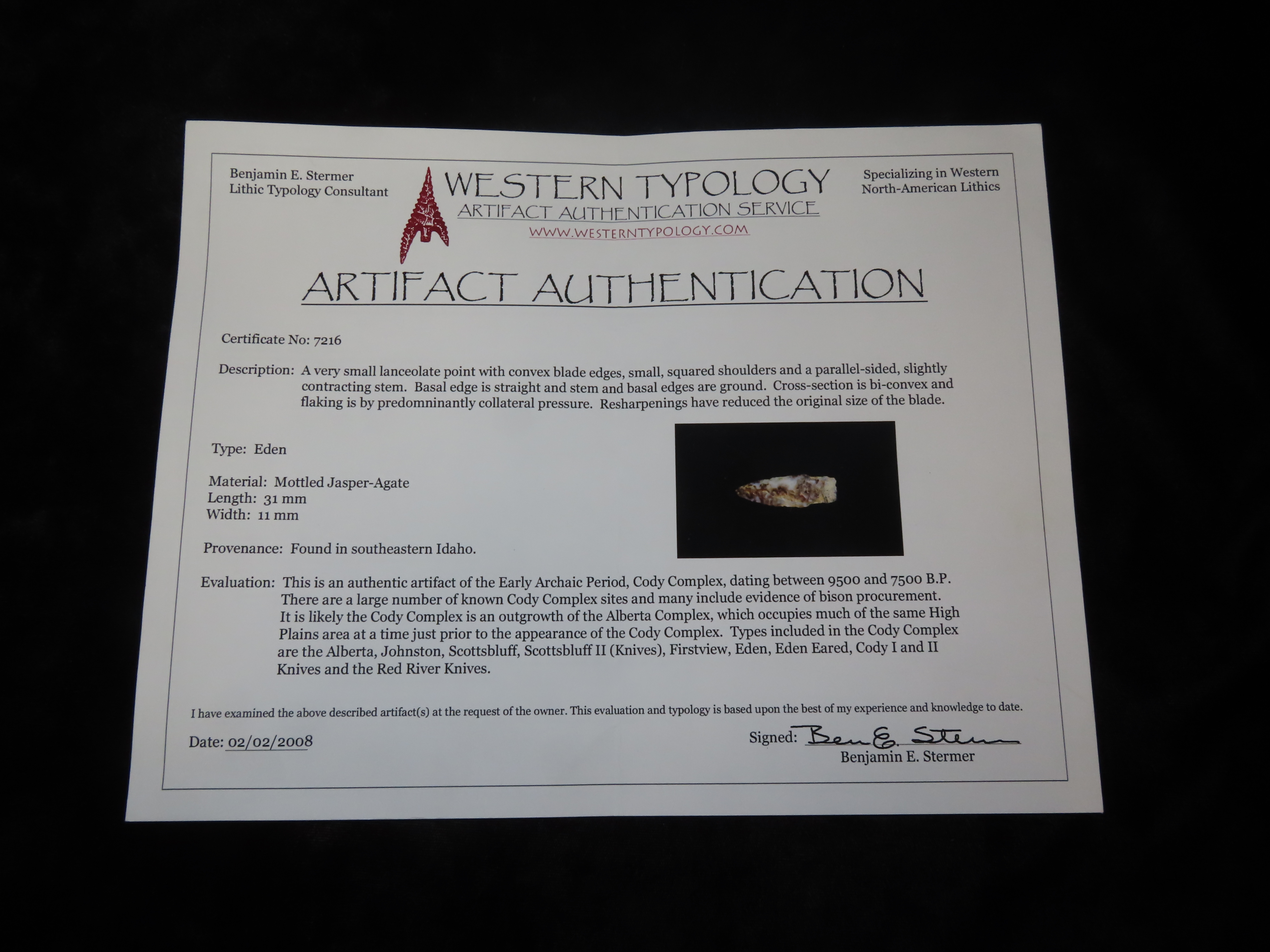 1 1/4″ Eden Point Made of Jasper-Agate from Southeastern Idaho, Stermer COA/Earthworks COA/Cypress Antiquities COA