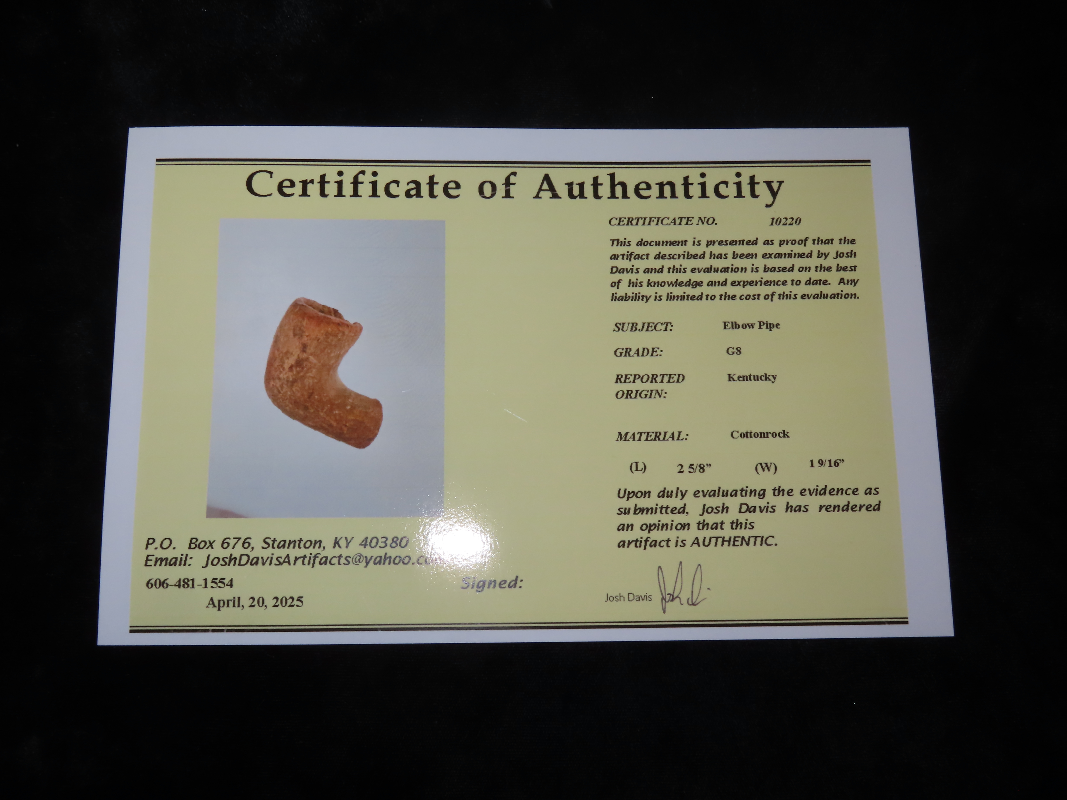 2 5/8″ Elbow Pipe, Davis COA, Found in Kentucky