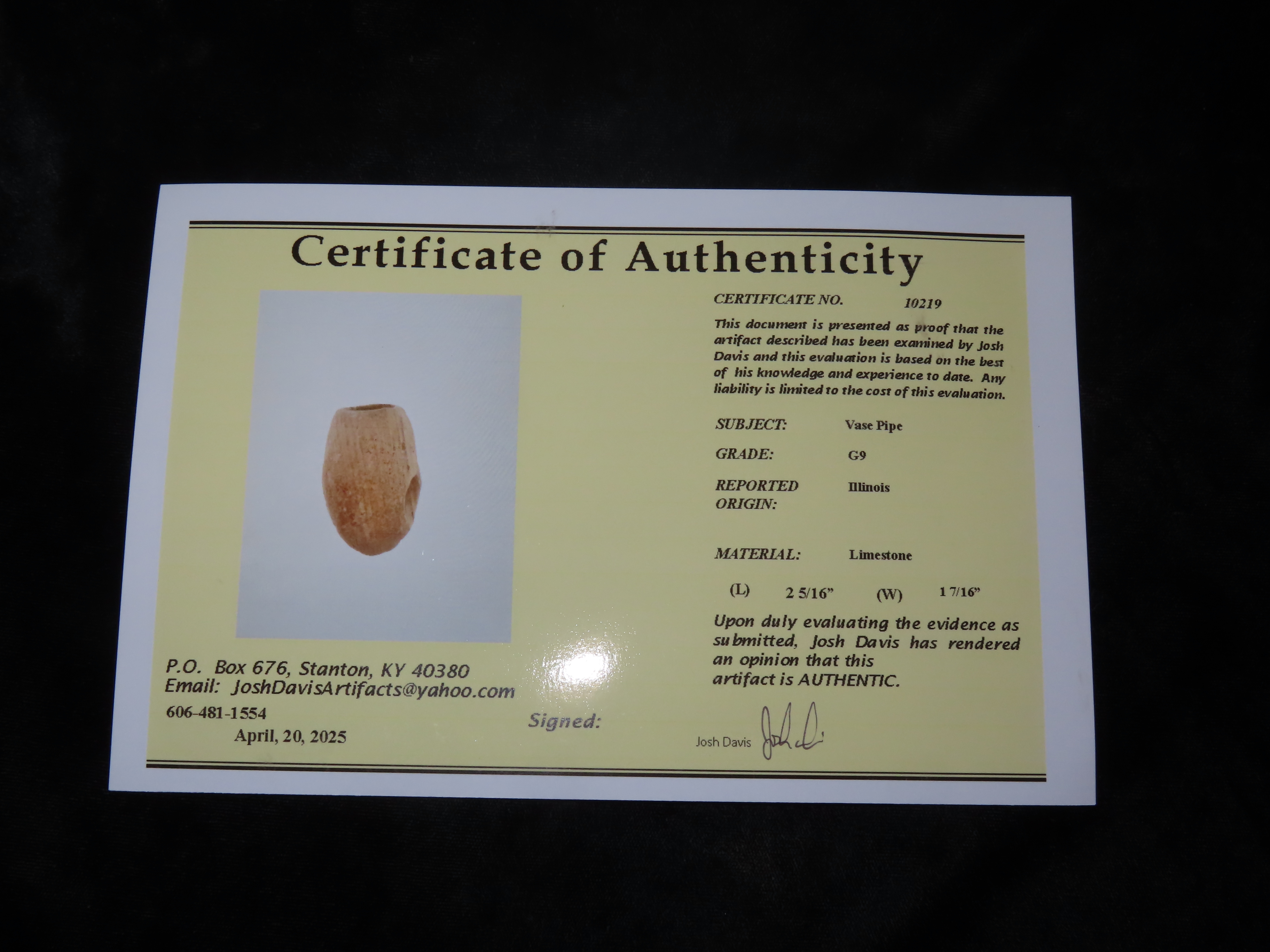 2 5/16" Vase Pipe, Davis COA, Found in Illinois