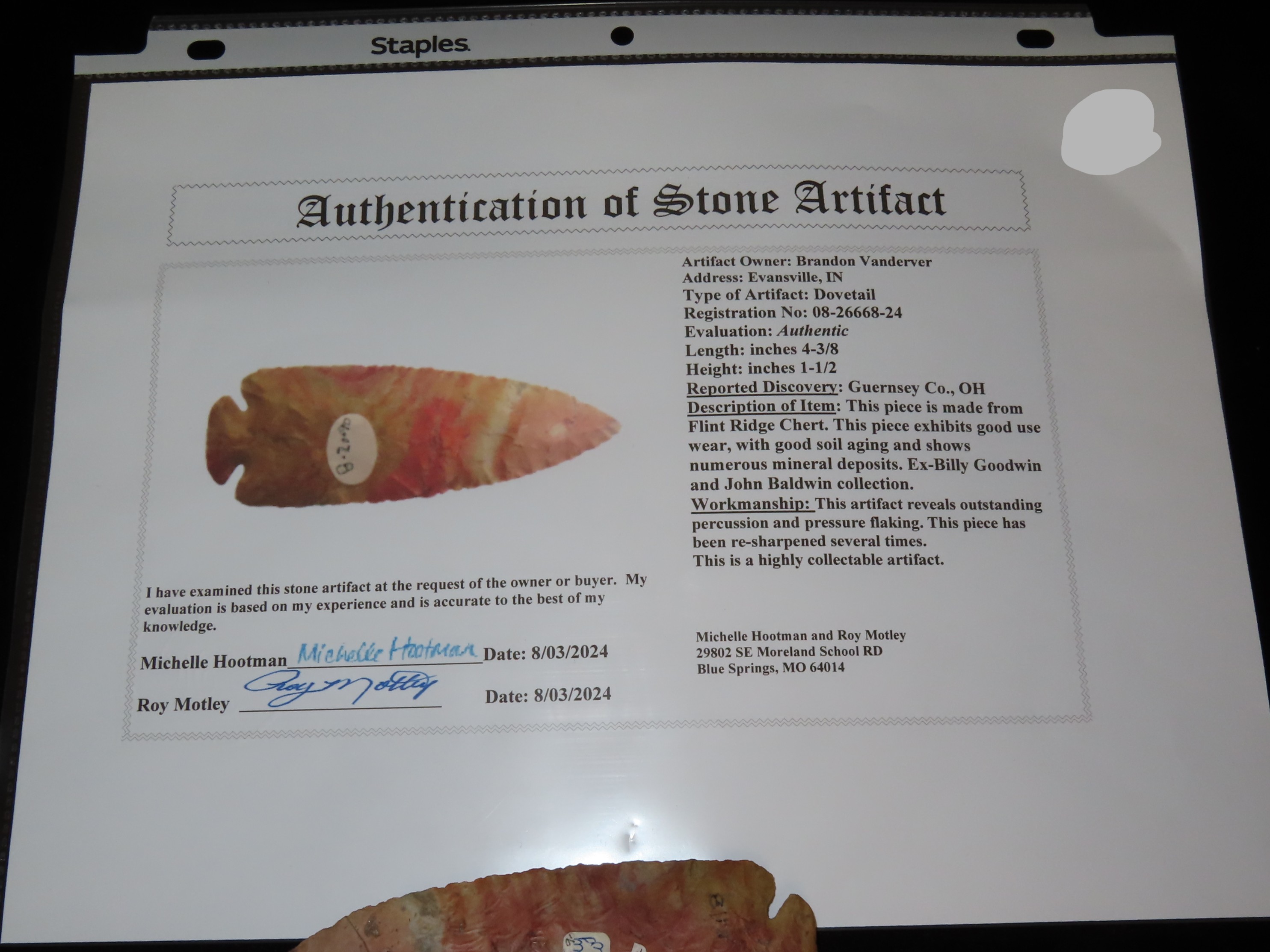 Colorful 4 3/8″ Flint Ridge Dovetail, Guernsey Co Ohio, Motley COA, Beautiful Material, ex Billy Goodwin, John Baldwin. Amazing Colors & Great Patina!
