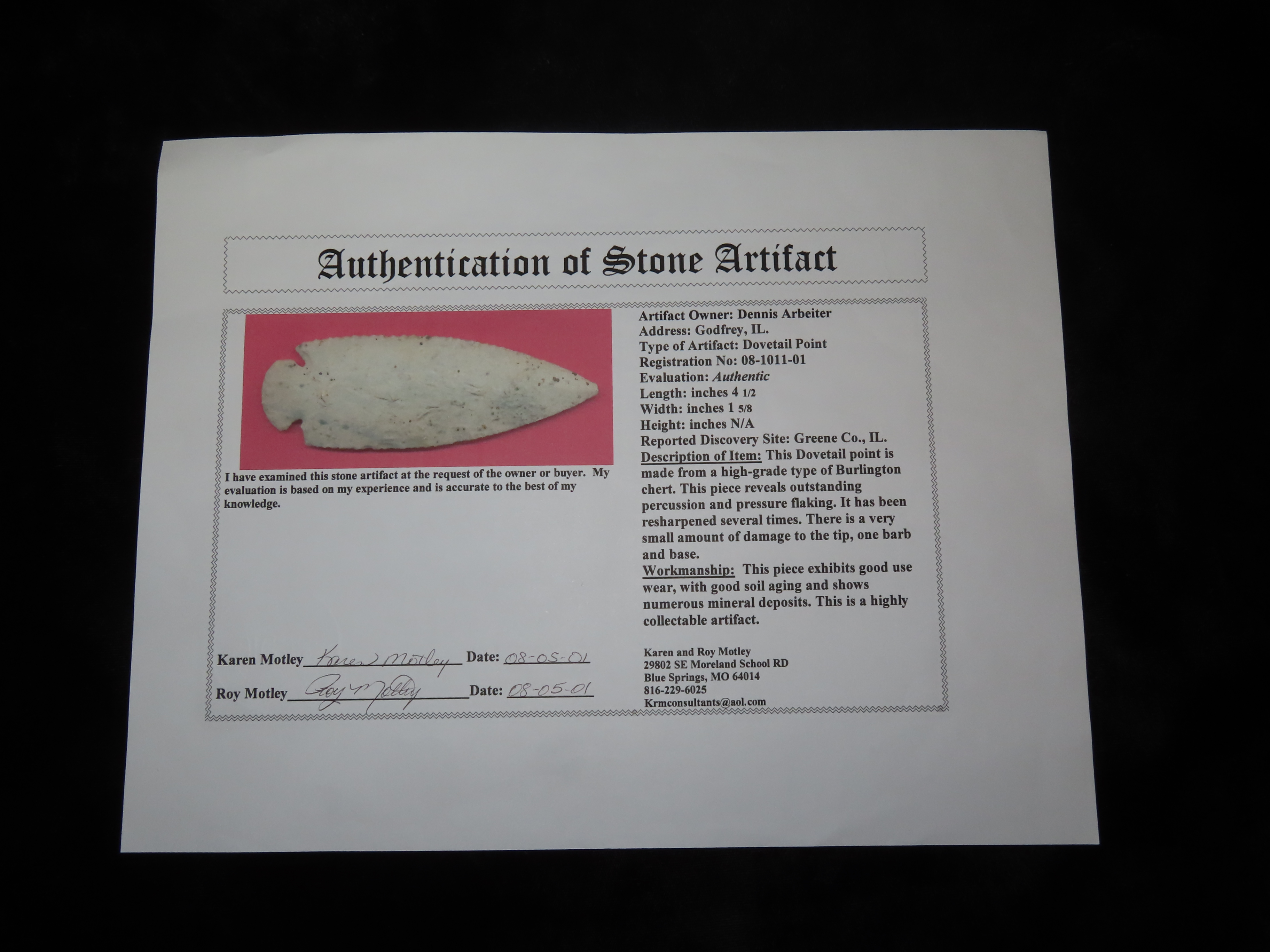 4 1/2″ White Dovetail, Motley COA, Found in Greene Co., Illinois, Exceptionally Fine Edgework