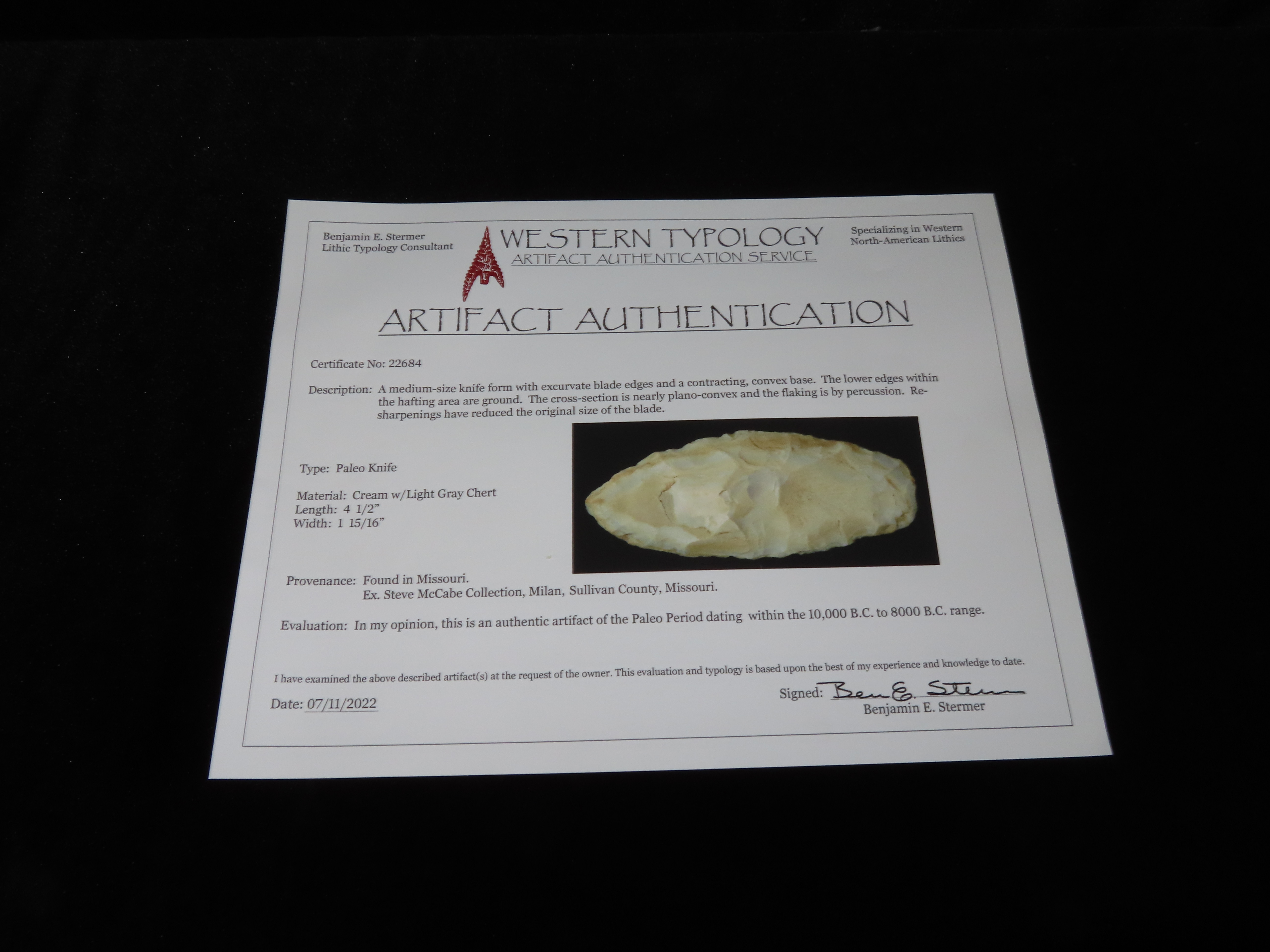 4 1/2″ Paleo Knife, Stermer COA, Found by Steve McCabe, Sullivan Co., Missouri