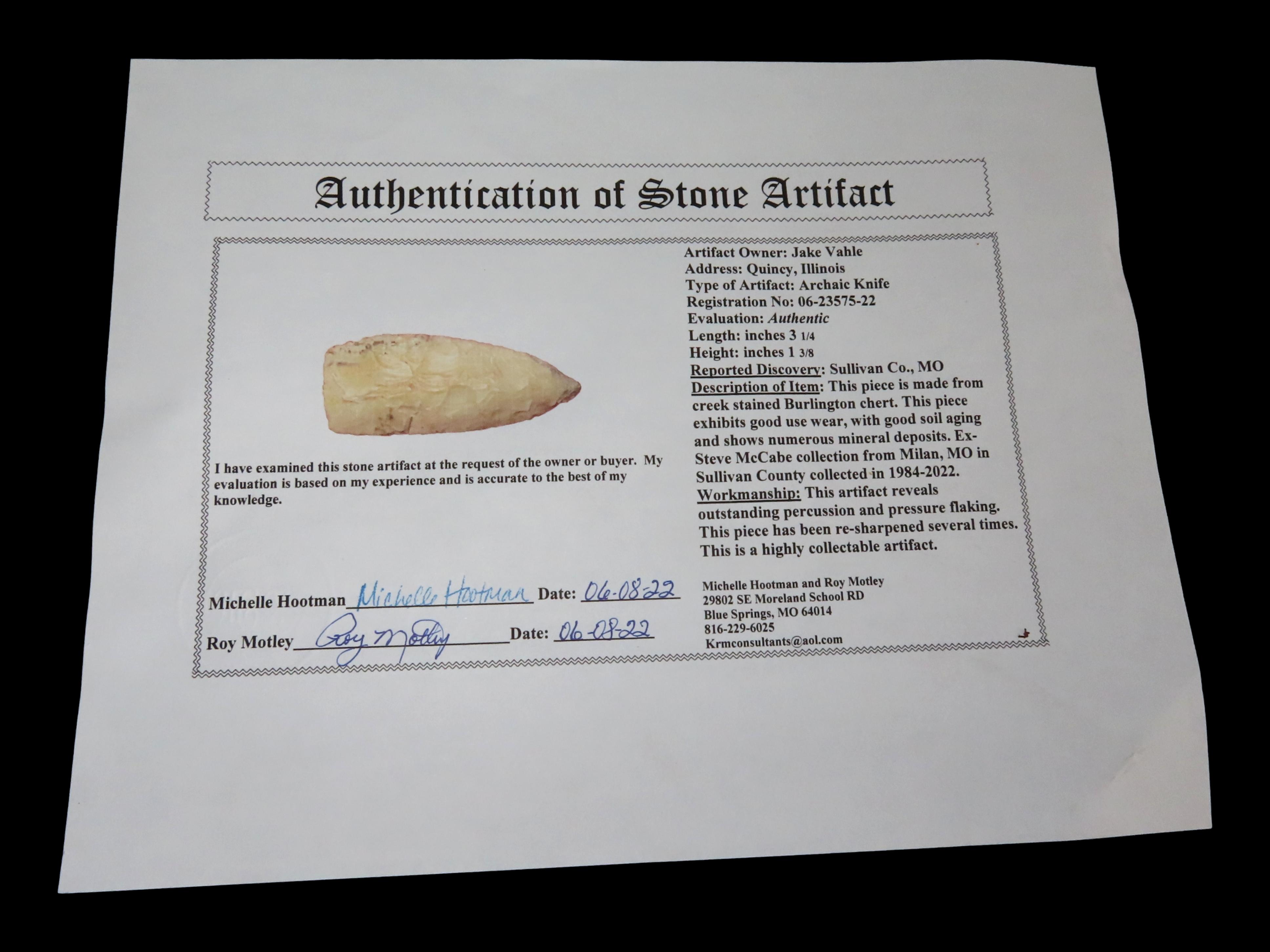 3 1/4″ Archaic Knife, Motley COA, Sullivan Co., Missouri