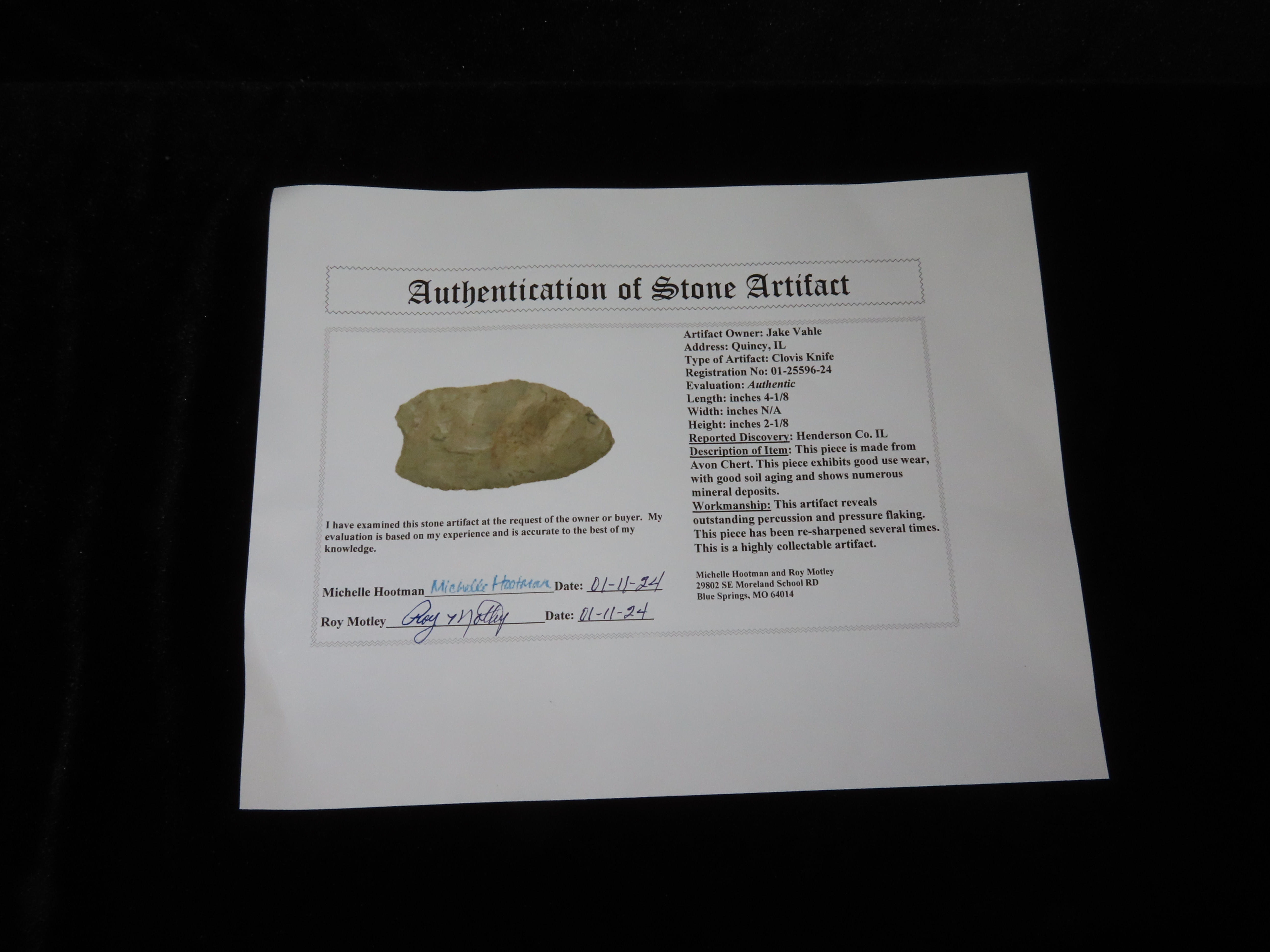 4 1/8″ Clovis Knife, Motley COA, Henderson Co., Illinois