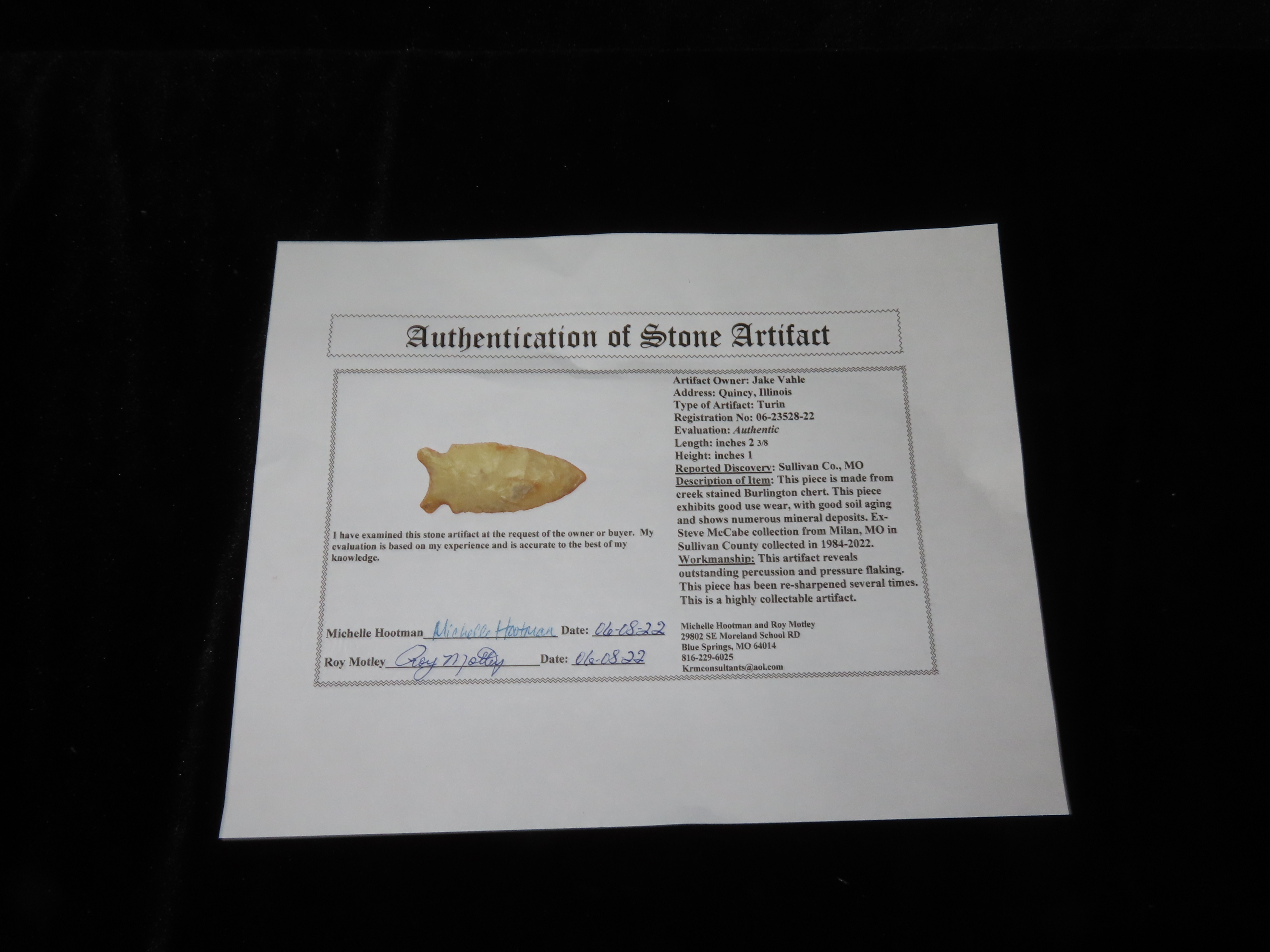 2 3/8″ Turin Pt., Motley COA, EX Steve McCabe, Sullivan Co., Missouri