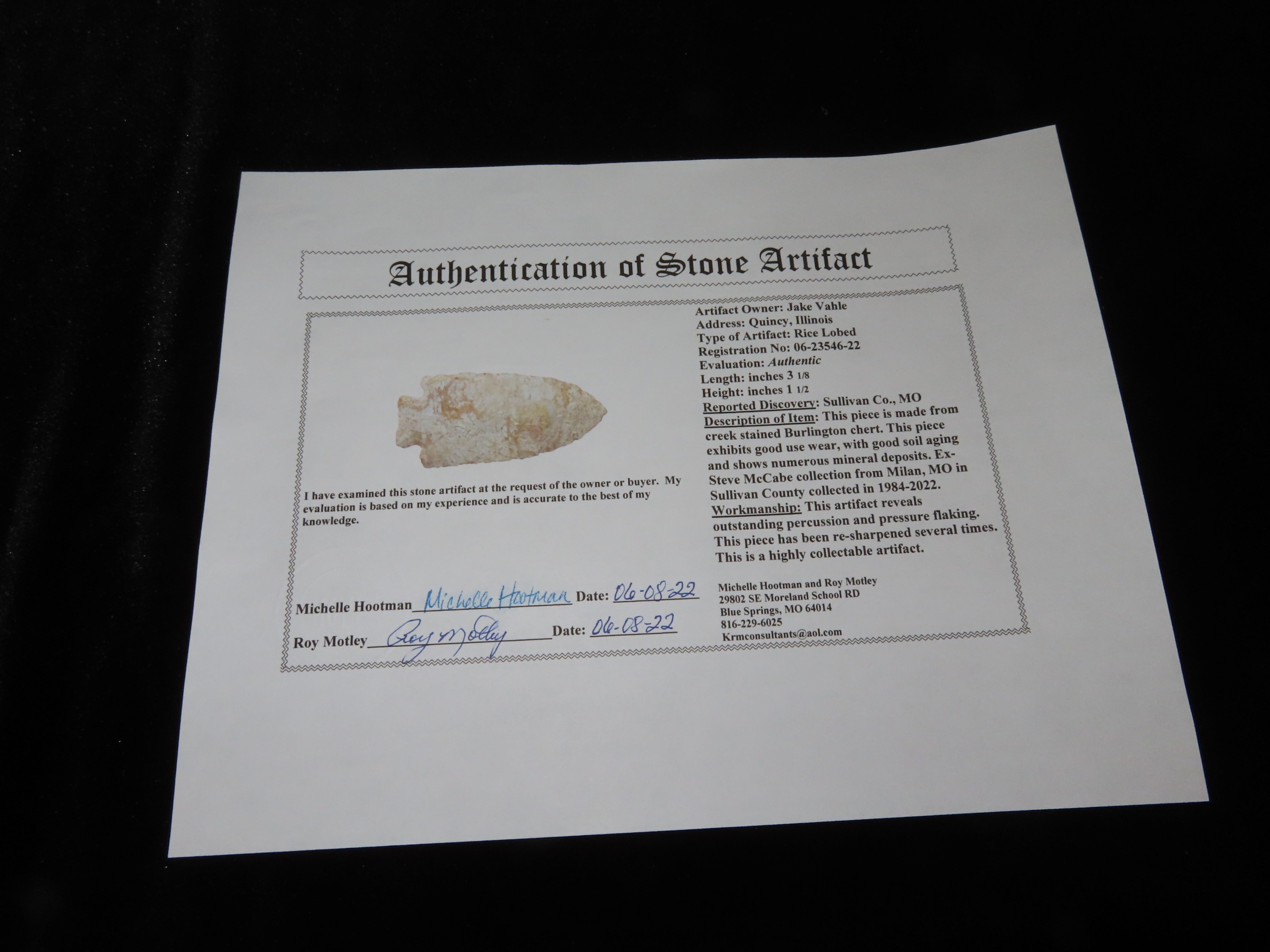 3 1/8″ Rice Lobbed Pt., Motley COA, EX Steve McCabe, Sullivan Co., Missouri
