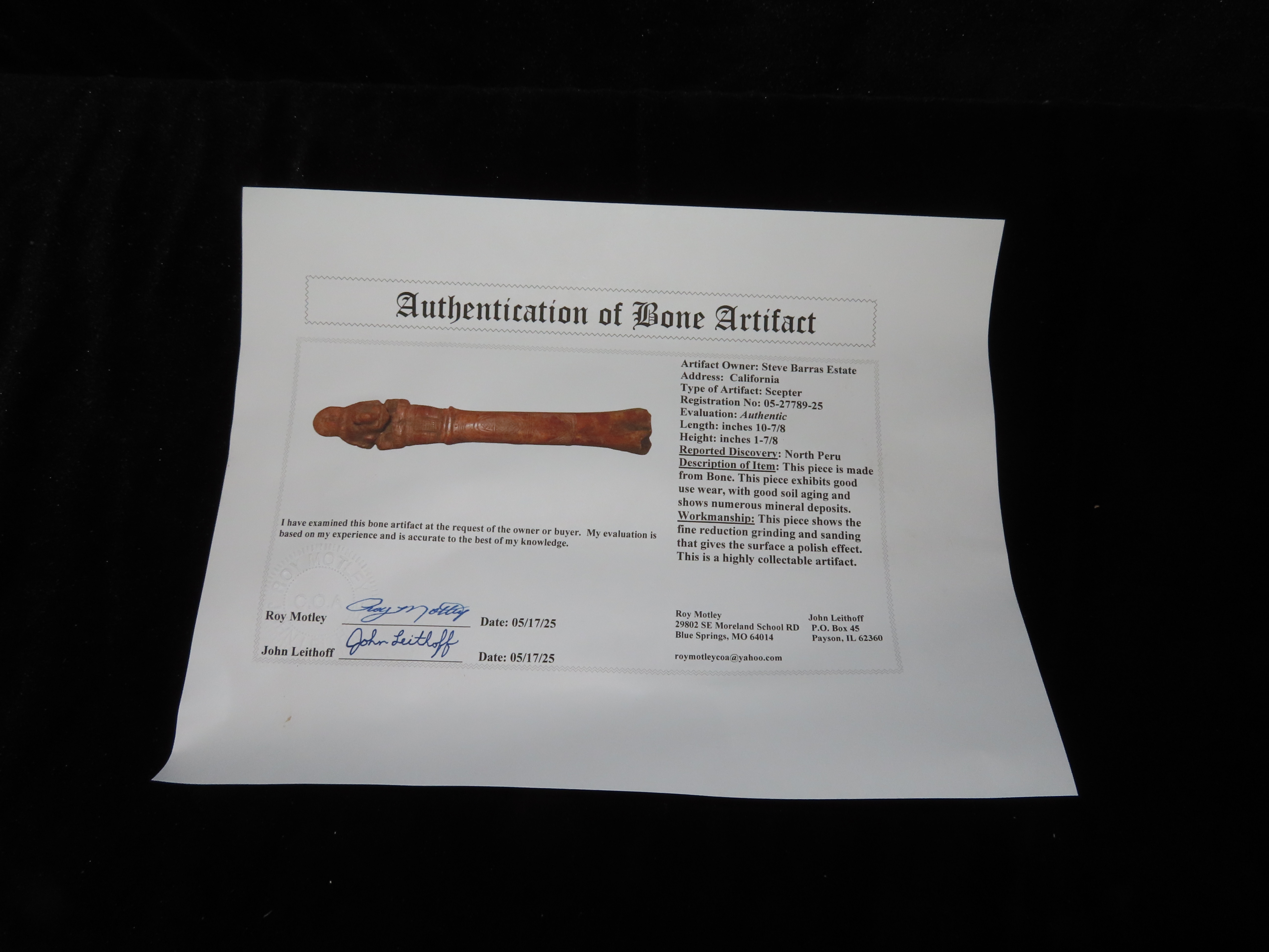 10 7/8″ X 1 7/8″ Scepter, Motley COA, North Peru