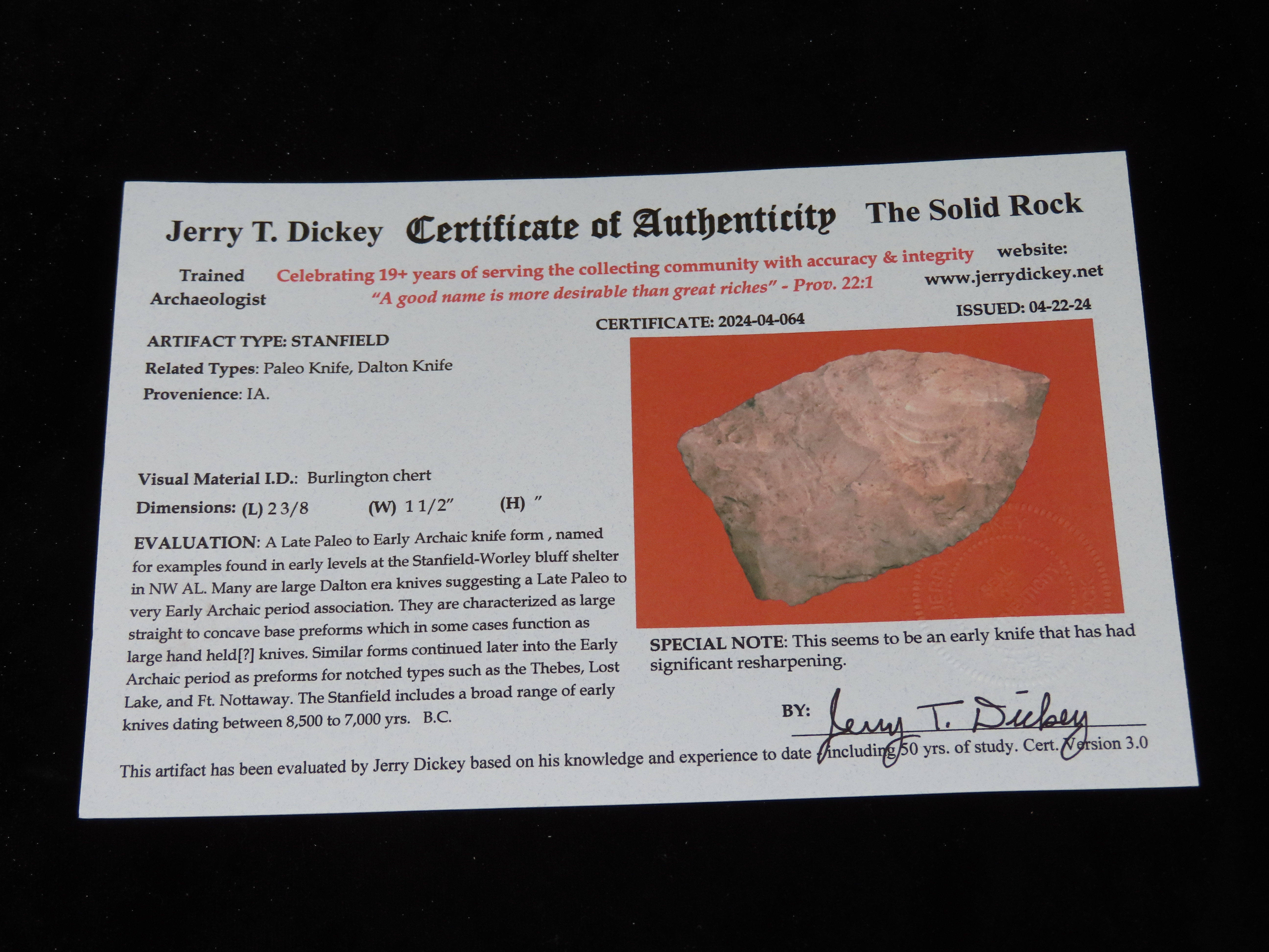 2 3/8″ Paleo Knife, Dalton Knife, Dickey COA, Found in Iowa