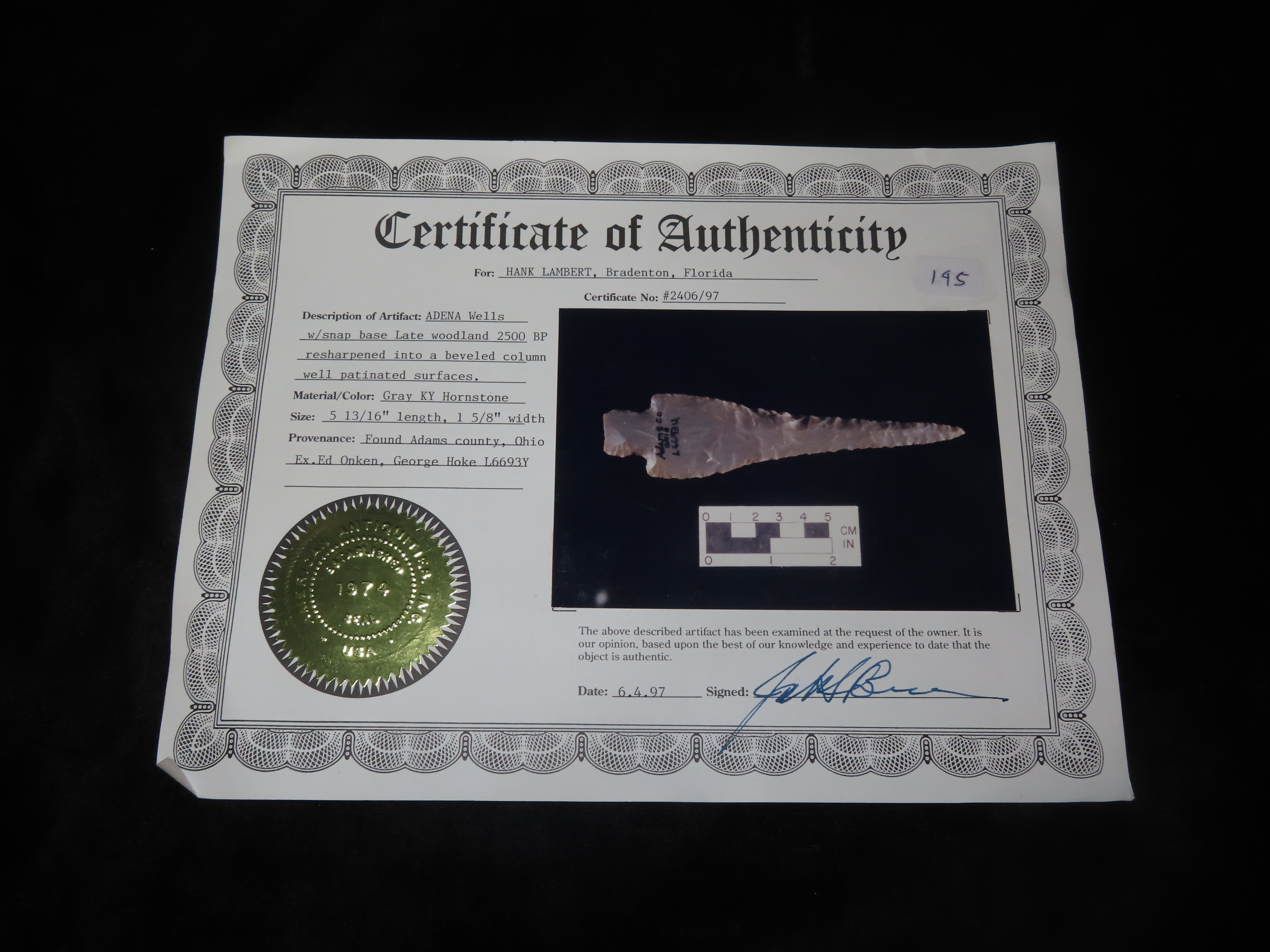 5 3/16″ Adena Wells w/snap base, American Antiquities Inc. COA, Late Woodland 2500 BP, EX Ed Onken, George Hoke, Adams Co., Ohio
