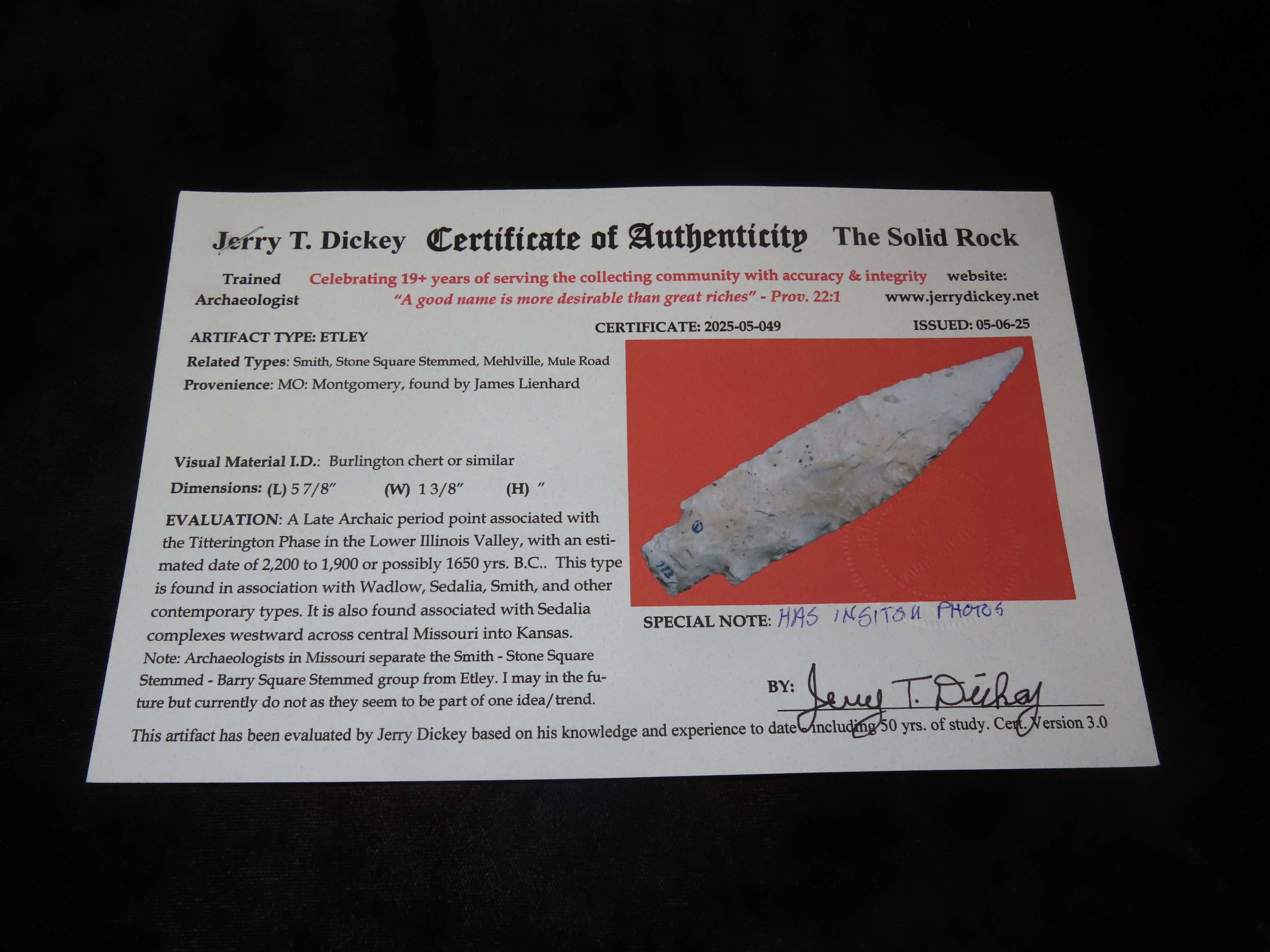 5 7/8″ Etley, Dickey COA, Found by James Lienhard, Montgomery, Missouri