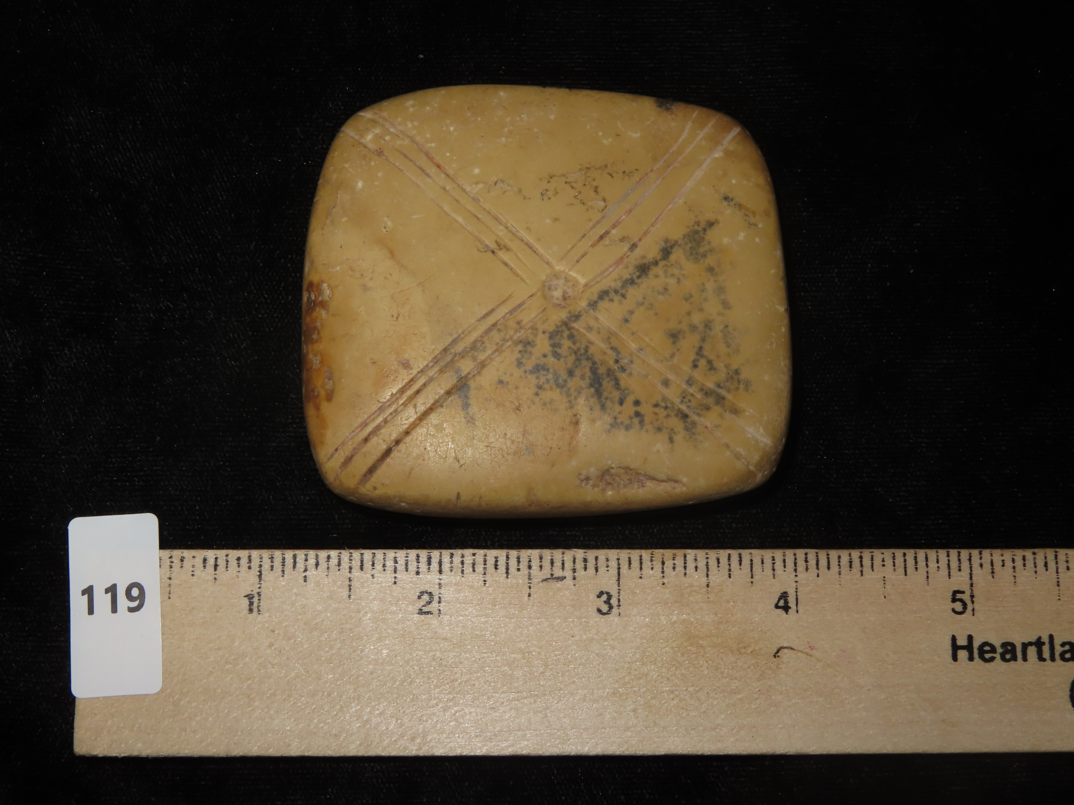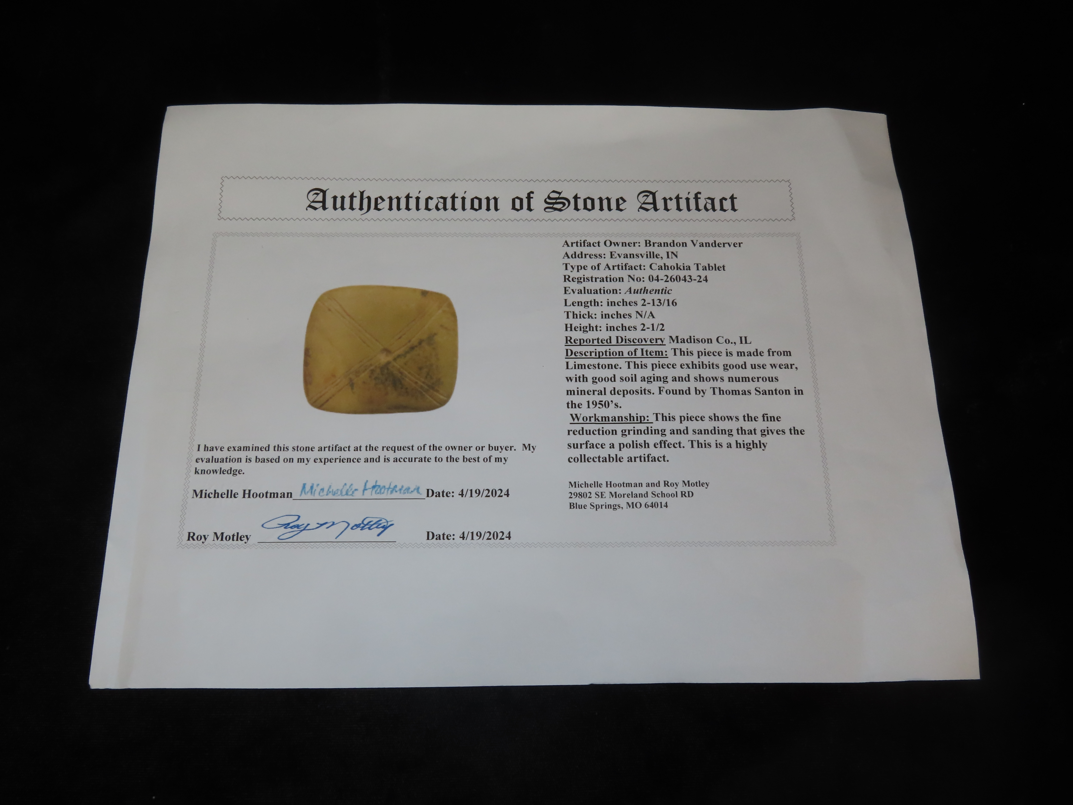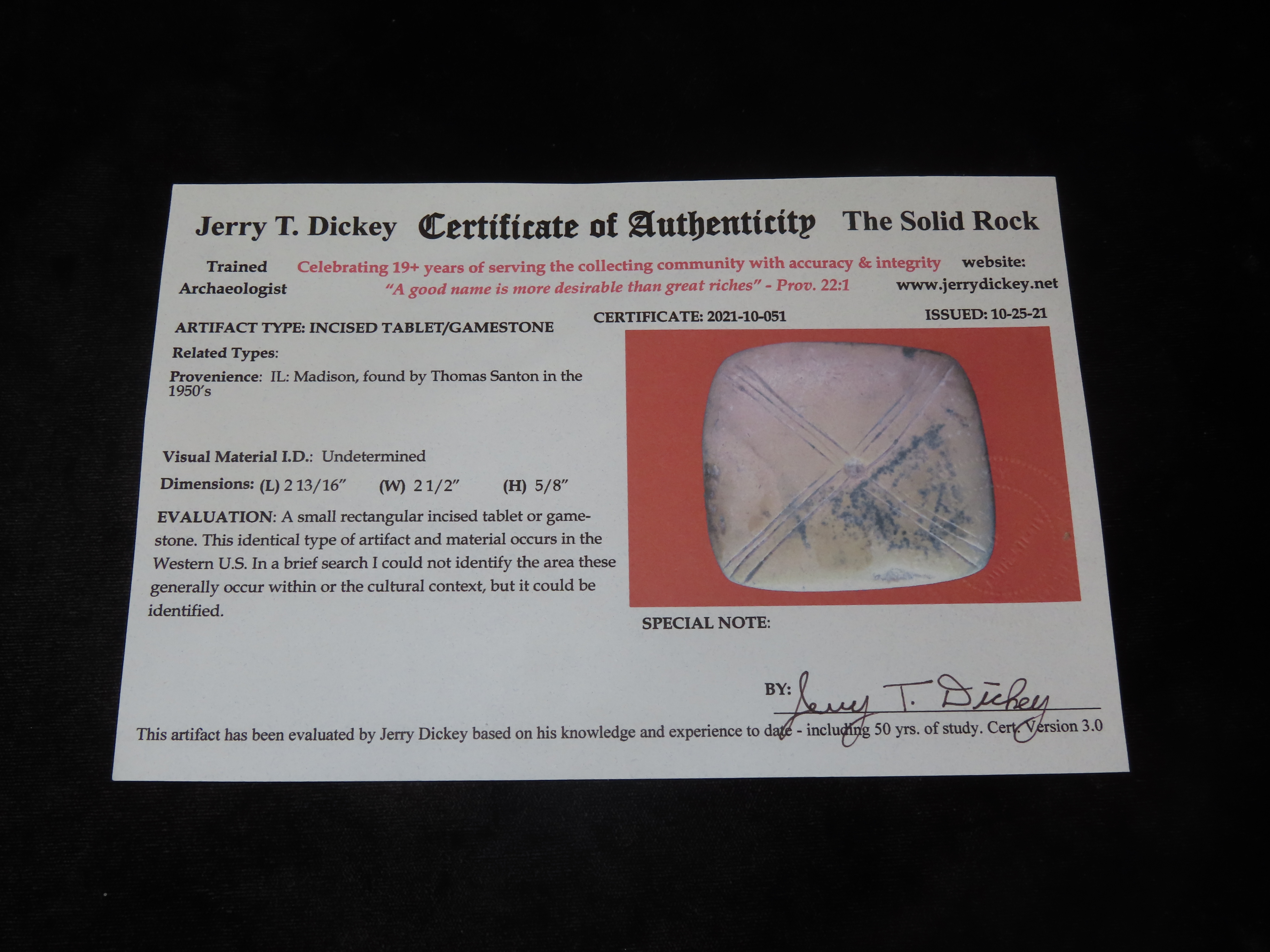 2 13/16″ Incised Tablet/Gamestone,2x COA- Dickey/Motley, Found by Thomas Santon in the 1950’s, Madison, Illinois