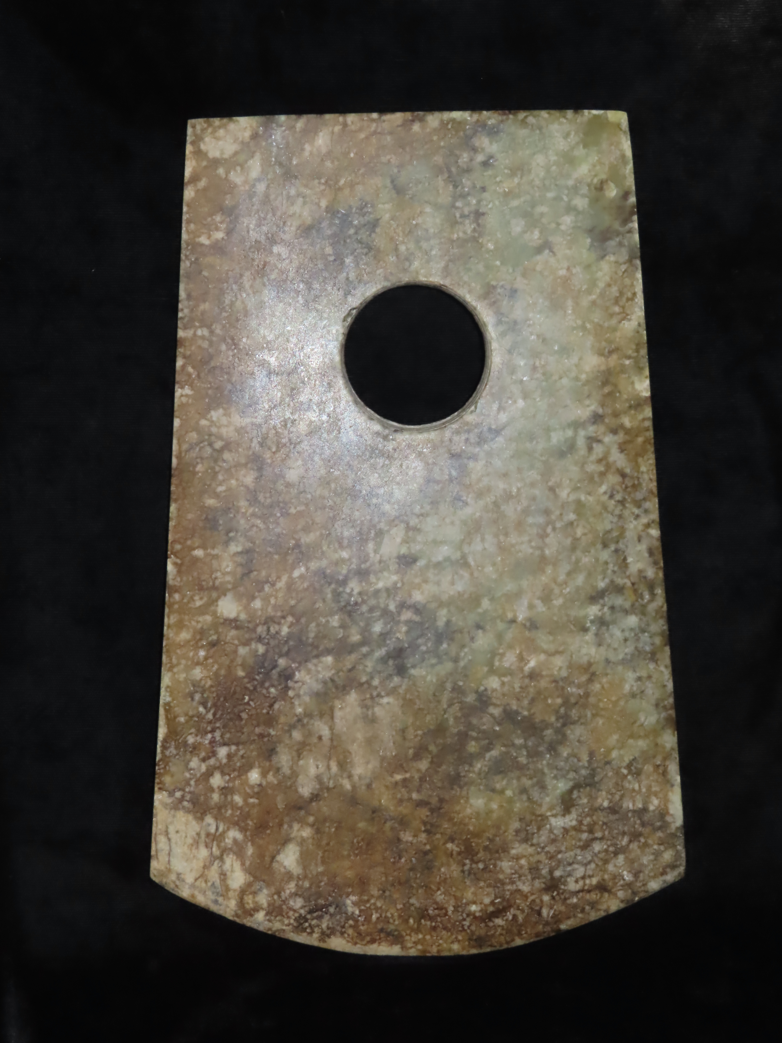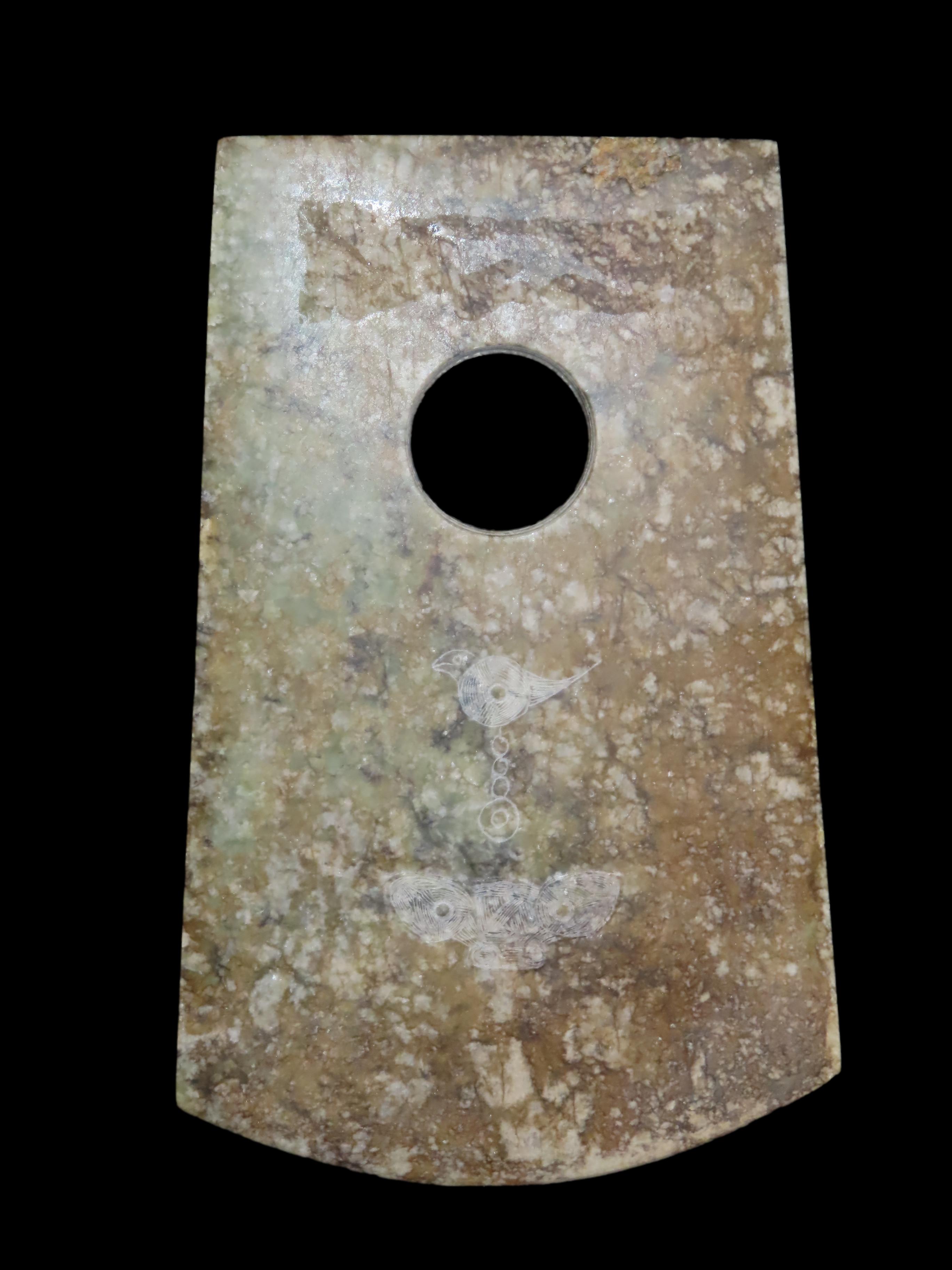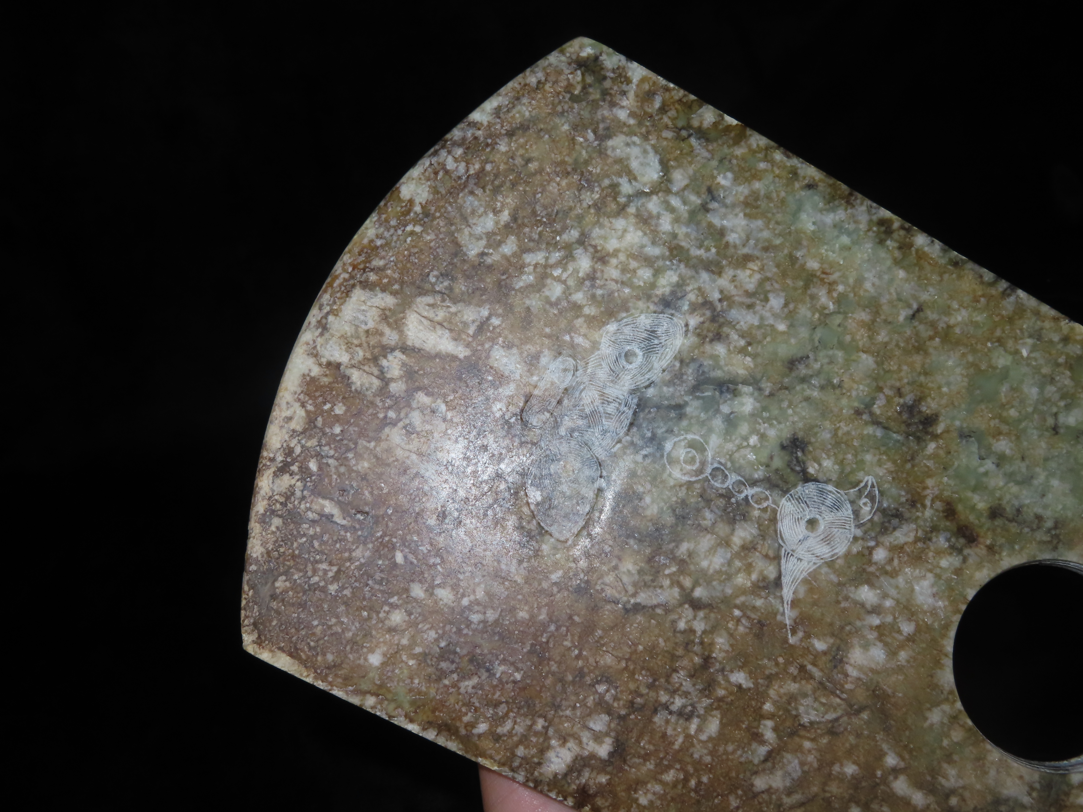 Chinese Neolithic Period Jade Axe with motif of the Liang Zhu Culture, 3500-2000 BC, Excavated in Zhejian Province in Southeastern China, Herb Mangold Collection, Quincy, Illinois