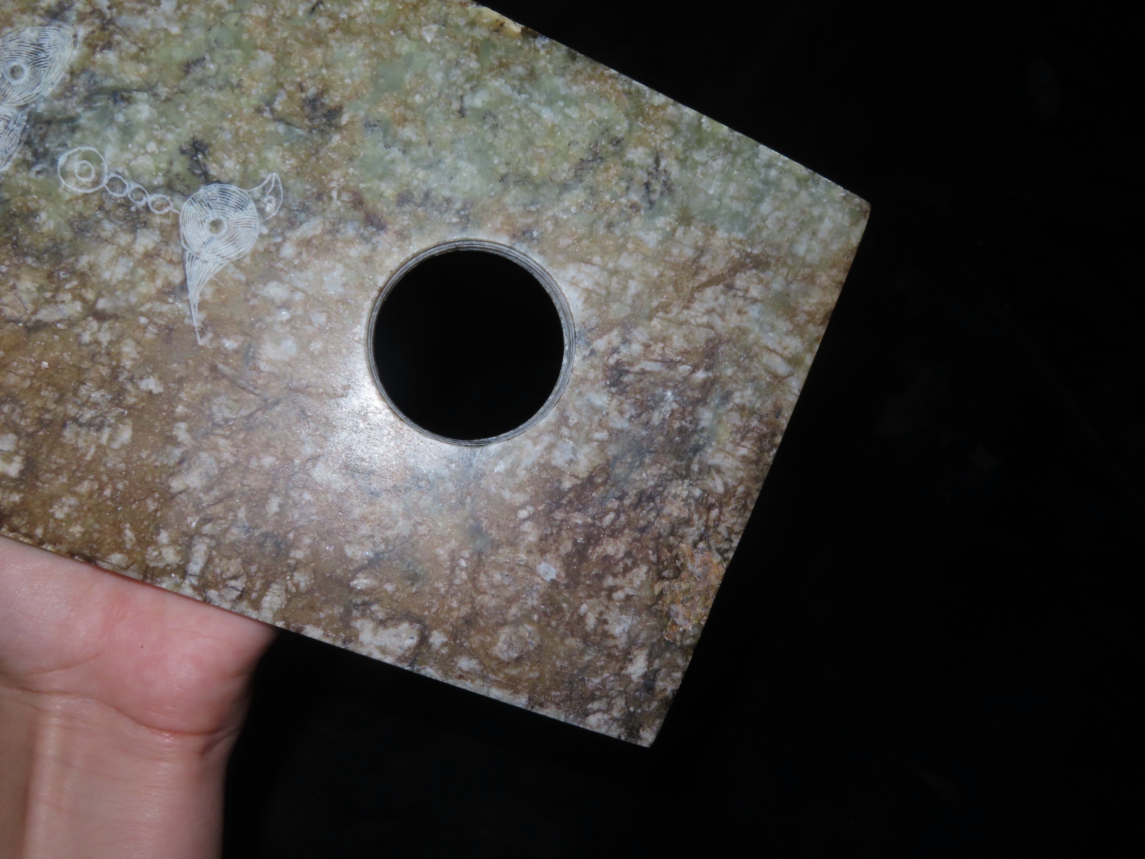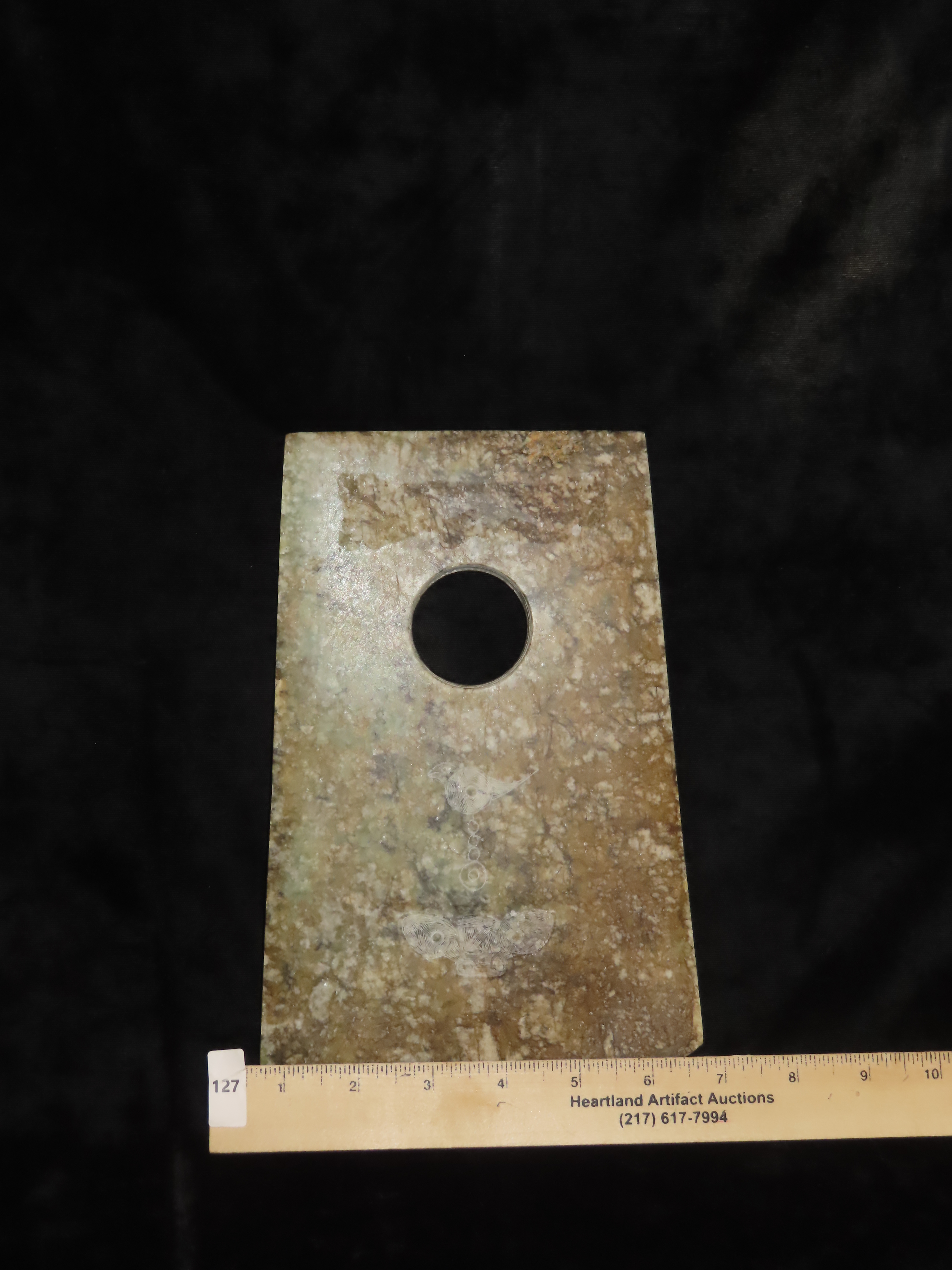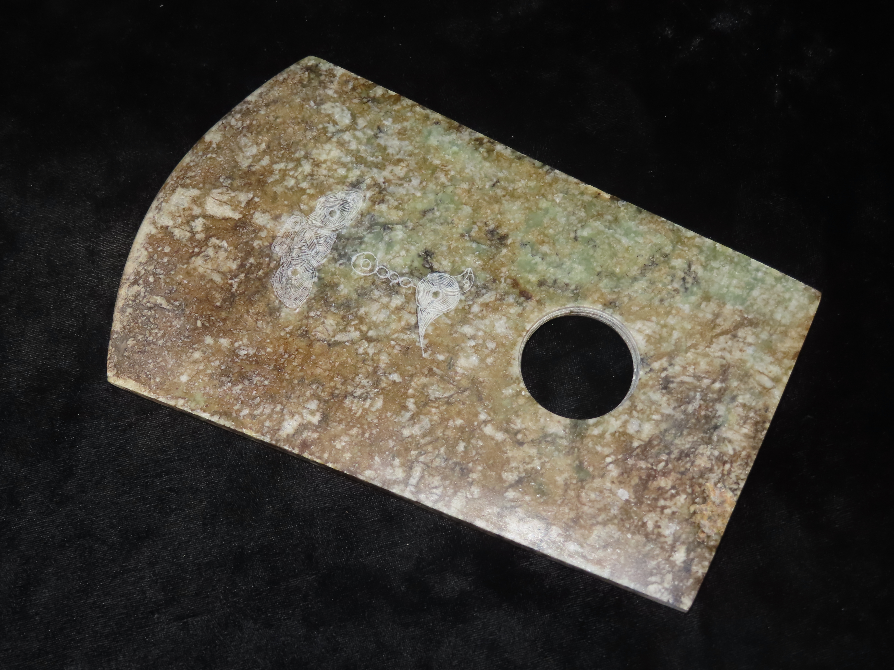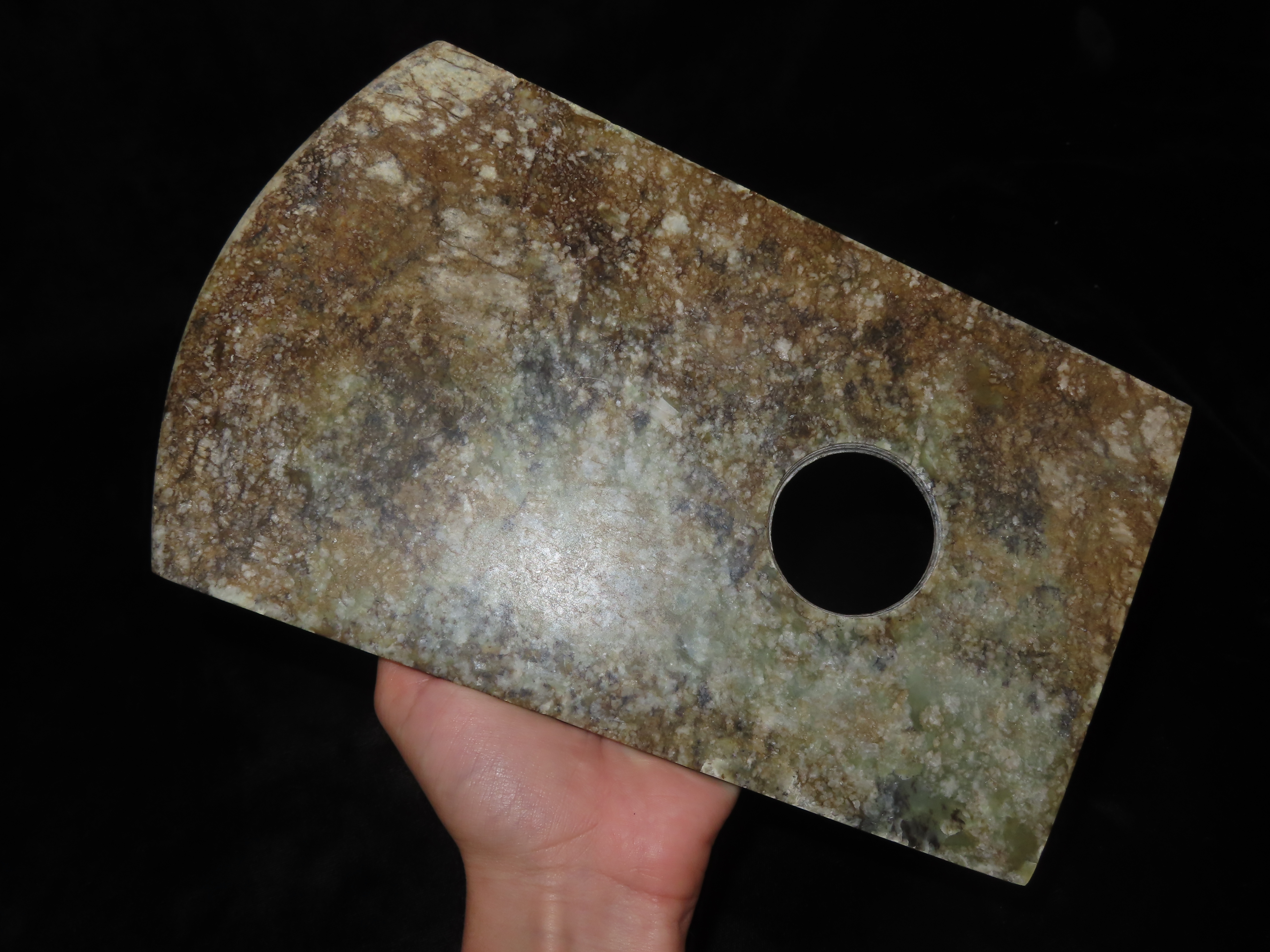 Chinese Neolithic Period Jade Axe with motif of the Liang Zhu Culture, 3500-2000 BC, Excavated in Zhejian Province in Southeastern China, Herb Mangold Collection, Quincy, Illinois