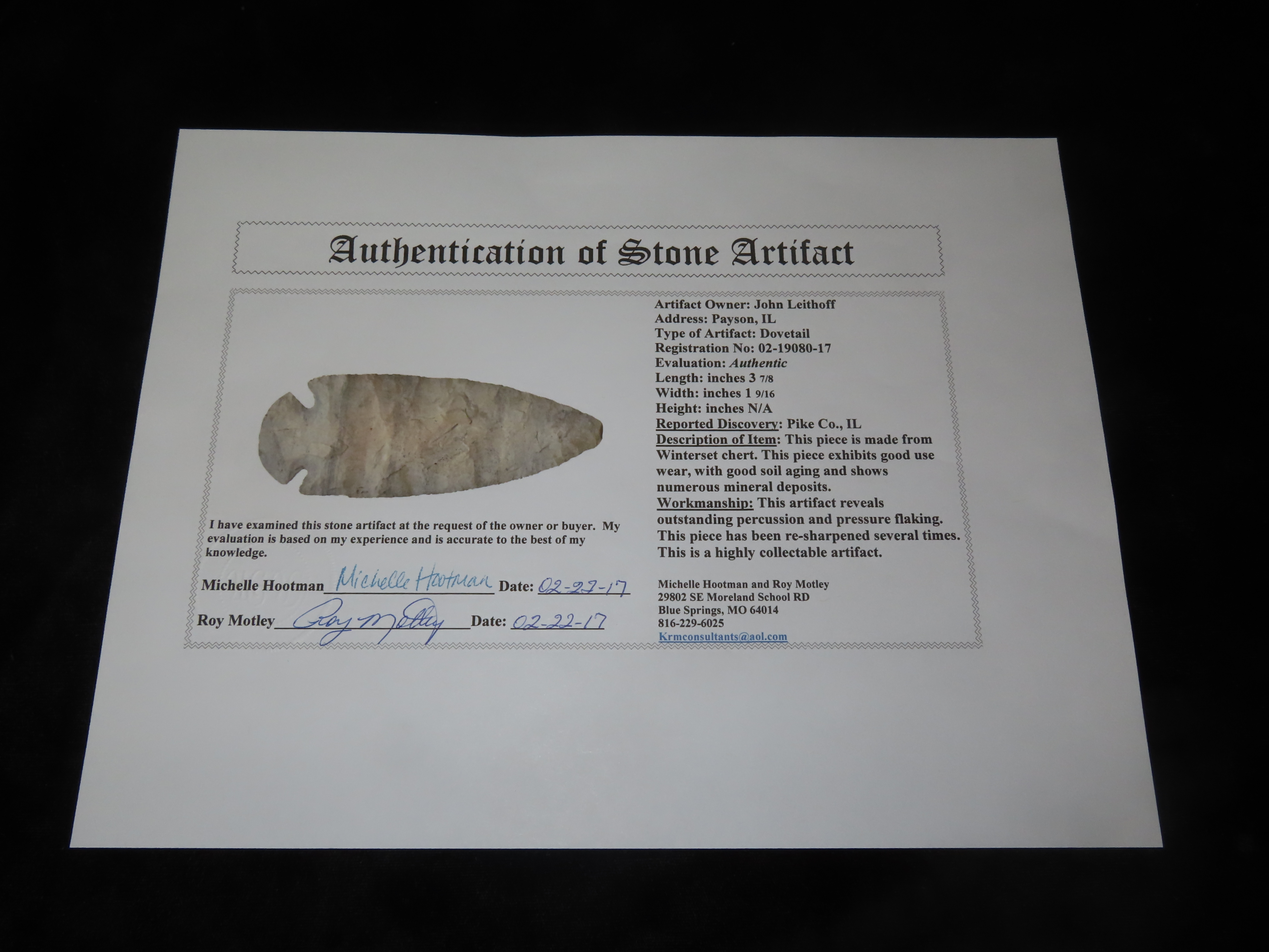 3 7/8″ Dovetail, Motley COA, Pike Co., Illinois