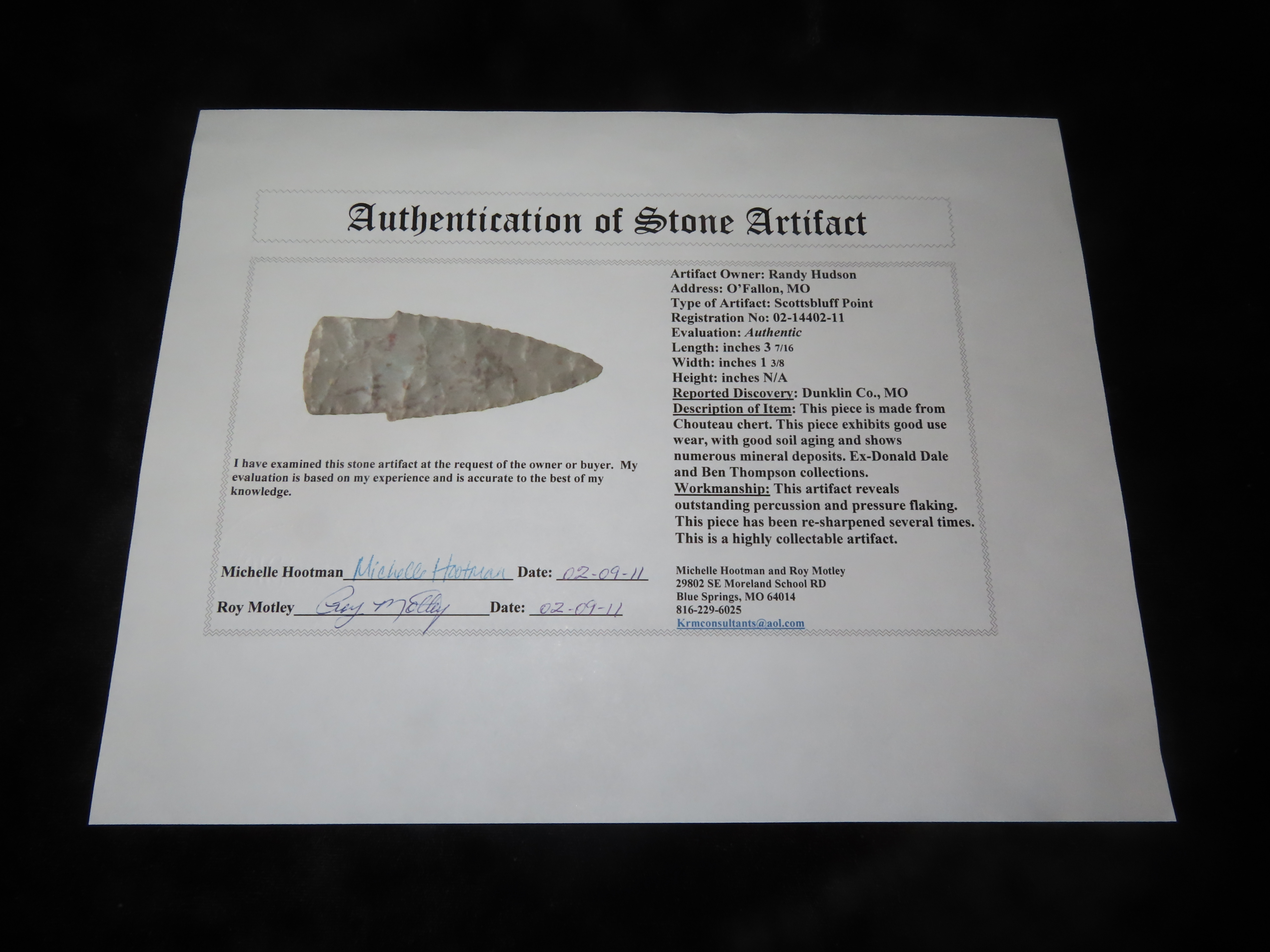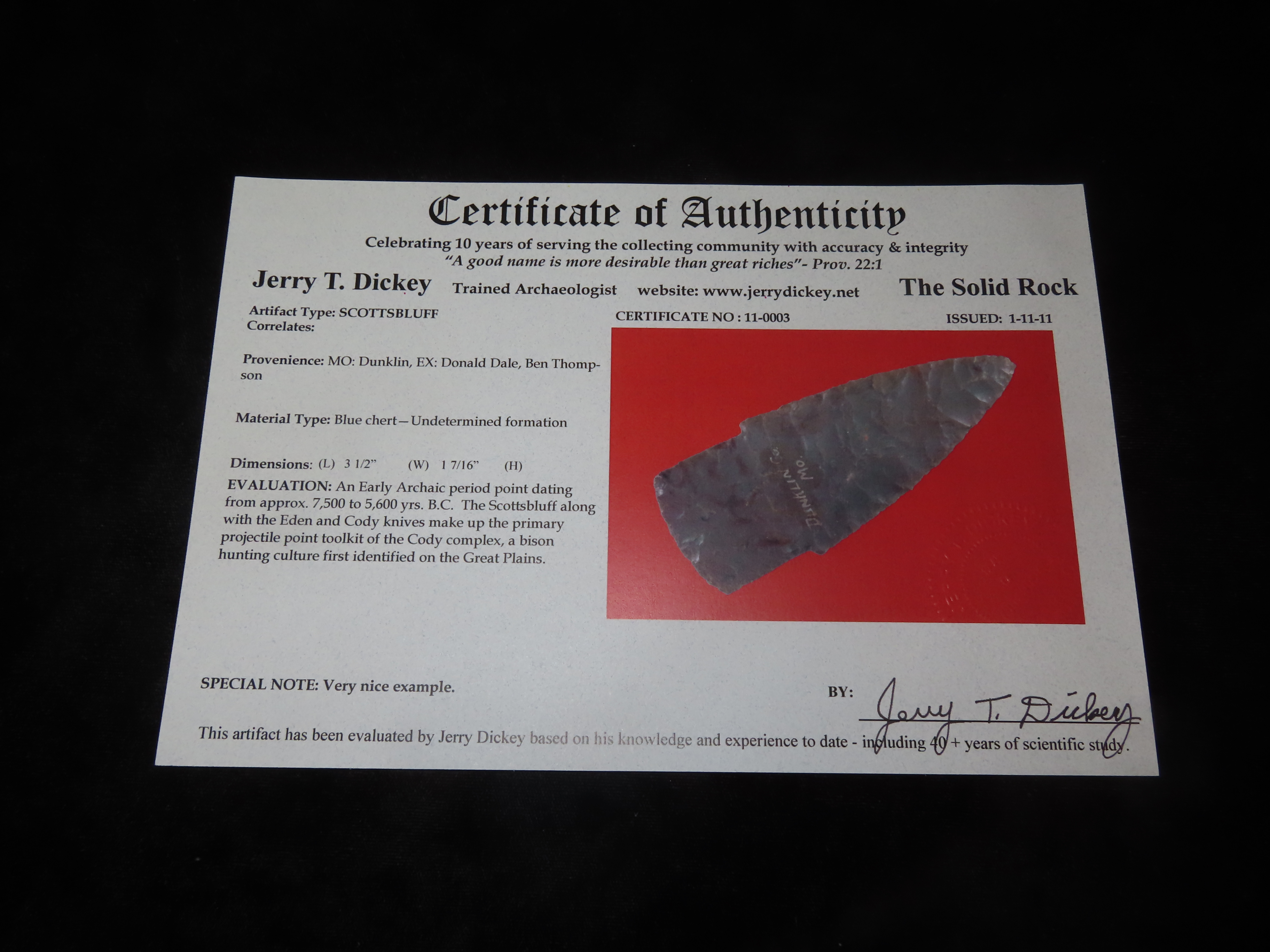 3 1/2″ Scottsbluff, 2x COA- Dickey/Motley, found in Dunklin Co., Missouri, EX Donald Dale, Ex Ben Thompson Collections
