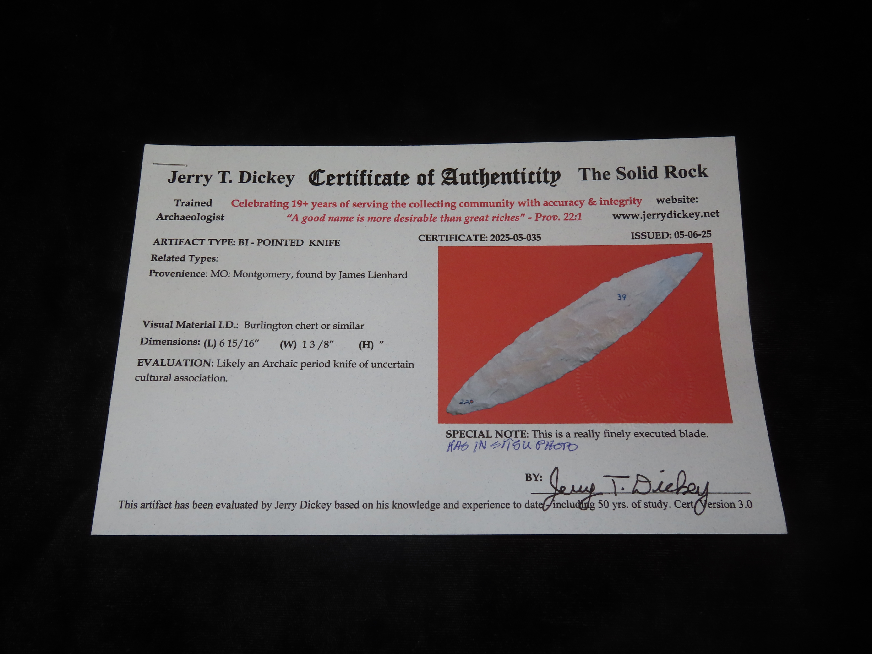 6 15/16″ Bi-Pointed Knife, Dickey COA, Found by James Lienhard, Montgomery Co., Missouri