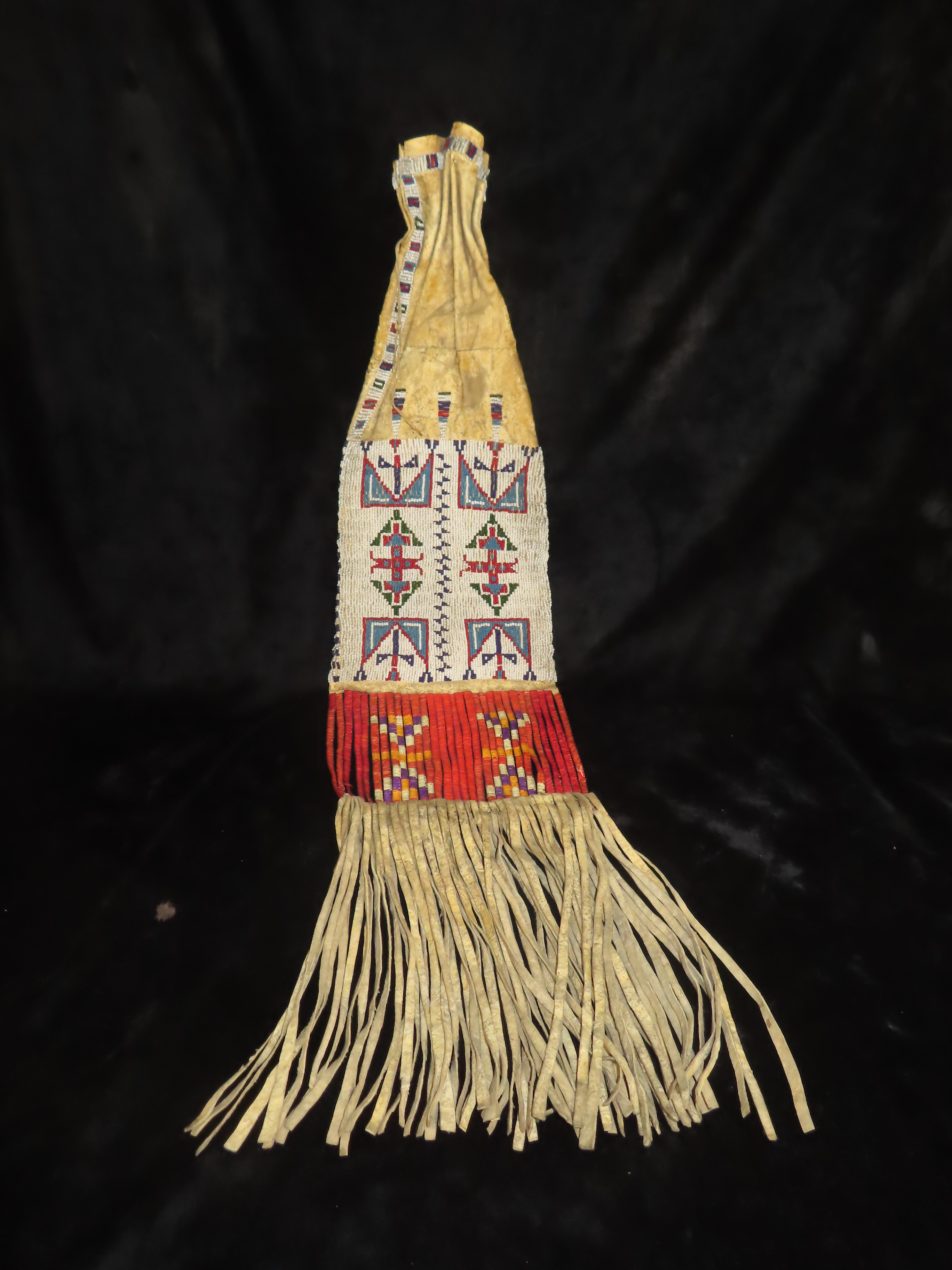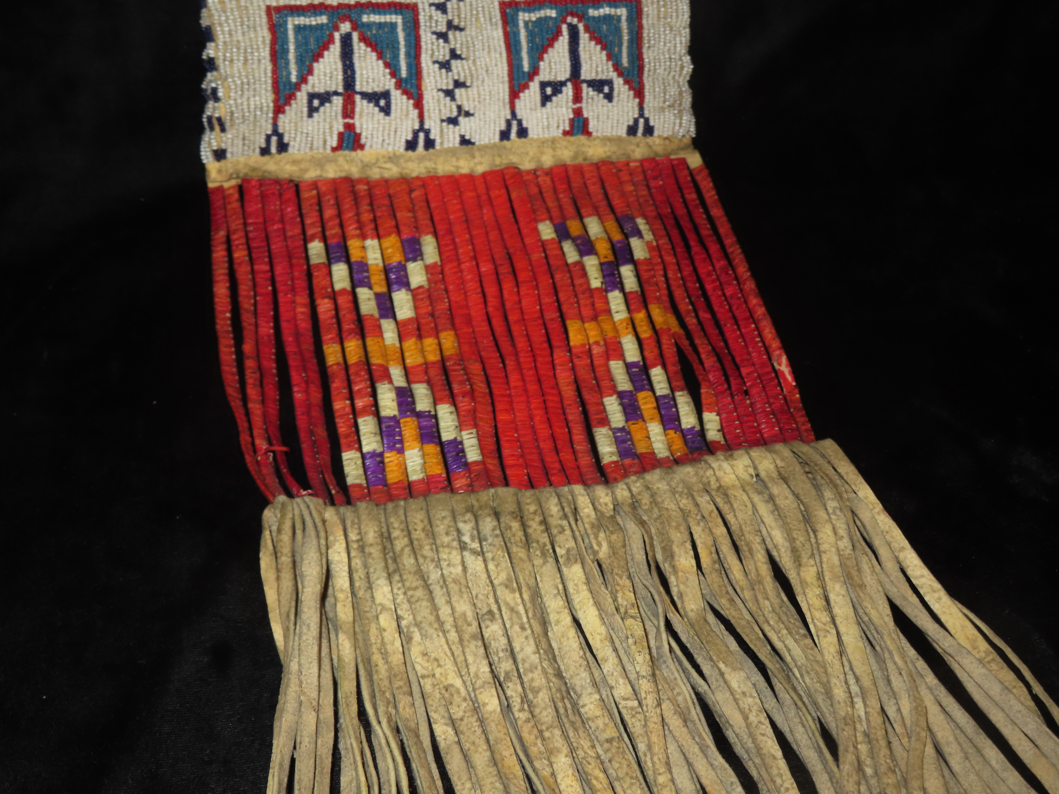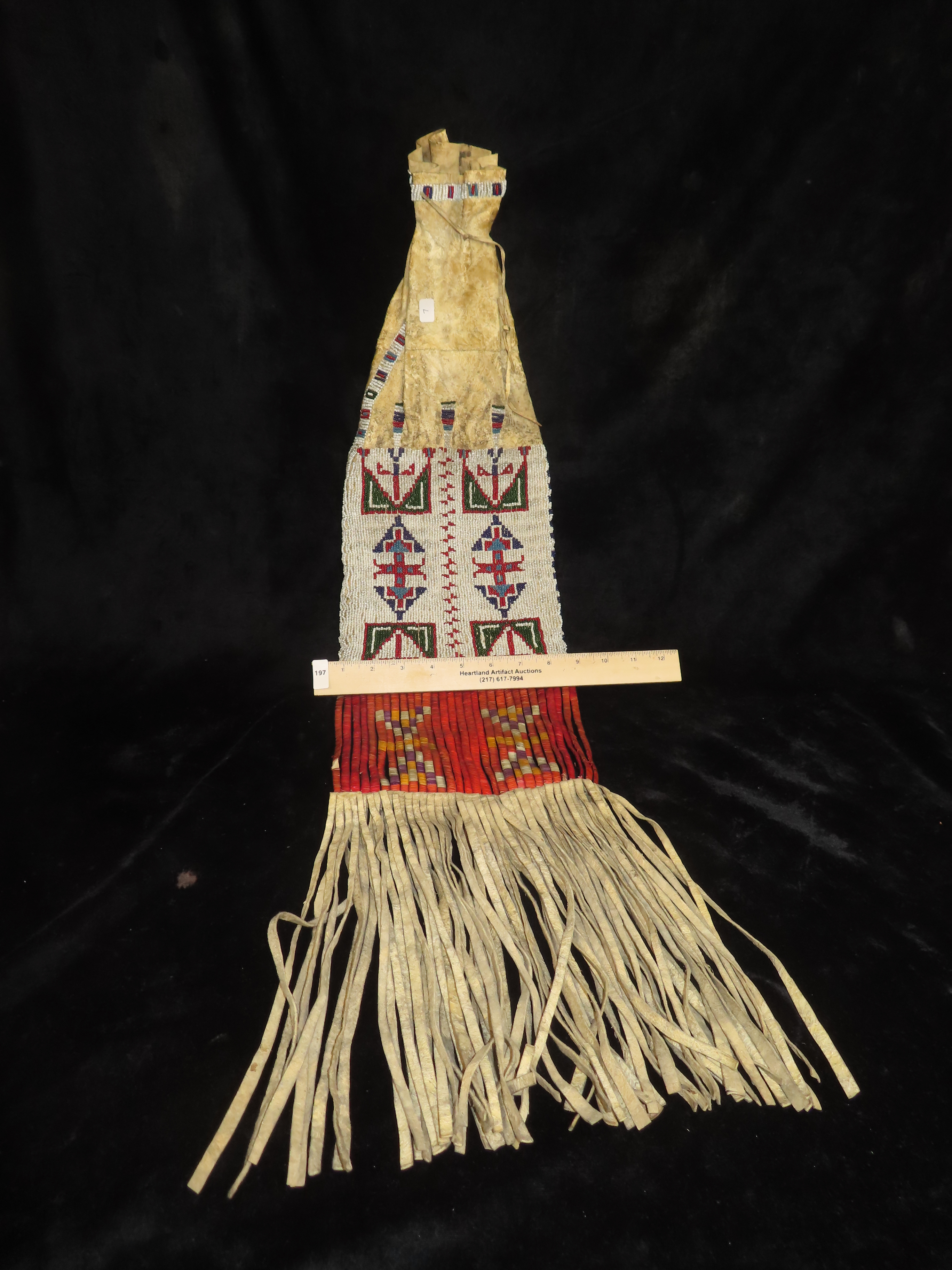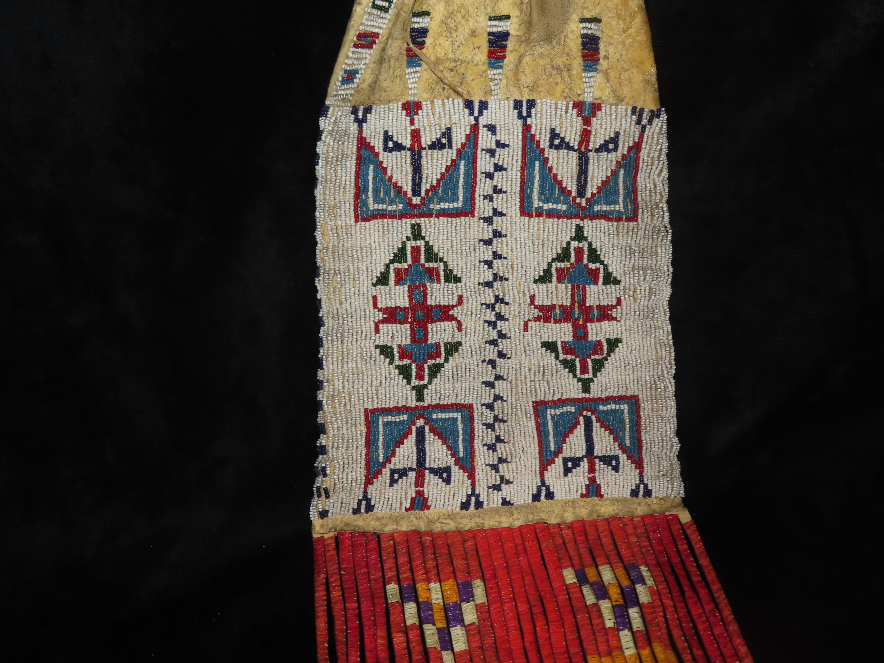 34 7/8″ Beaded and Fringed Sioux Pipe Bag, c. 1890-1910, This bag is in phenomenal shape with minor quill loss. Ex Scott Caruthers Collection