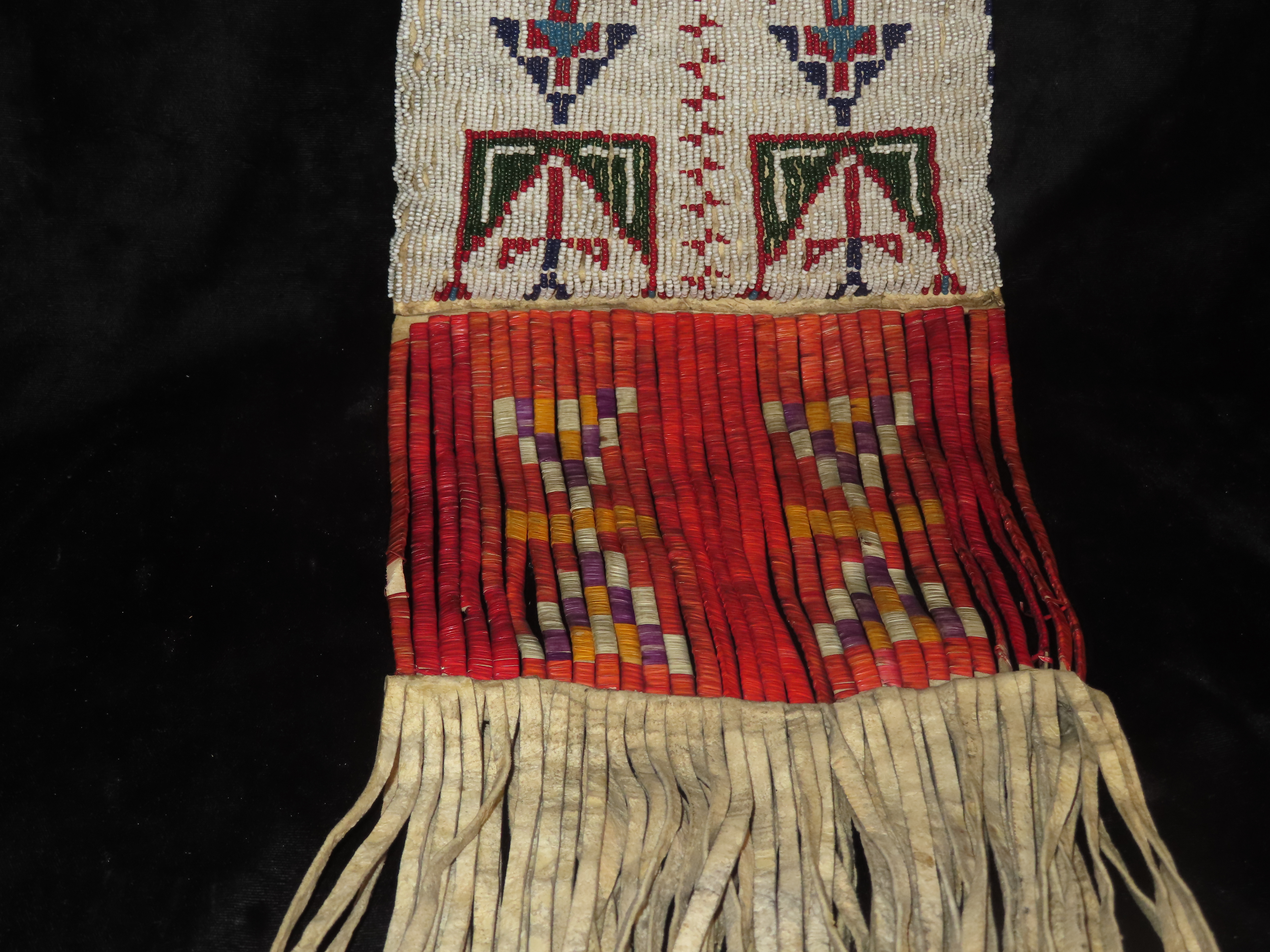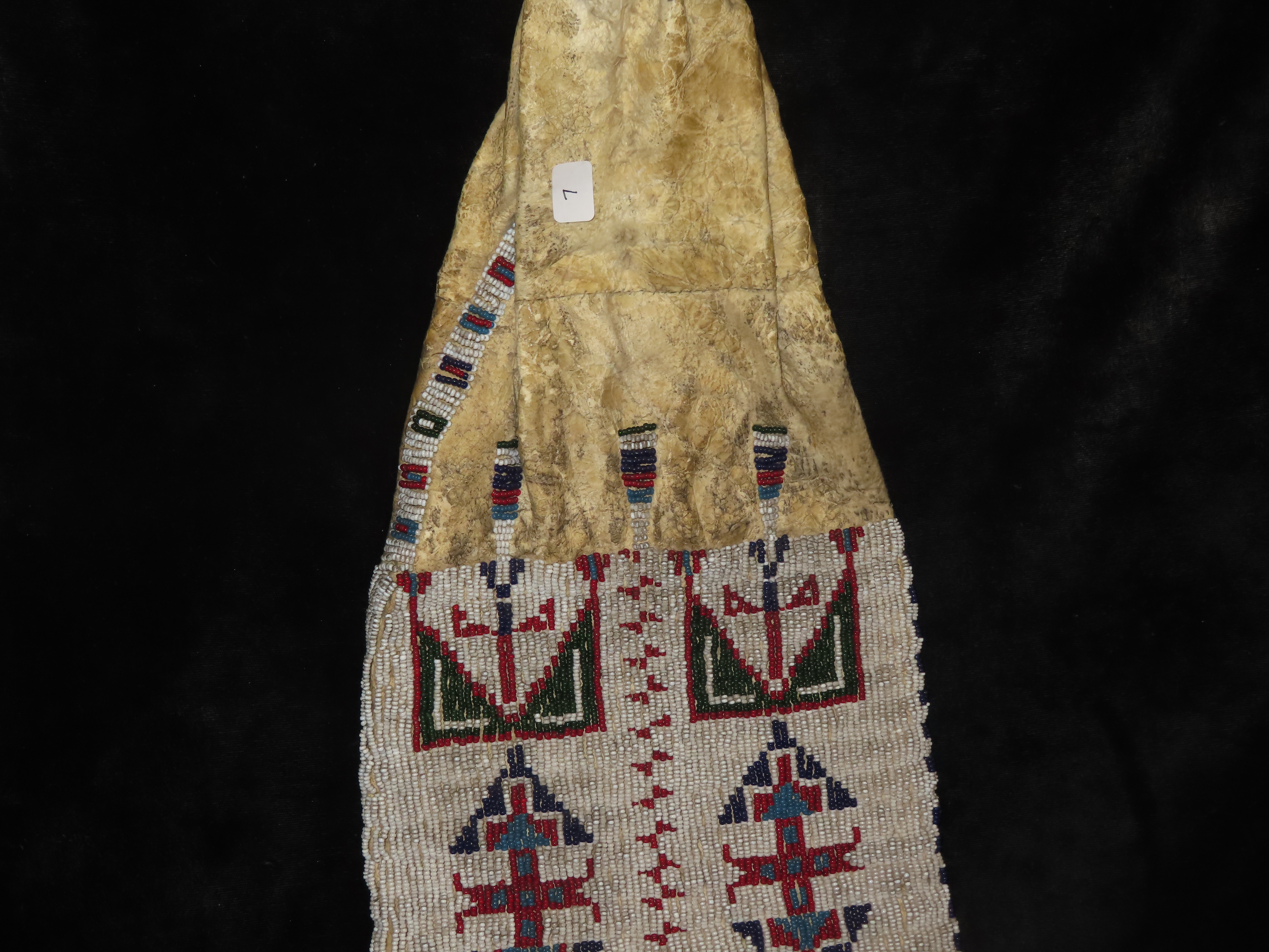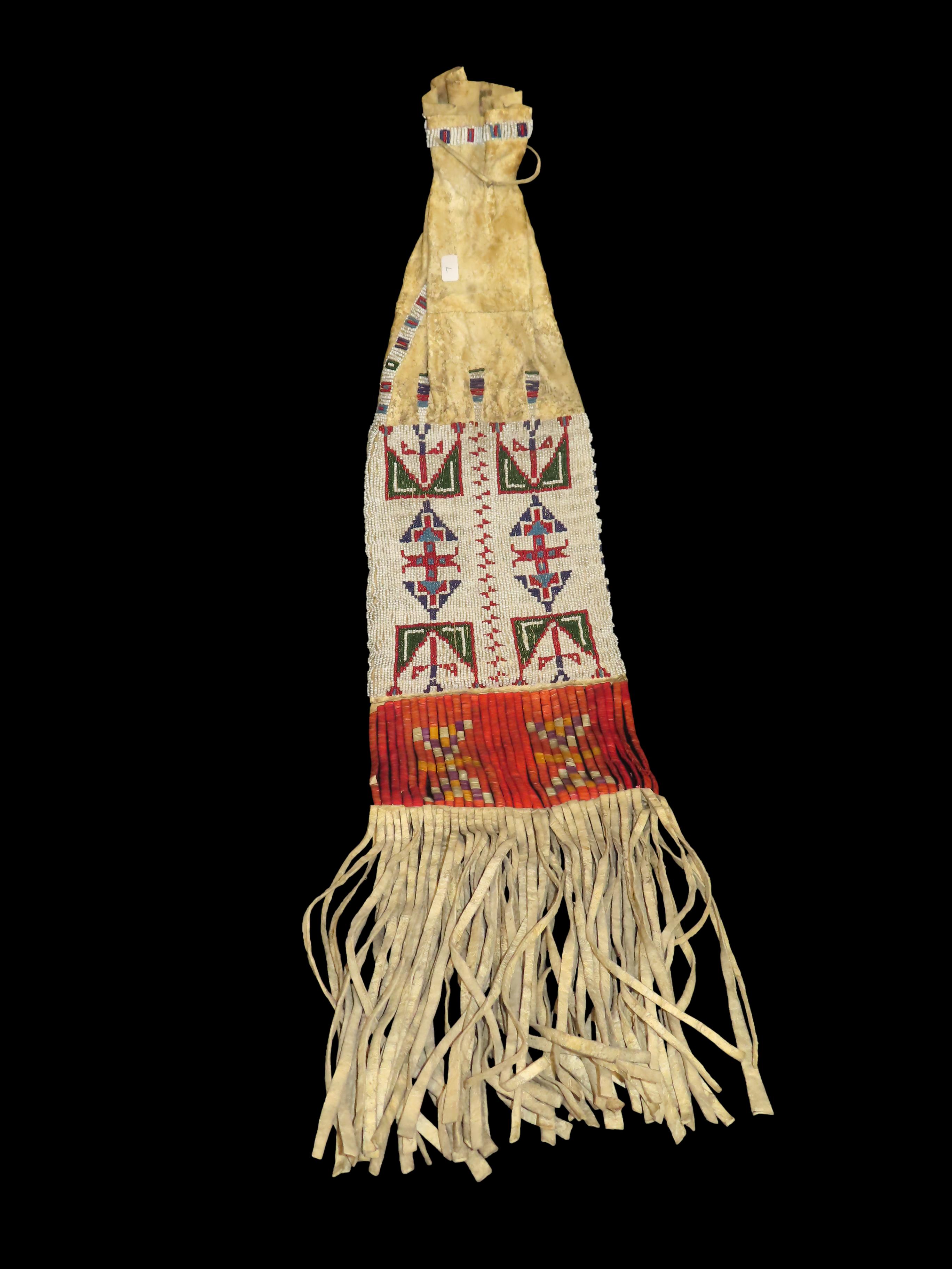 34 7/8″ Beaded and Fringed Sioux Pipe Bag, c. 1890-1910, This bag is in phenomenal shape with minor quill loss. Ex Scott Caruthers Collection