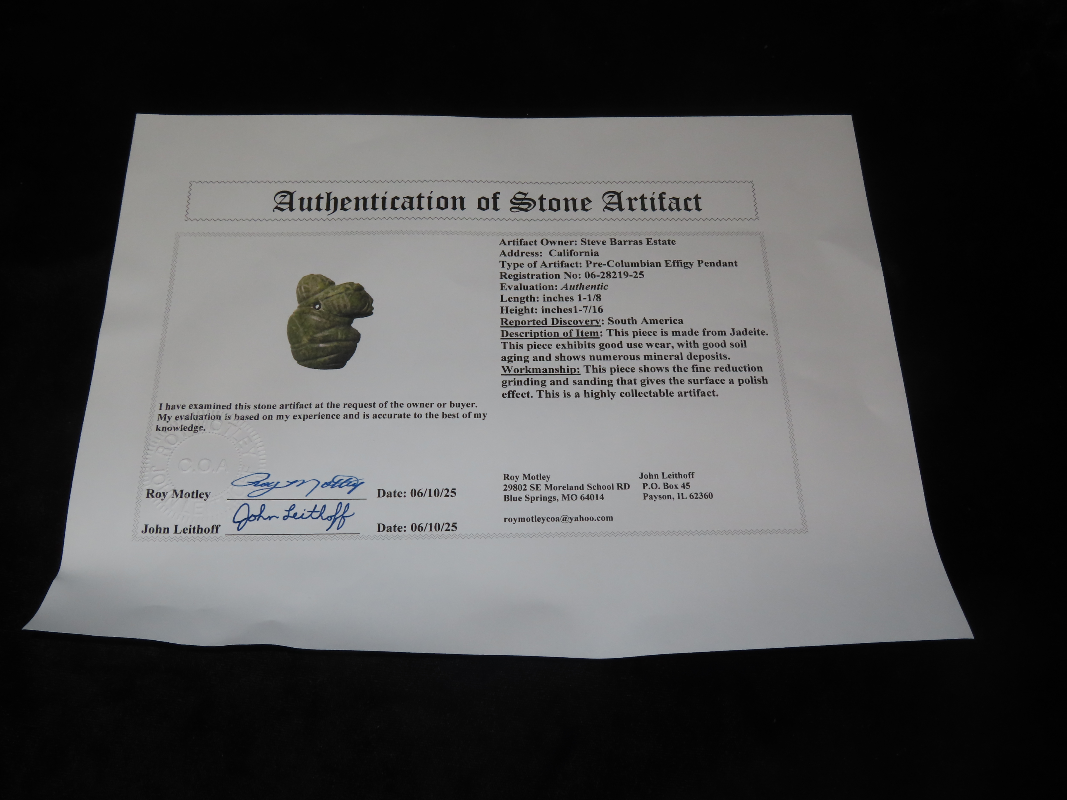 1 1/8″ Pre-Columbian Effigy Pendant, Motley COA, South America