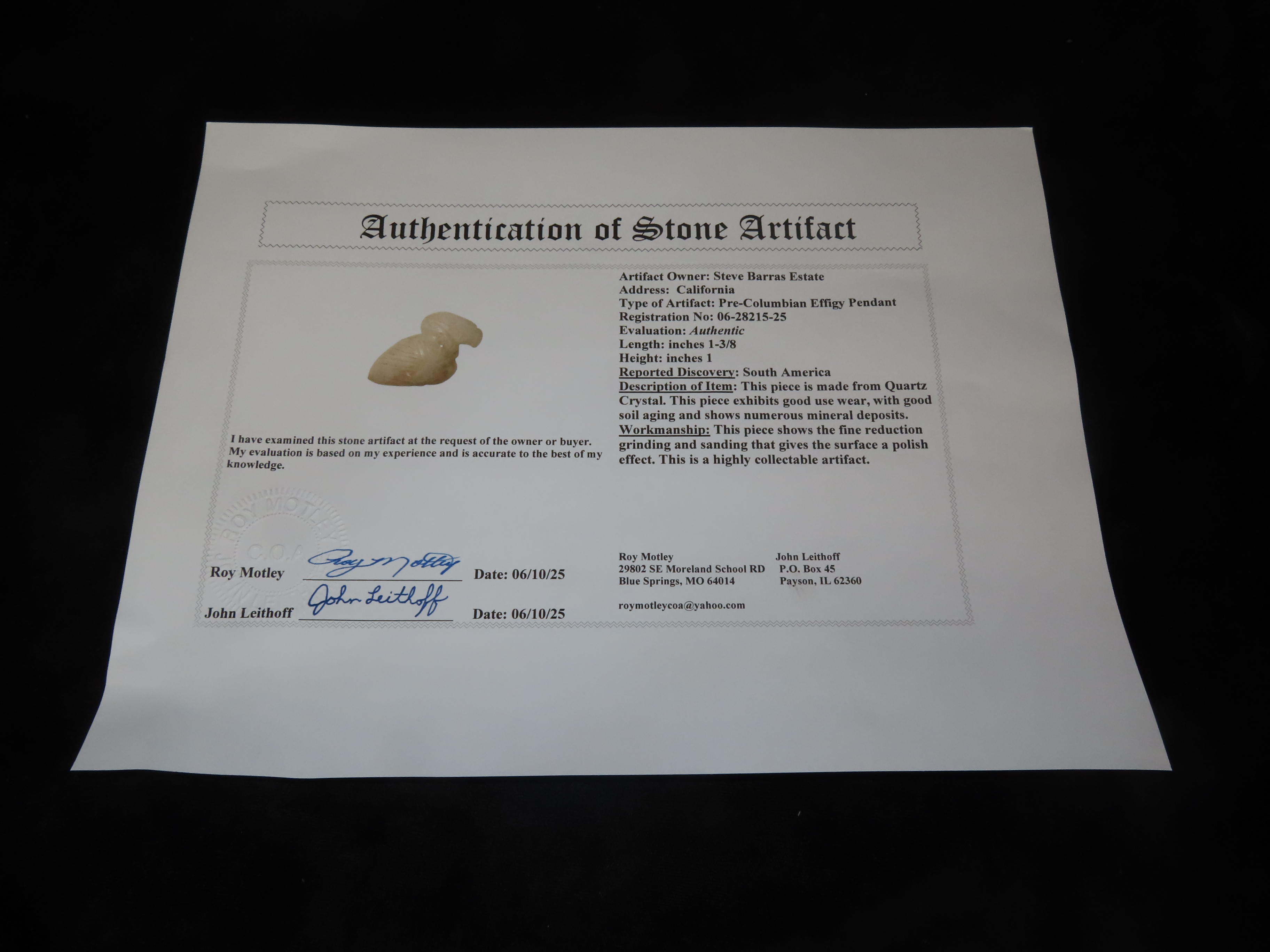 1 3/8″ Pre-Columbian Effigy Pendant, Motley COA, South America