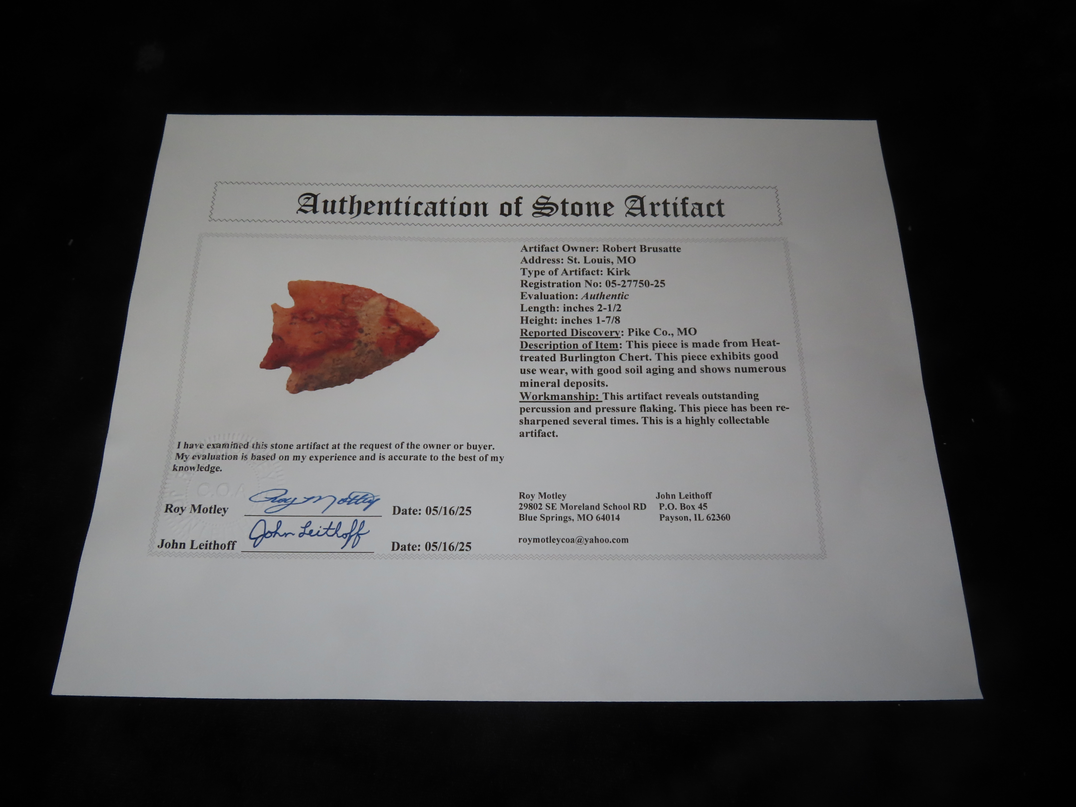 2 1/2″ Kirk, Motley COA, Pike Co., found in Pike Co., Missouri, Ex Robert Brusatte Collection