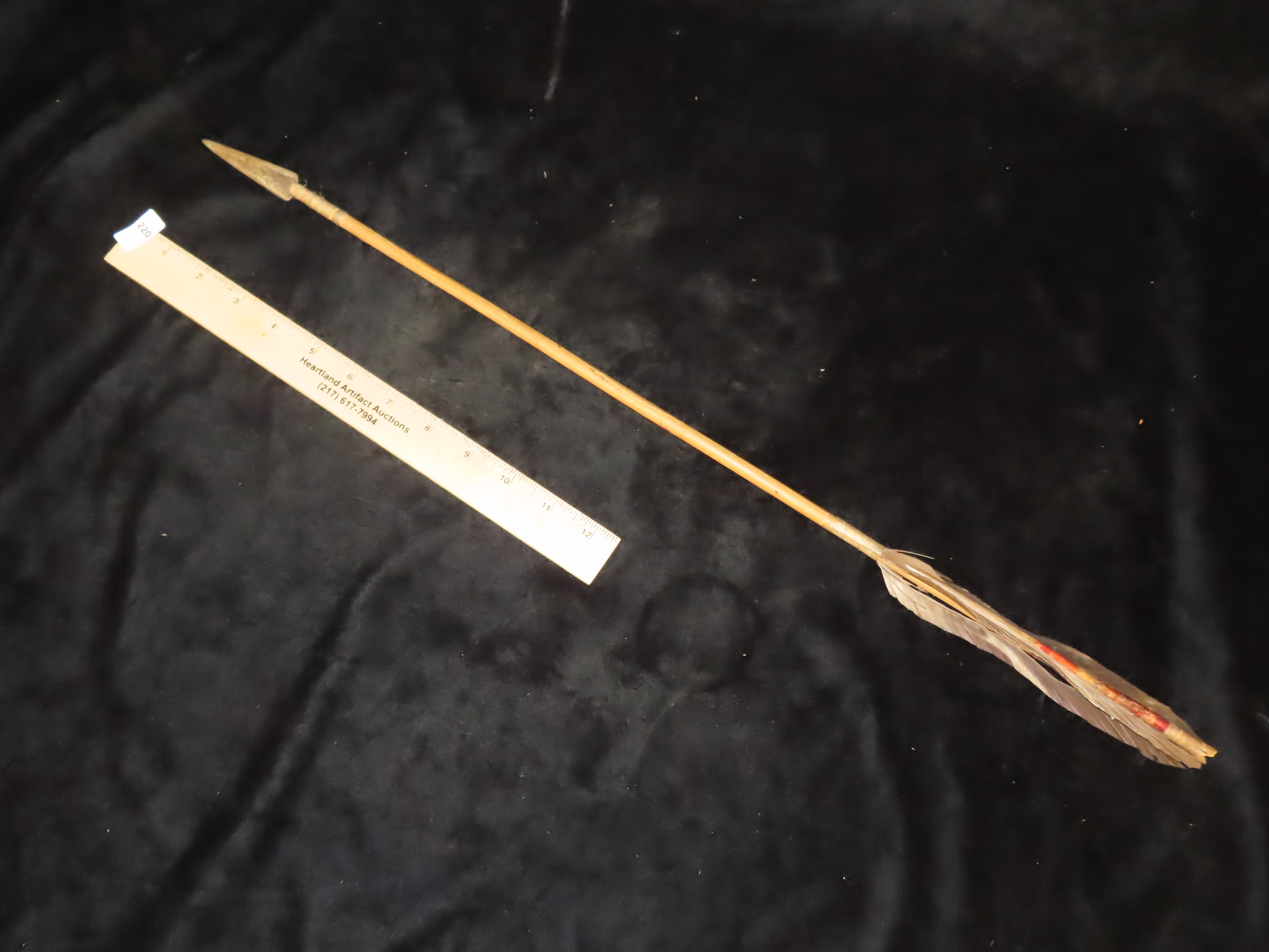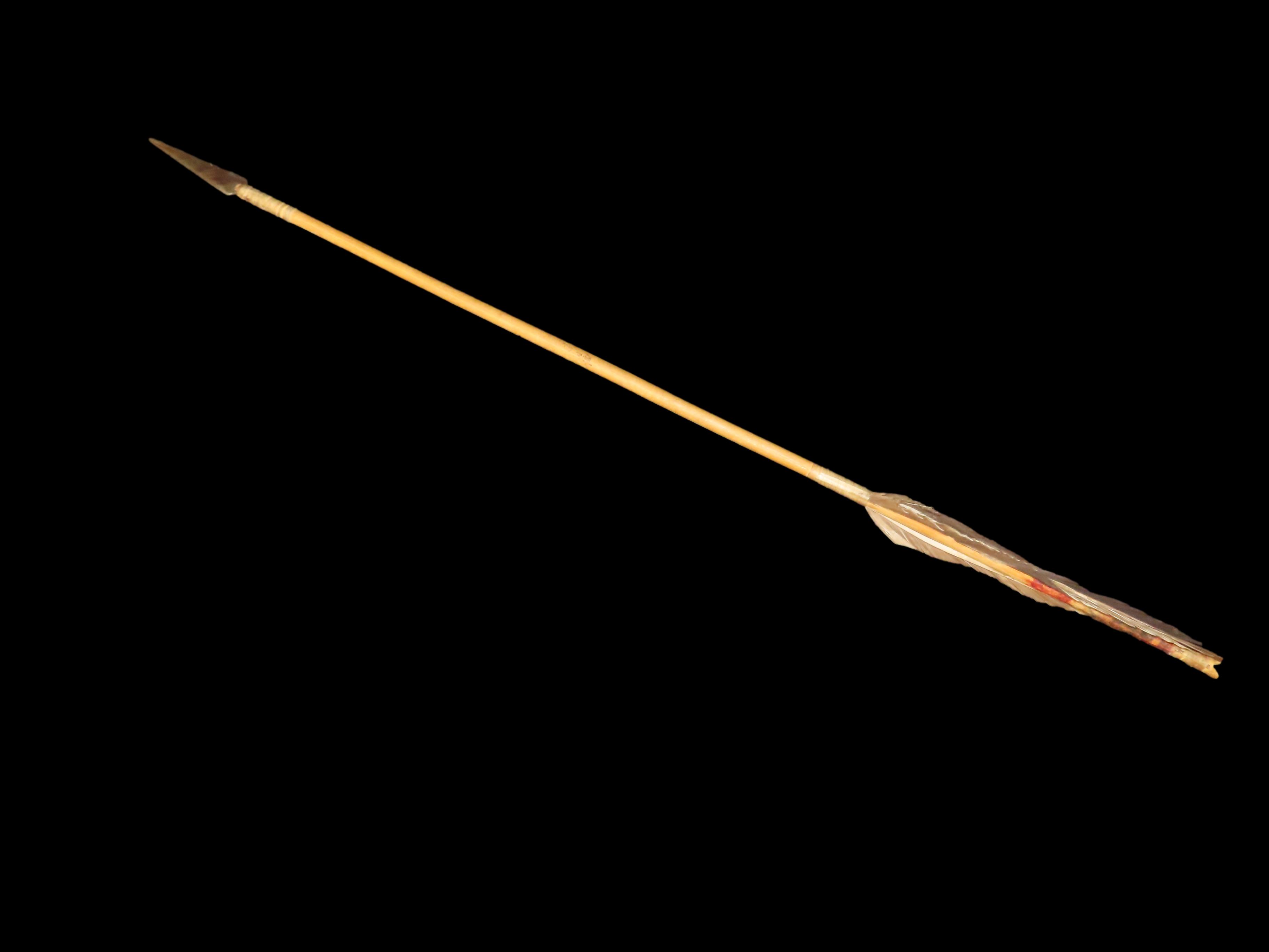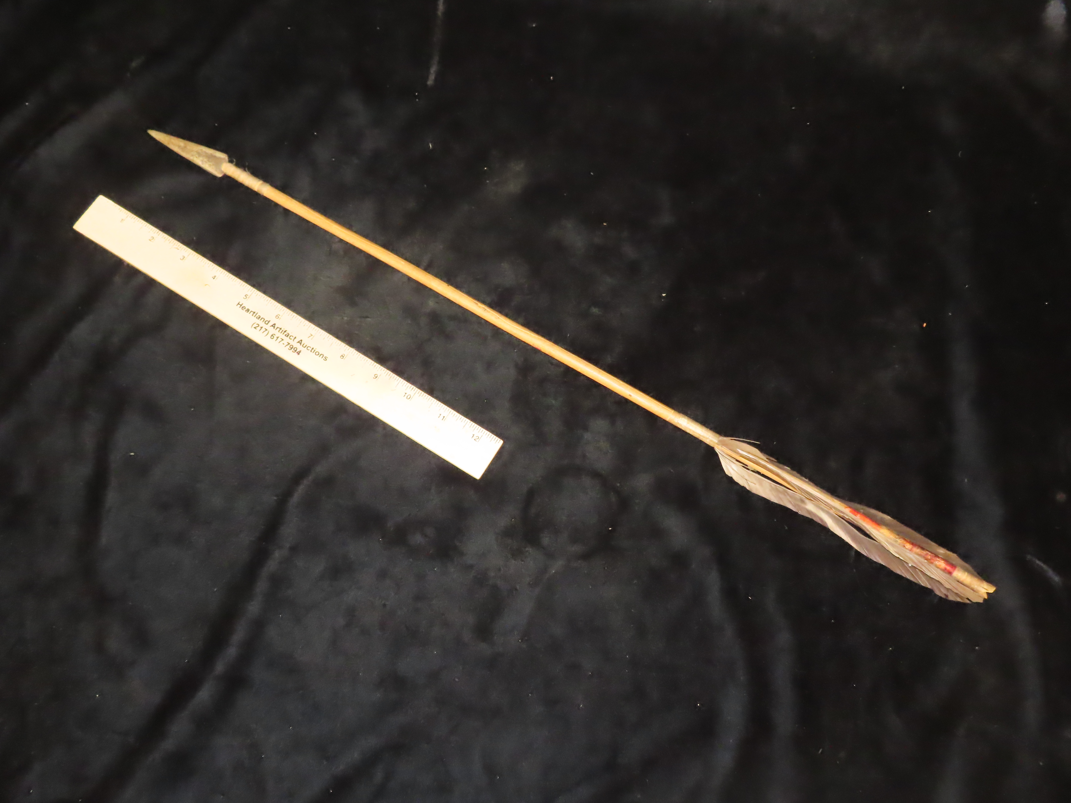 24 5/8″ Authentic Comanche Arrow, c 1860-1880, Sinew wrapped, Fletched w/painting under fletching, with sinew wrapping and metal trade point, Ex John Welsch, Ex Scott Carruthers Collections