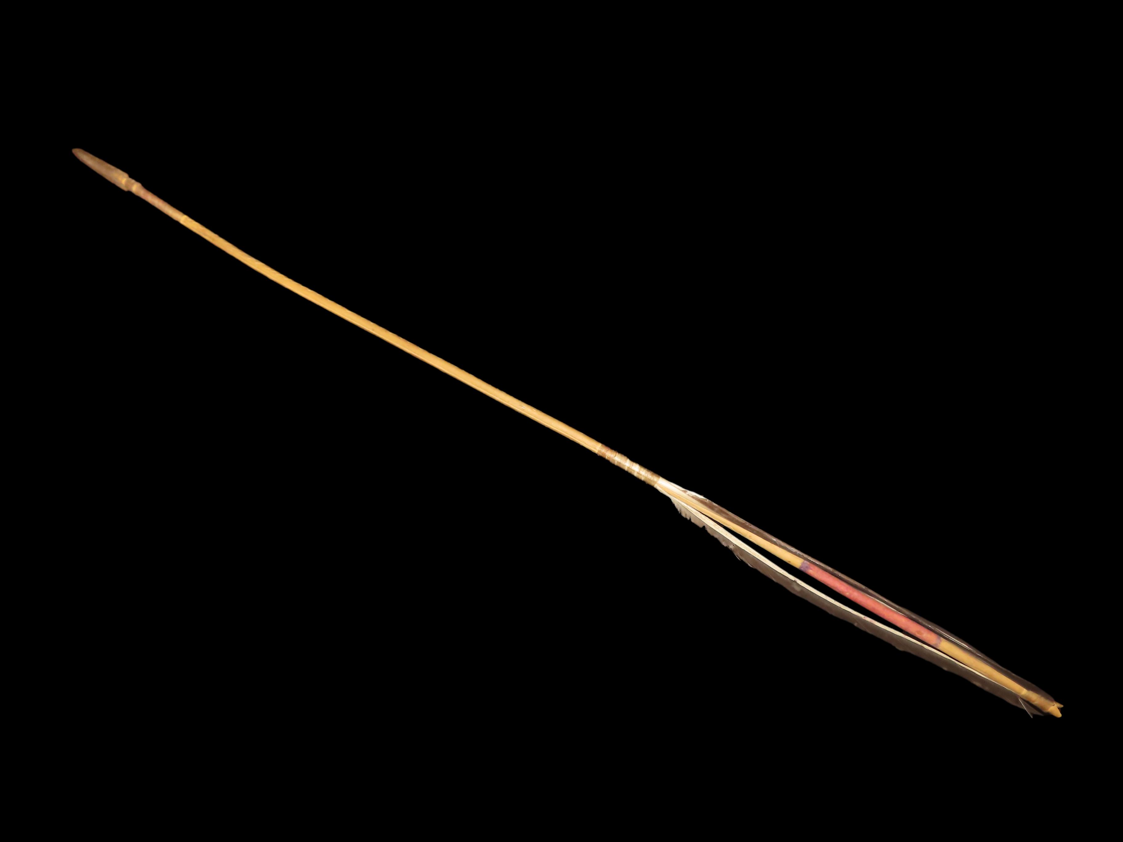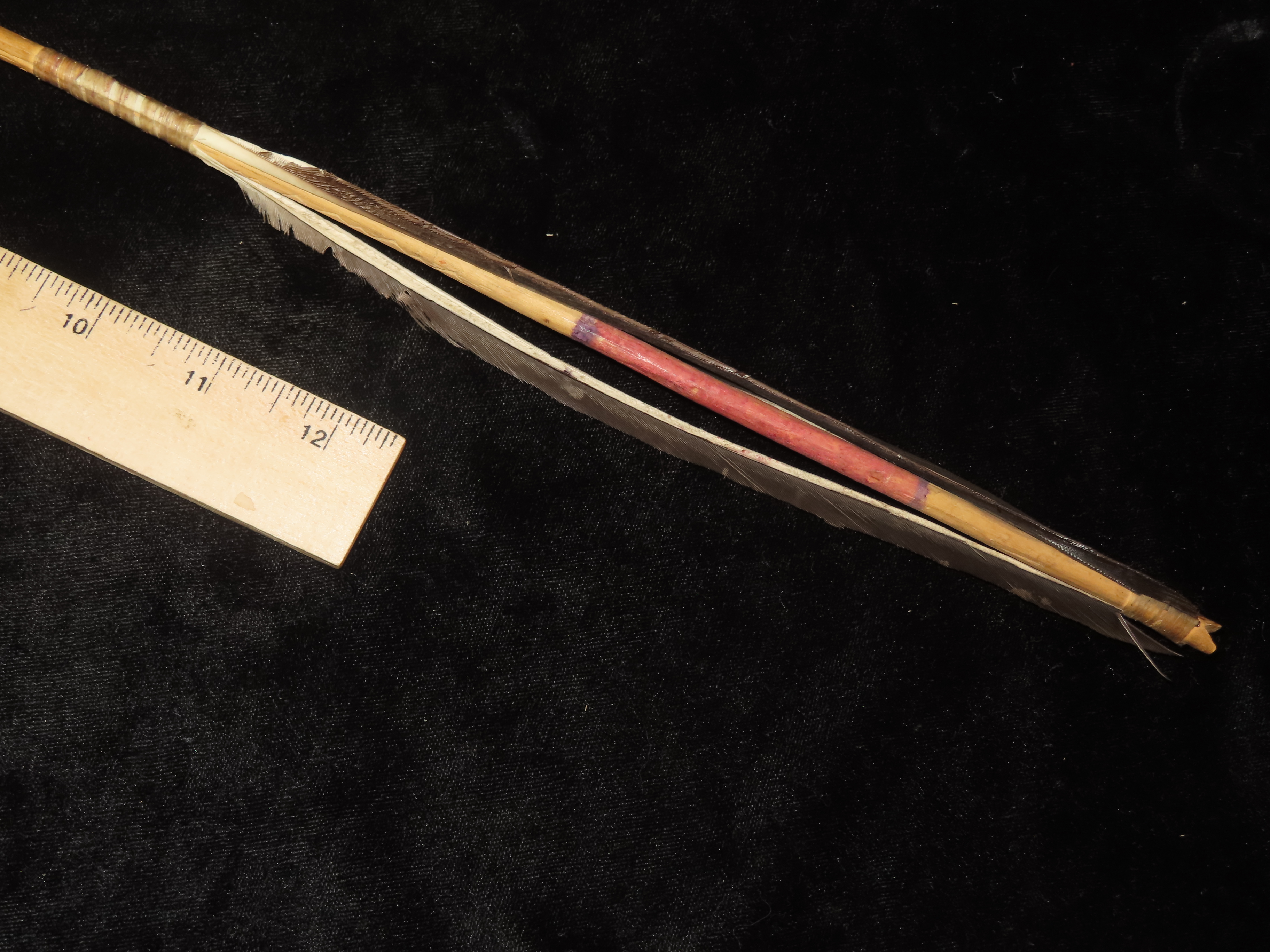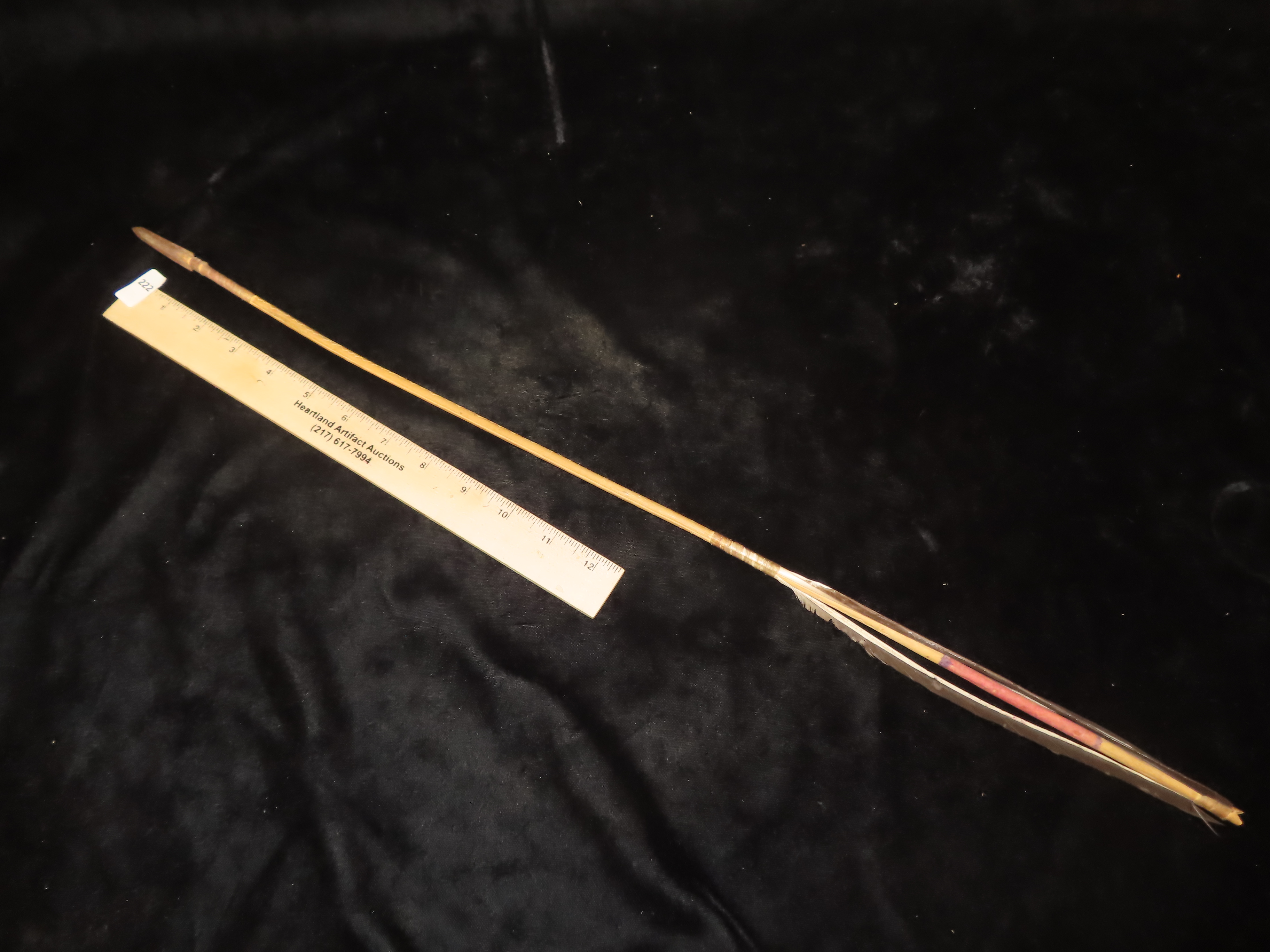 24 1/2″ Authentic Sioux Arrow, c 1850-1870, Fletched, painted red & blue, Sinew wrapped with trade metal tip, Ex John Welsch, Ex Scott Carruthers Collections