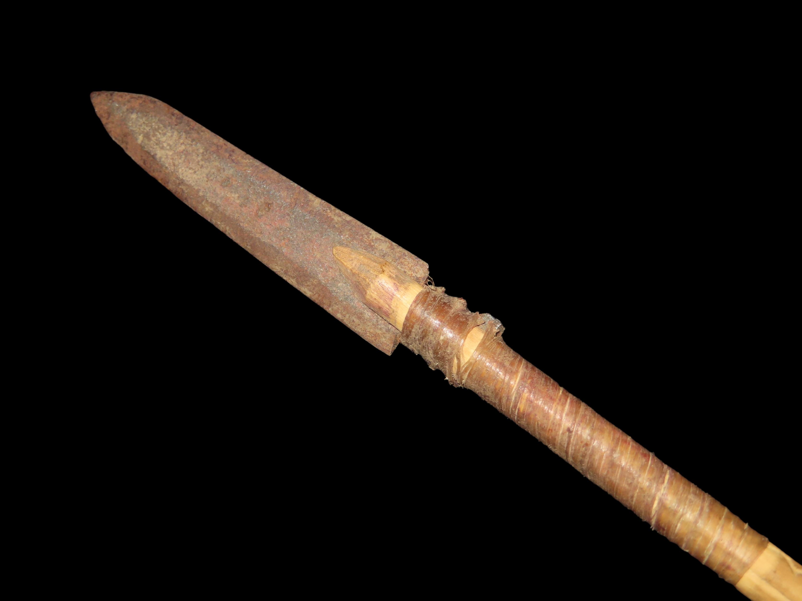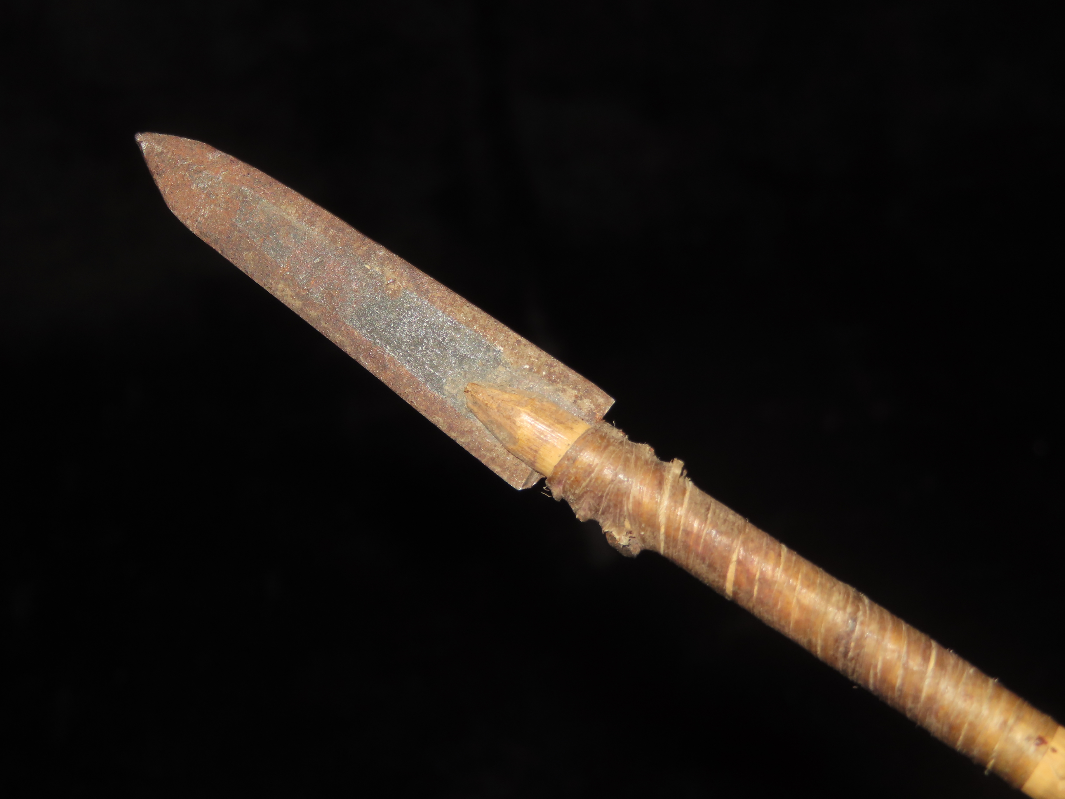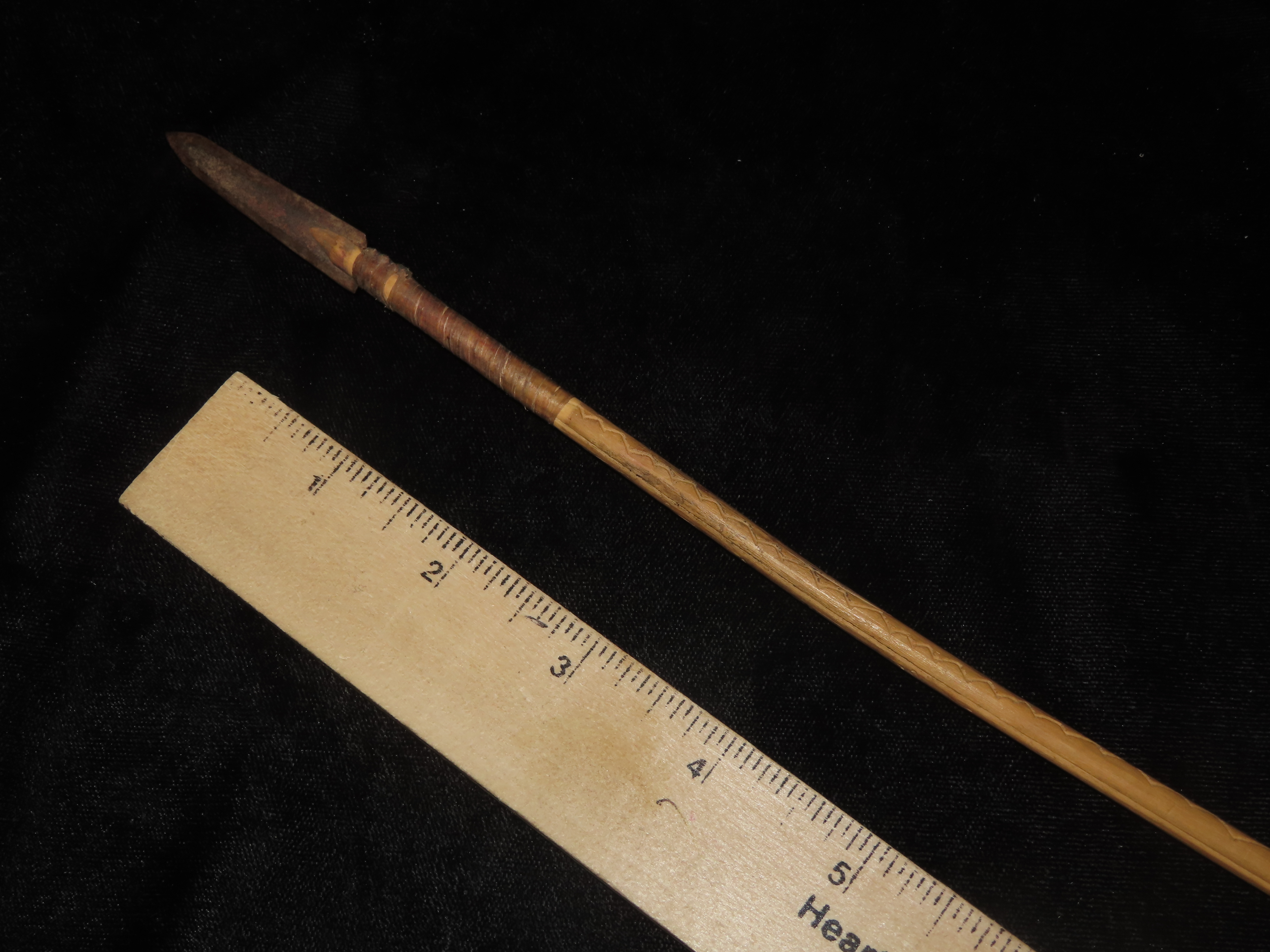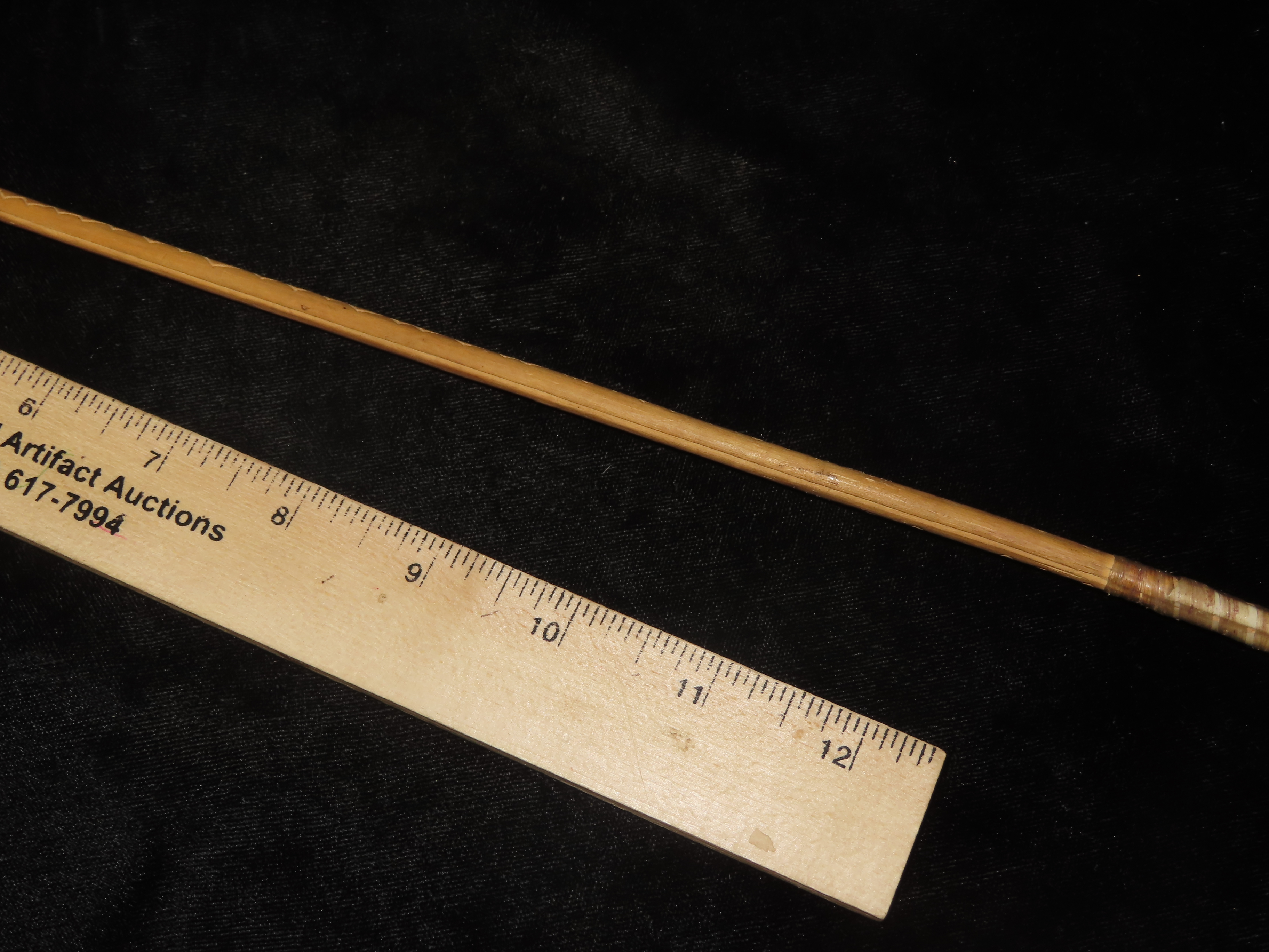 24 1/2″ Authentic Sioux Arrow, c 1850-1870, Fletched, painted red & blue, Sinew wrapped with trade metal tip, Ex John Welsch, Ex Scott Carruthers Collections