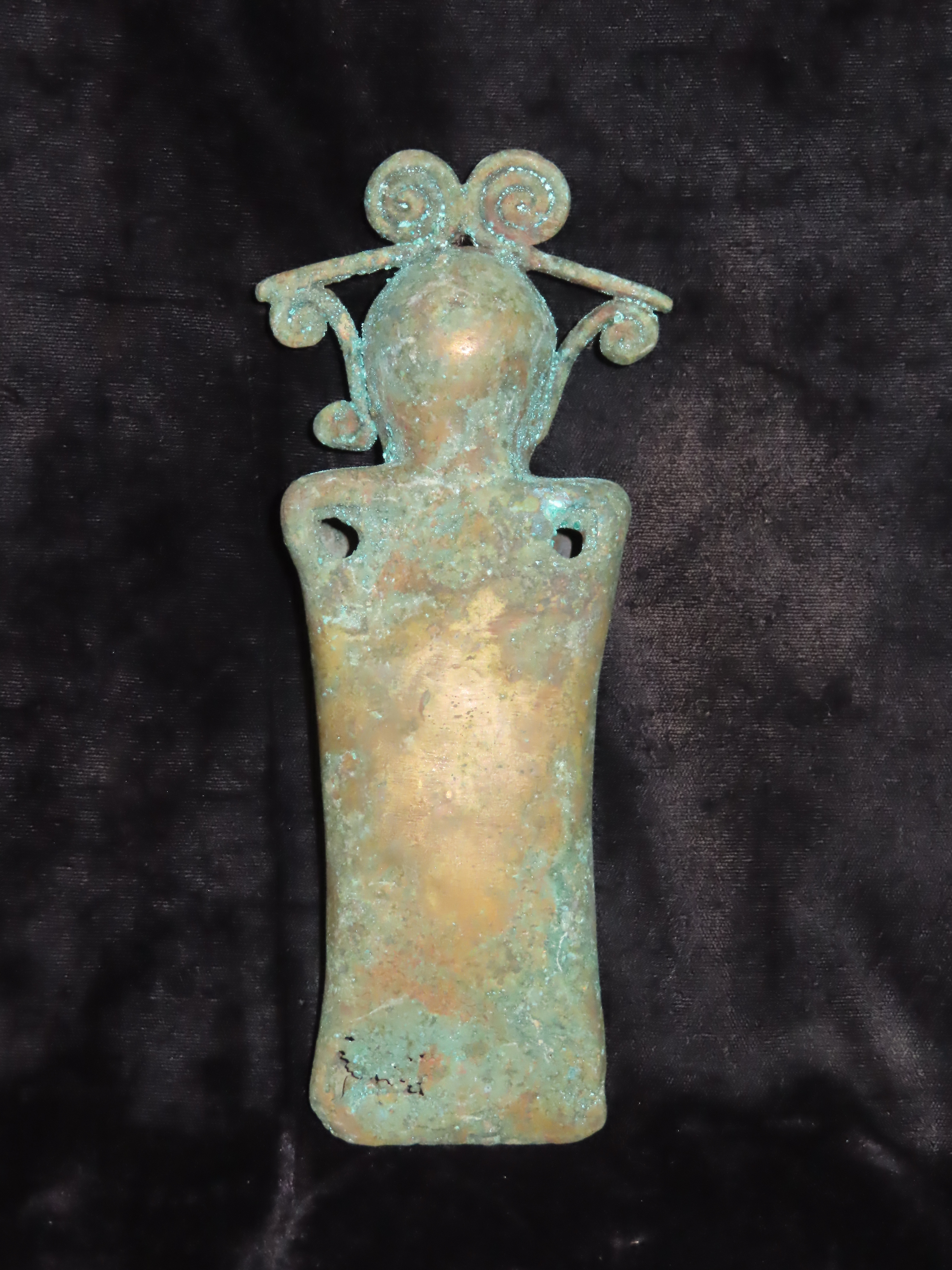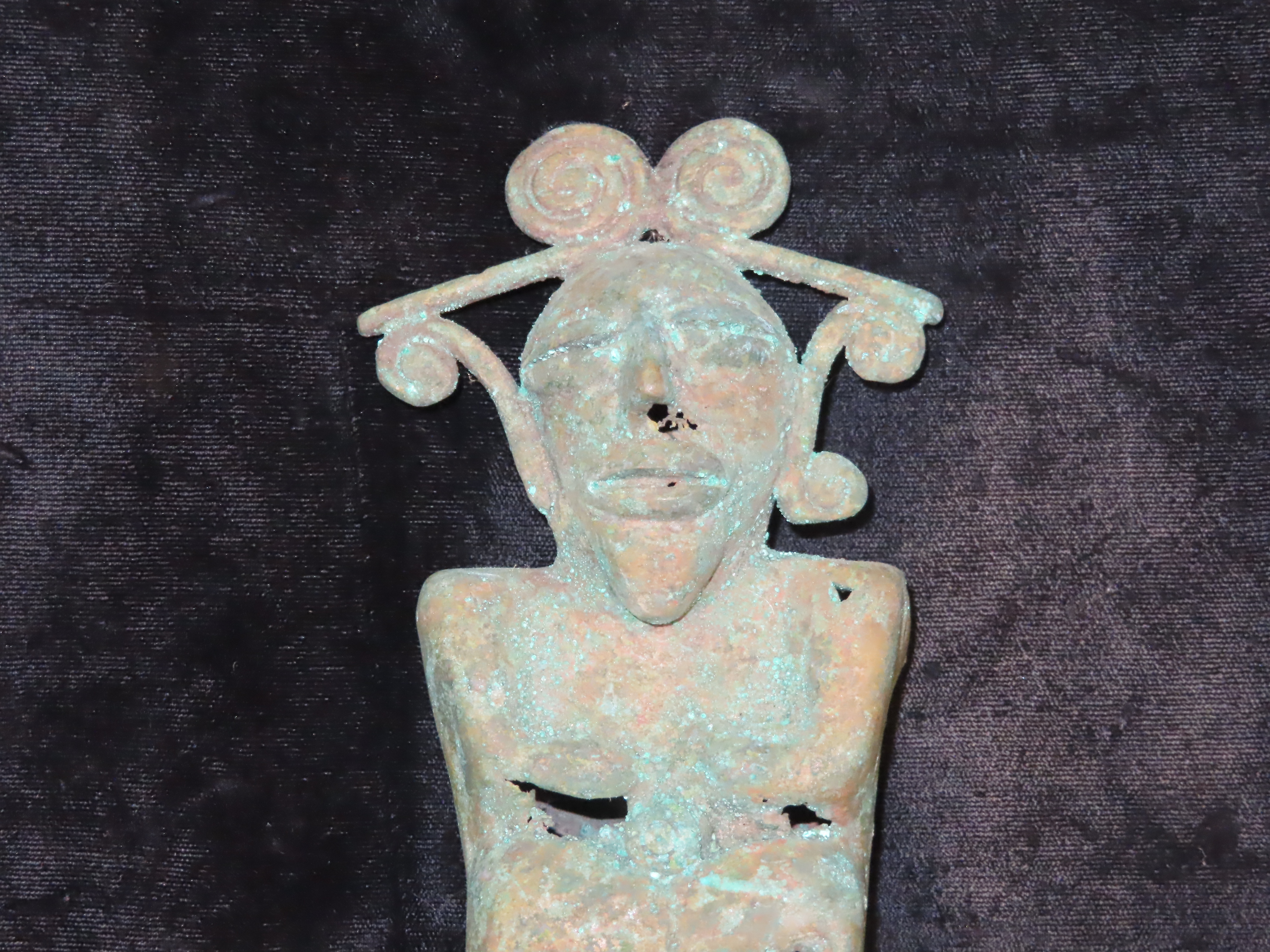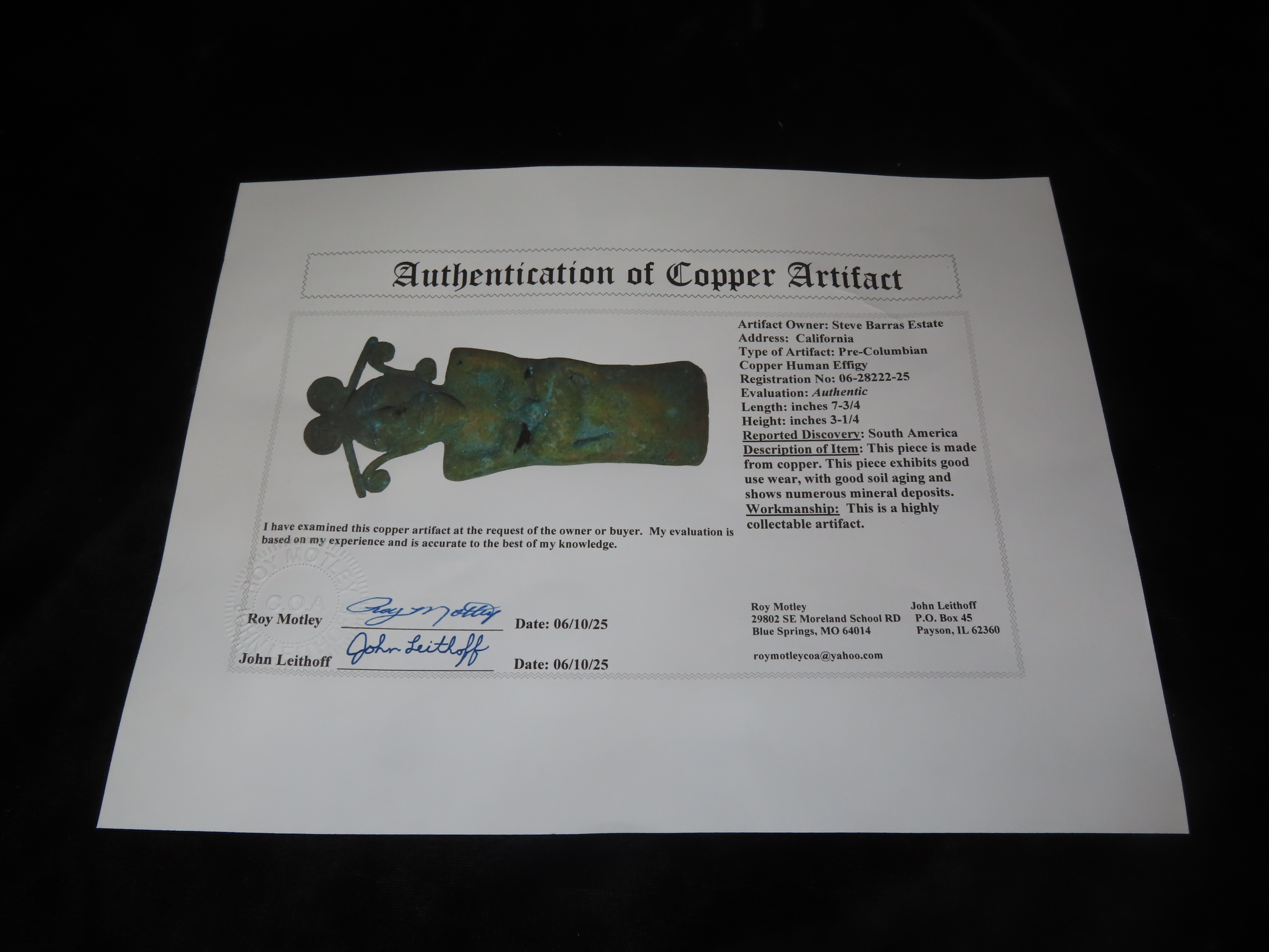 7 3/4″ Pre-Columbian Copper Human Effigy, Motley COA, South America, Ex Steve Barras Estate