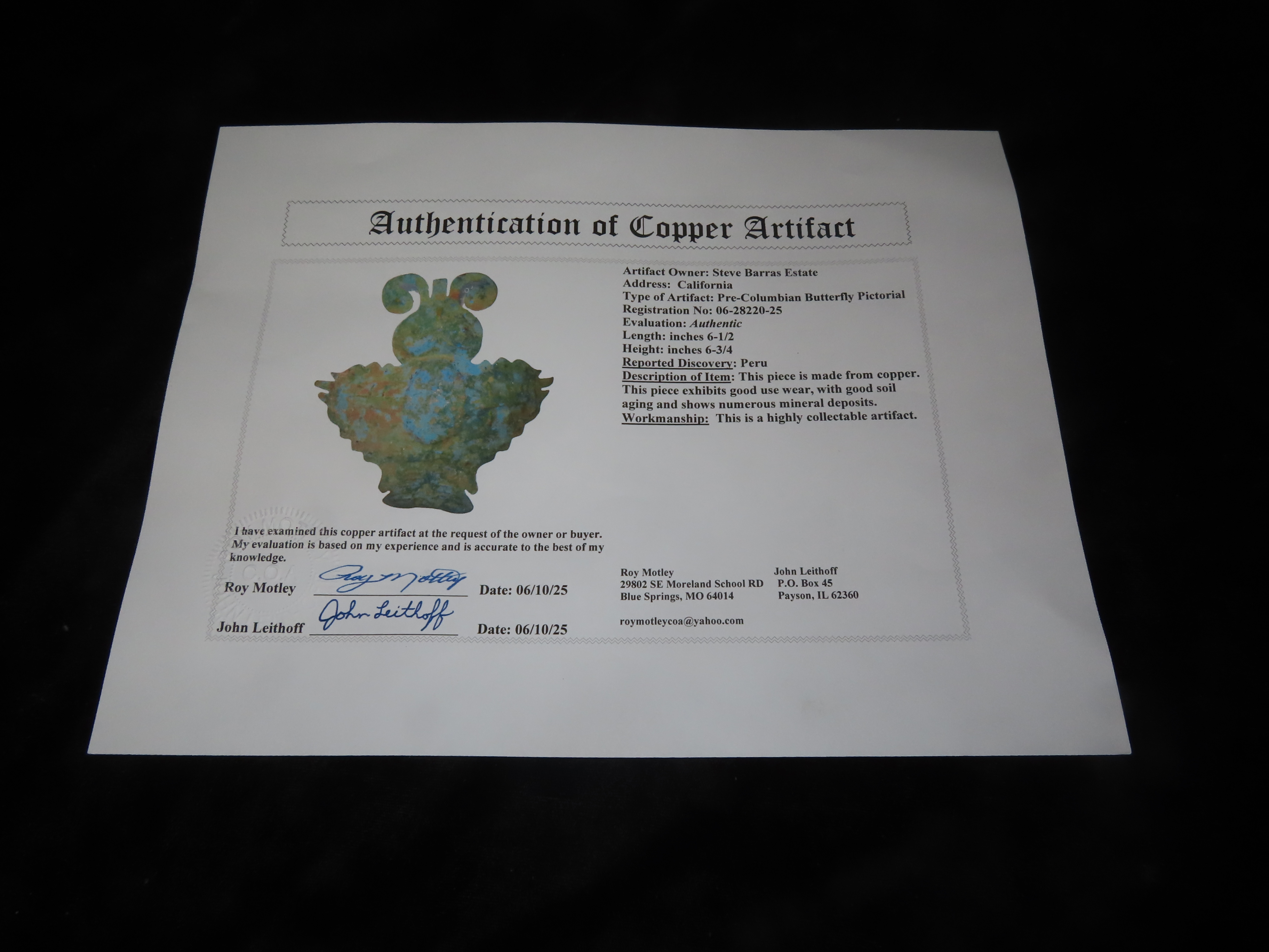 6 3/4″ Copper Pre-Columbian Butterfly Pictorial, Motley COA, Peru, Ex Steve Barras Estate