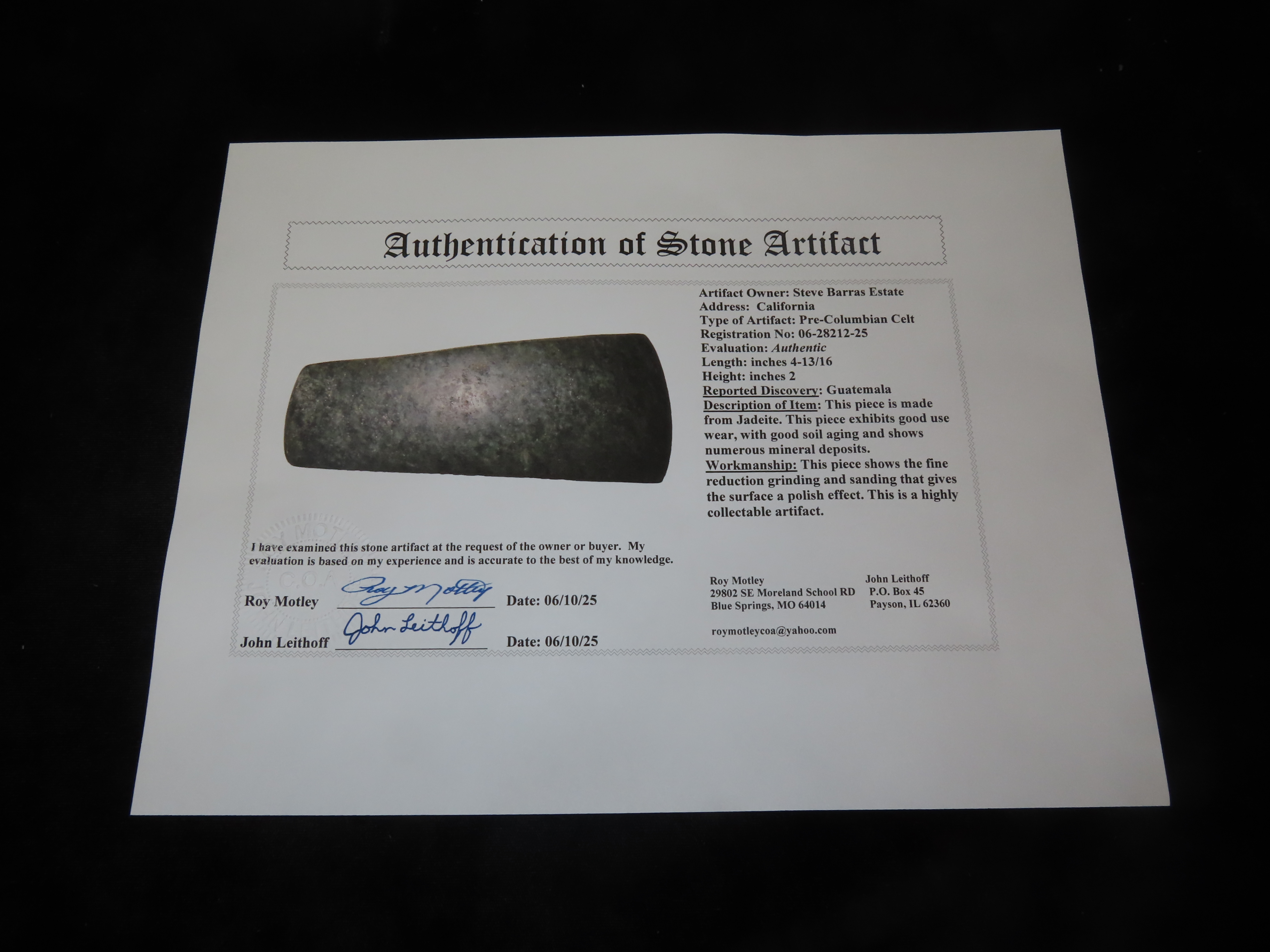 4 13/16″ Jadeite Pre-Columbian Celt, Motley COA, Guatemala, Ex Steve Barras Estate