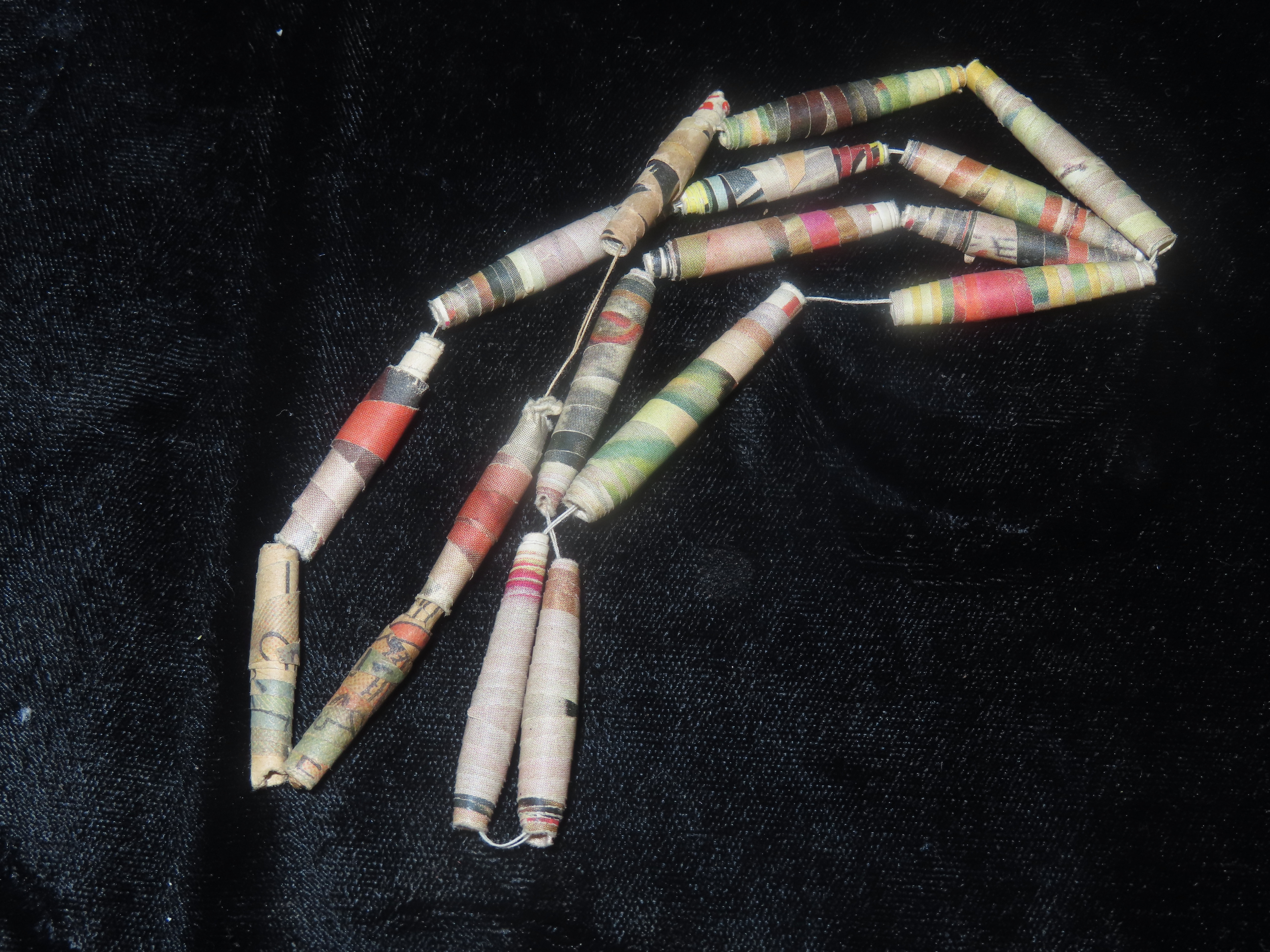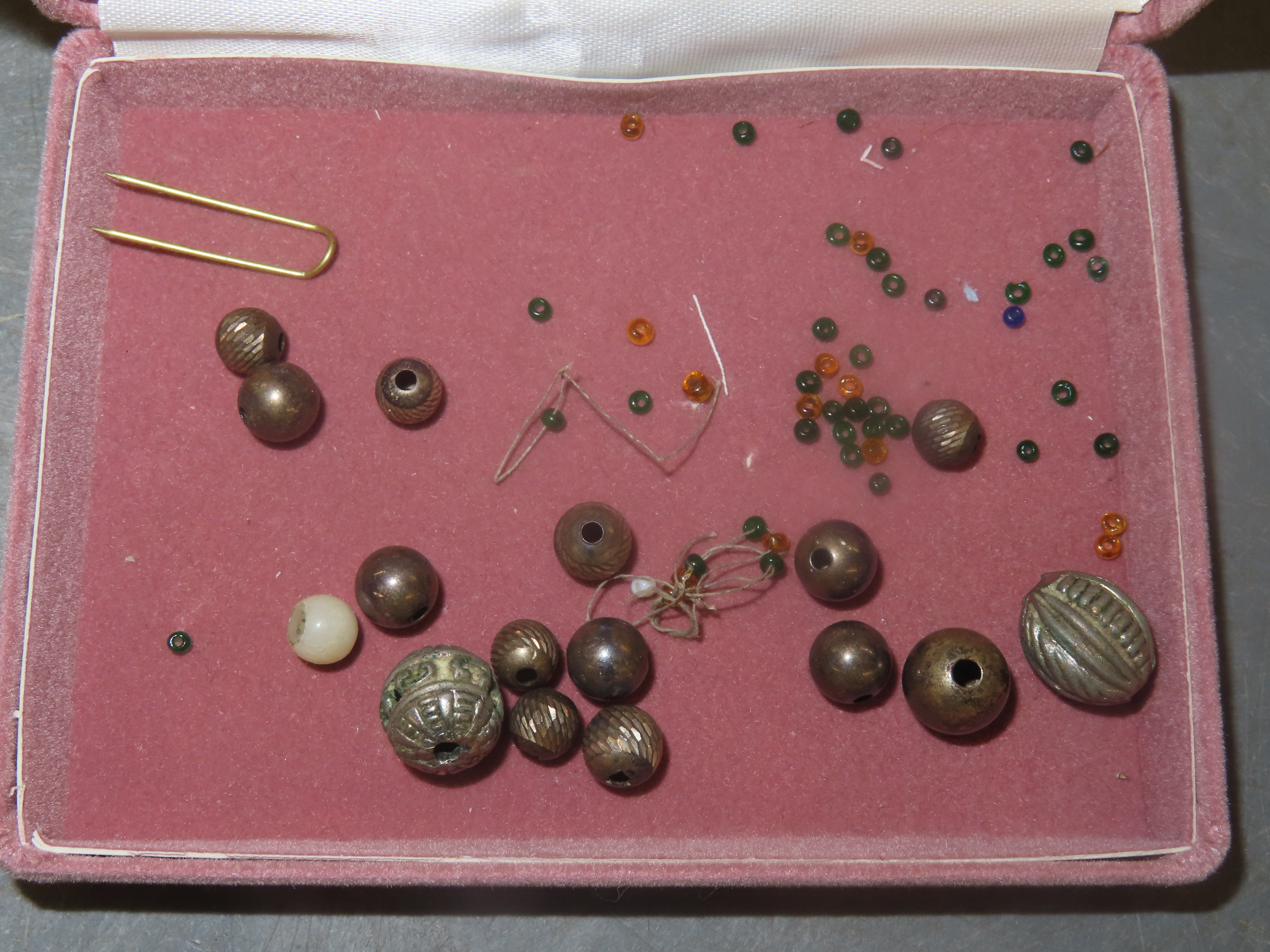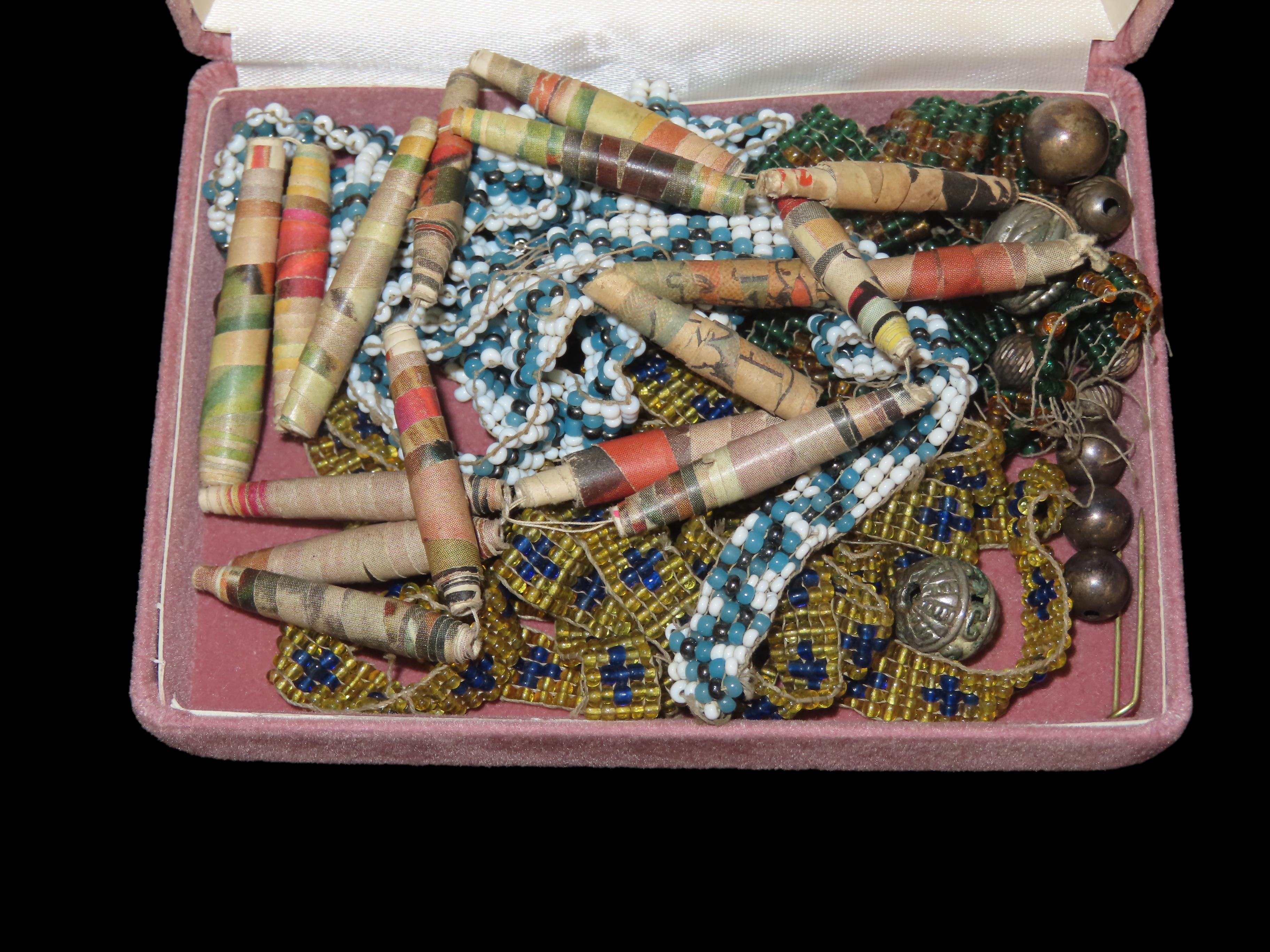 Small Jewelry Box Containing strand of Paper Beads, and Hand Beaded trim pcs, and several metal(maybe sterling silver?) beads